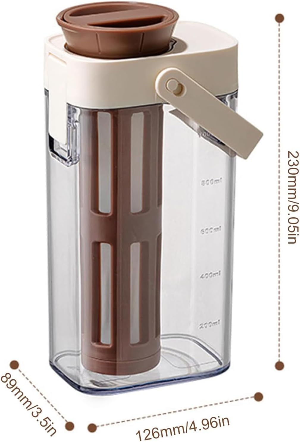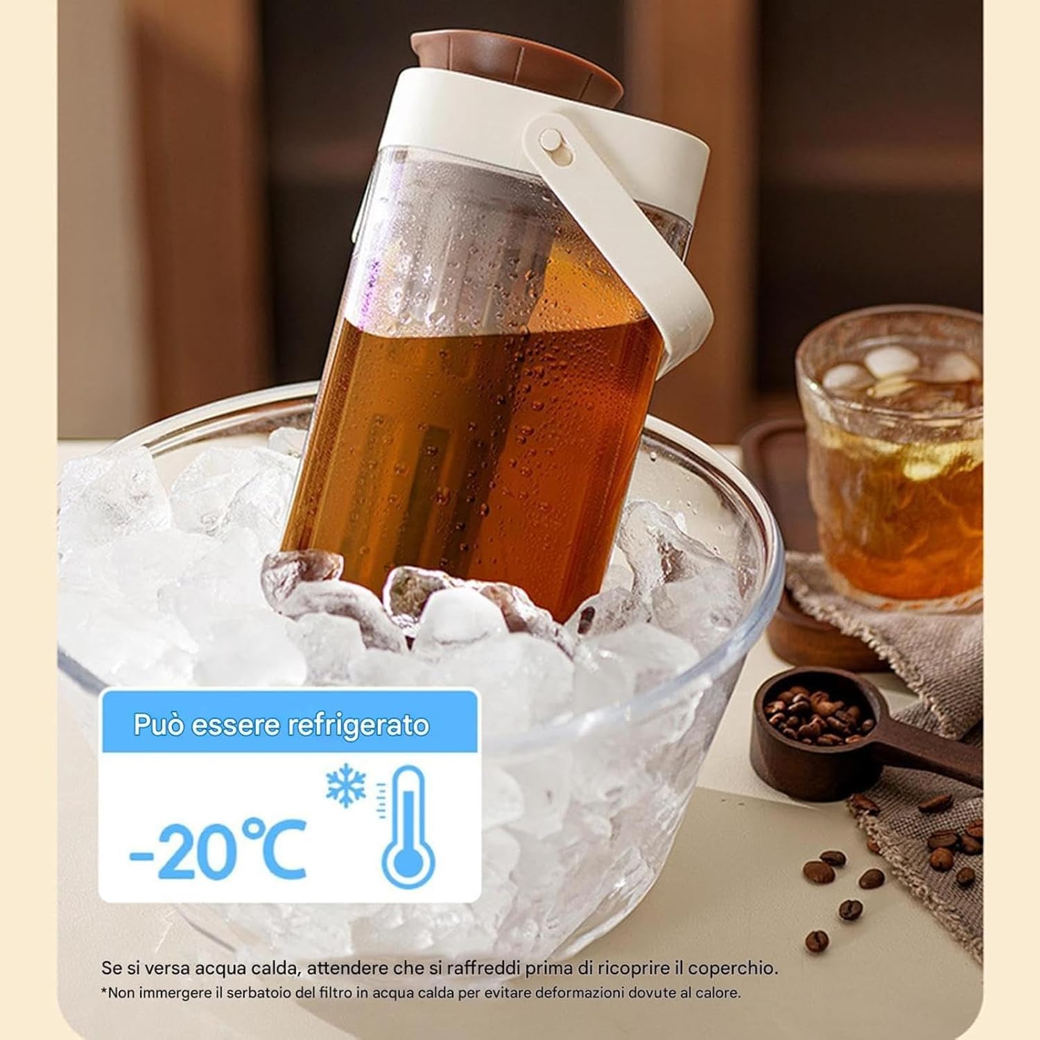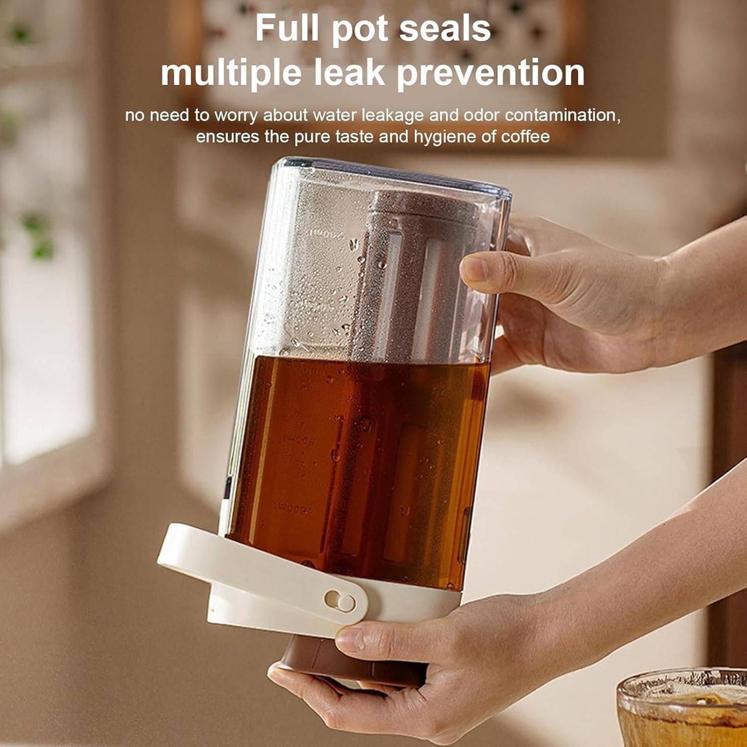 1. Design multifunzionale: questa macchina per il caffè freddo non solo può preparare caffè freddo, ma può anche essere utilizzata come frullatore per il tè, il che significa che puoi preparare due bevande diverse nello stesso dispositivo senza acquistare attrezzature aggiuntive 2. Design della maniglia: questa macchina per il caffè freddo è dotata di una maniglia, che è comoda per raccogliere e versare facilmente il caffè. Questo design intuitivo è comodo da usare per gli utenti senza preoccuparsi di schizzi o scivolamenti 3. Materiale ABS: questa caffettiera a freddo è realizzata in materiale ABS, che non solo è accettabile ma anche facile da pulire. Rispetto a molti altri materiali, l'ABS è un materiale più resistente e pratico, pur non alterando il gusto del caffè o del tè. 4. Segni di spunta: questa macchina per il caffè freddo è dotata di segni di spunta che ti aiutano a controllare con precisione il rapporto tra acqua e chicchi di caffè per ottenere il caffè o il tè freddo perfetto. Questo è essenziale per garantire consistenza e gusto perfetto 5. Grande capacità: questa caffettiera a freddo ha una capacità di 1 litro, adatta per uso familiare e collettivo, senza ripetute erogazioni. Ciò lo rende ideale per piccole riunioni o mattine che richiedono più tazze di caffè.