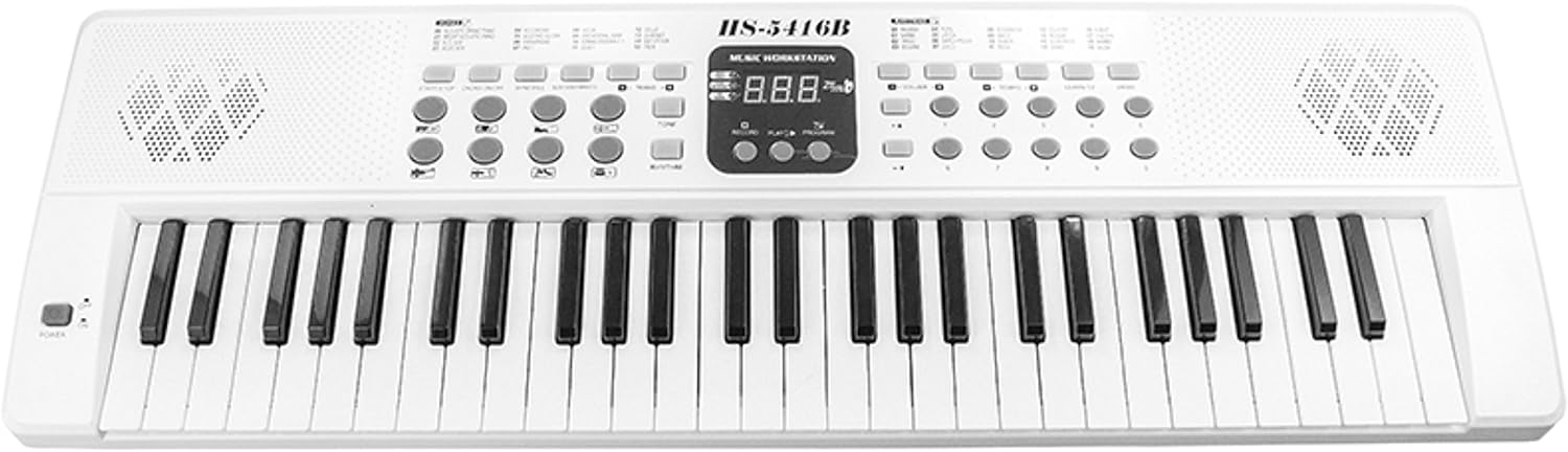 Il Pacchetto Comprende: * tastiera * Caricabatterie * Microfono Dati tecnici HS-5416B: * 54 chiavi * 2 altoparlanti stereo * display * 8 suoni di percussioni * microfono * Ingresso USB * Funzione di registrazione e riproduzione * Controllare il ritmo della musica di sottofondo * Chord (divisione della tastiera) * Musica 99 di sfondo * 15 tipi di suono * Effetto e sostenere vibrato * Funktion Learning * Demo * La possibilit? di potere attraverso la Caricabatterie o 6 x AA 1,5 batterie * Recess presso lo stand Le dimensioni della tastiera: * Lunghezza: 69,5 cm * Larghezza: 22 cm * La larghezza della tastiera: 60 cm * La lunghezza del tasto bianco: 10 cm * Pulsante bianco Larghezza: 1,5 cm * La lunghezza della chiave nera: 6 cm * Pulsante nero Larghezza: 0,9 cm