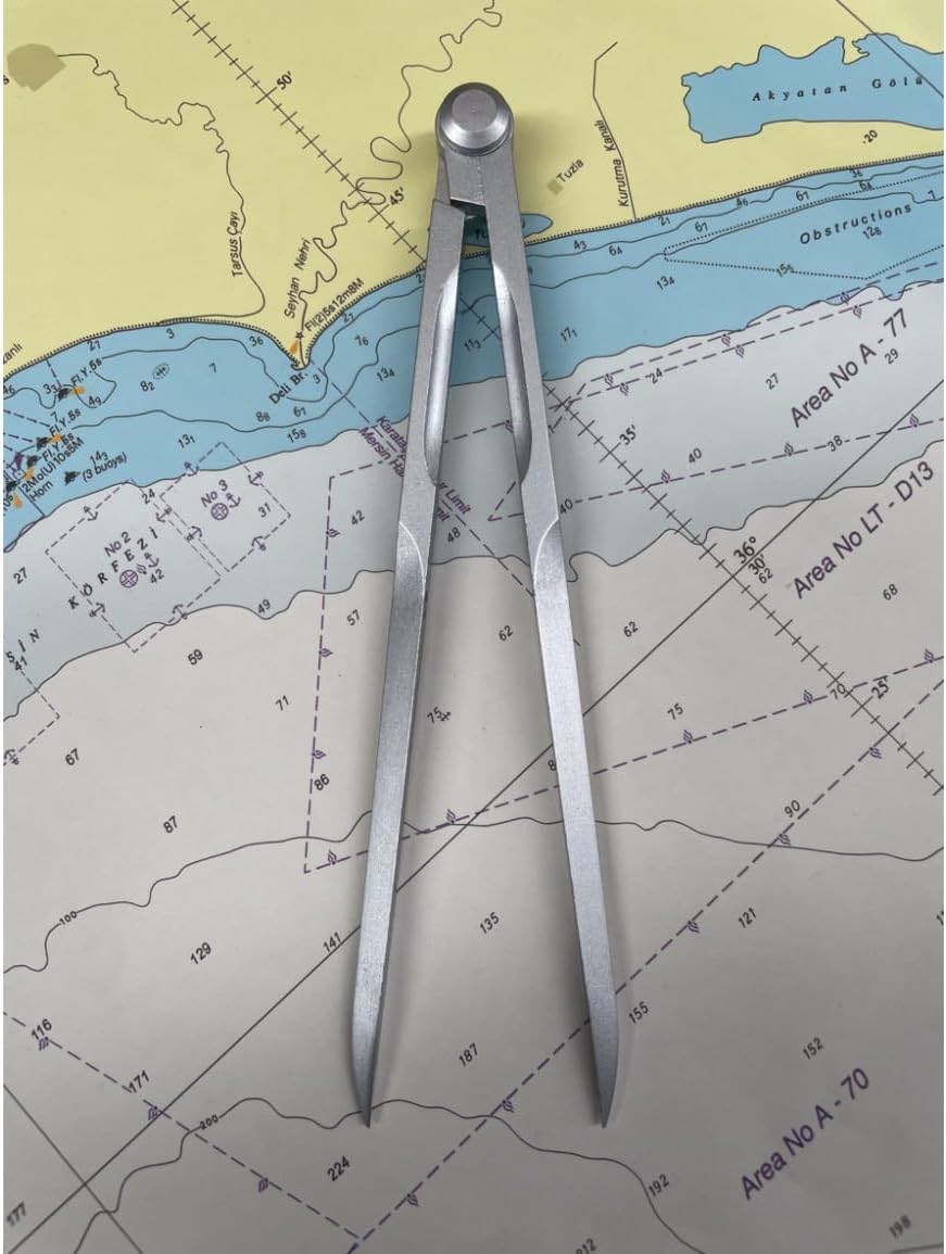 Strumento di precisione utilizzato principalmente per la navigazione marittima, in particolare nella tracciatura delle rotte sulle carte nautiche Elegante e professionale, grazie alla finitura cromata brillante. Spesso apprezzato anche come oggetto da collezione o da esposizione Le punte sono sottili e appuntite, pensate per tracciare distanze con accuratezza sulla carta
