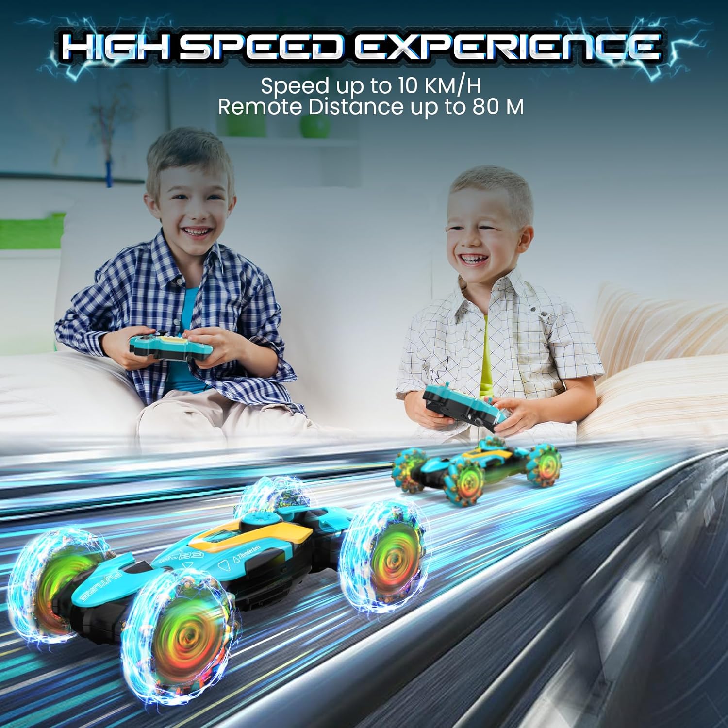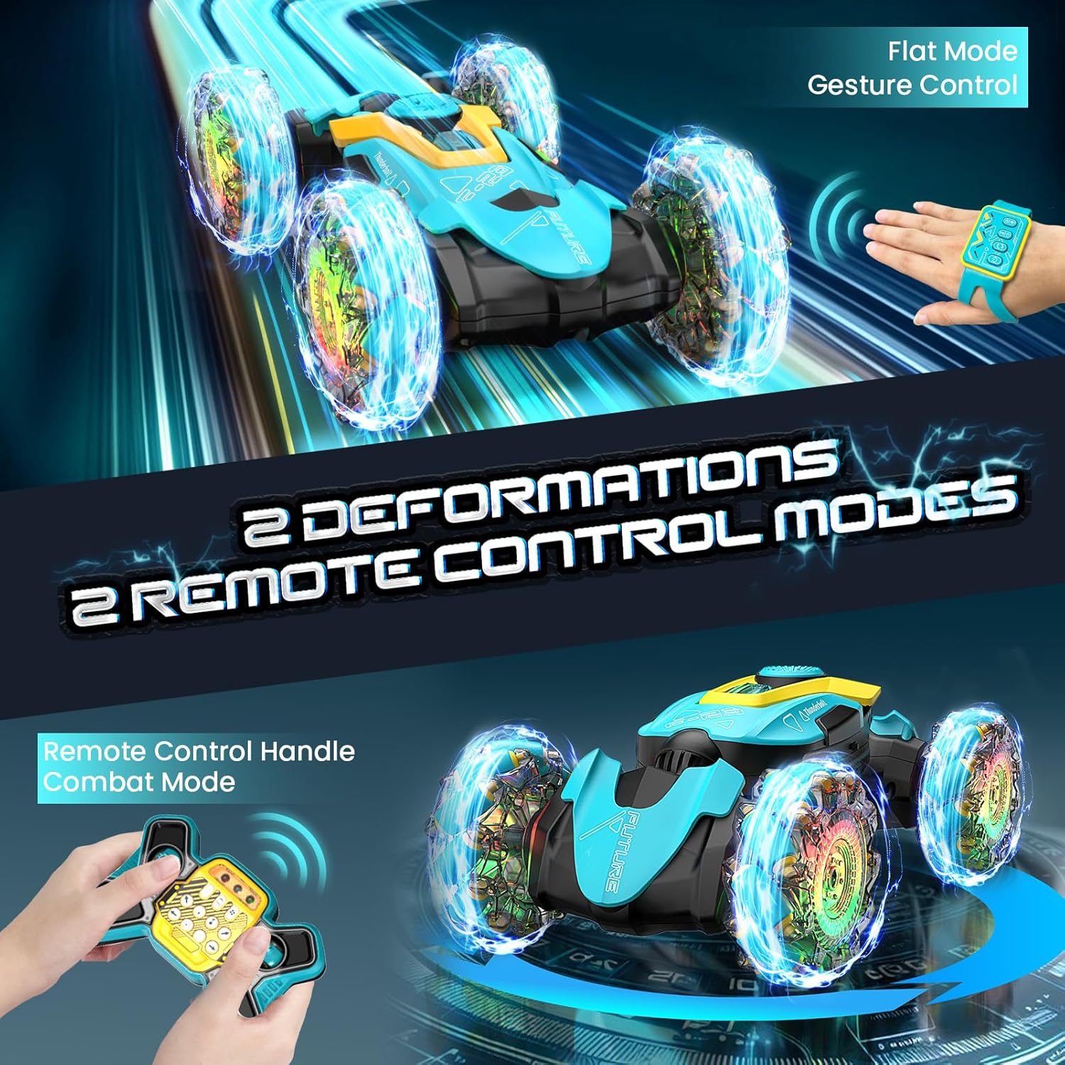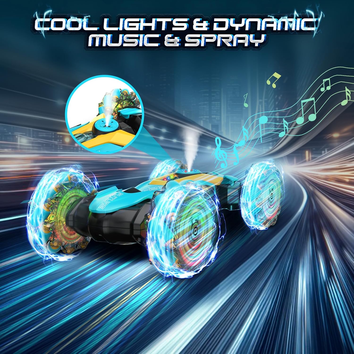 Fantistic RC Stunt Car: l'auto acrobatica per bambini adotta un sistema di controllo remoto a 2,4 GHz, per una lunga distanza di controllo oltre i 20 m. Può muoversi facilmente in tutte le direzioni. Caratteristiche di arrampicata, torsione, avanzamento in avanti e indietro, rotazione a 360 gradi e ribaltamenti a doppio lato a 180 gradi. L'auto acrobatica RC può spruzzare, il che porta più divertimento per i bambini. Telecomando da 2,4 GHz e 2 modi di controllo: il telecomando da 2,4 GHz può anti-interferenza. I bambini secondari possono controllare diverse auto telecomandate contemporaneamente senza interferenze e possono guidare e ruotare l'auto giocattolo dal telecomando della maniglia o dal controller dell'orologio come vogliono. Permettono ai bambini di divertirsi a giocare con l'auto acrobatica più felice. Auto con telecomando resistente e sicuro: la fantastica auto acrobatica è realizzata con plastica ABS resistente di alta qualità e verniciatura a spruzzo. Con pneumatici in gomma morbida ed elastica di alta qualità, assorbimento degli urti, presa estremamente forte, resistenza allo scivolamento, non teme la strada scivolosa, consentendo all'auto di guidare su diversi terreni a proprio agio. Luci colorate per pneumatici e musica dinamica: il corpo dell'auto con telecomando ha luci LED luminose e colorate. Le luci a LED possono illuminare 4 pneumatici trasparenti. Quando l'auto RC è alla guida, le luci a LED si accenderanno e la musica arriva, il che porterà più divertimento ai bambini con i loro amici. Ameranno questo gadget. Raffreddare il design del pneumatico esplosione e le luci lo renderanno più attraente e interessante. Auto RC ricaricabili per bambini: include 2 batterie ricaricabili per auto giocattolo fornite con la confezione. Ogni capacità della batteria dell'auto giocattolo telecomandata è di 500 mAh, supporta 25 minuti continuando a giocare ogni batteria, per un totale di 50 minuti di gioco. Può essere completamente caricato in 2 ore.