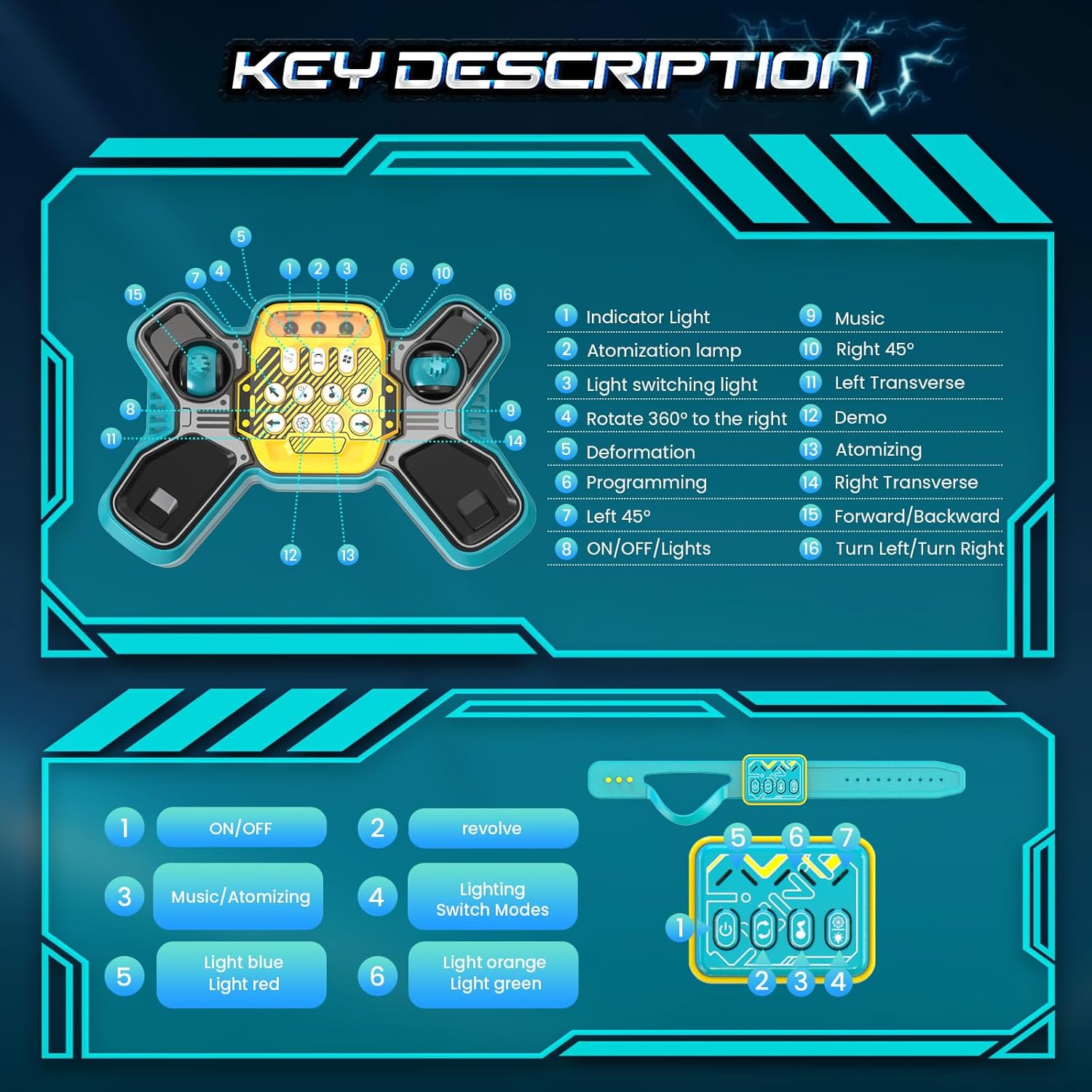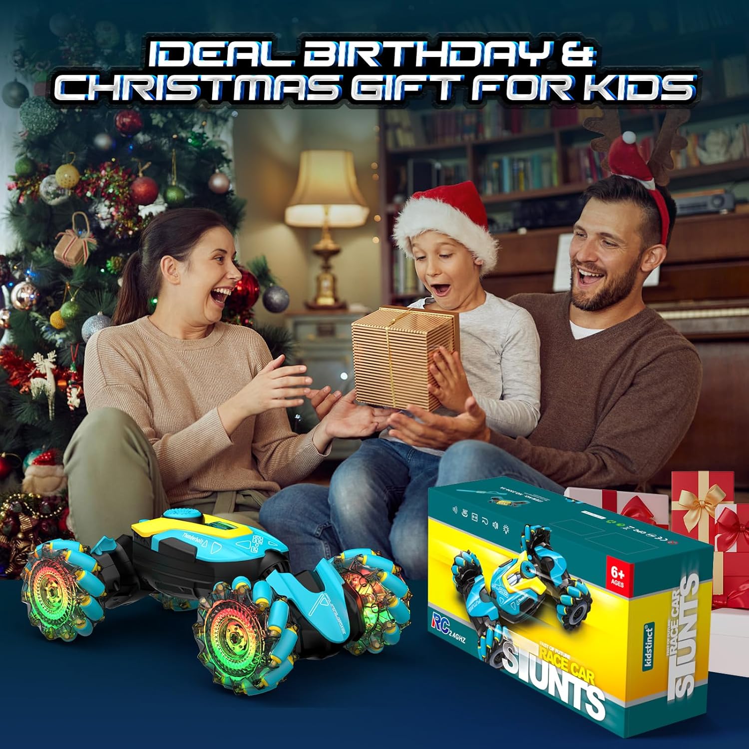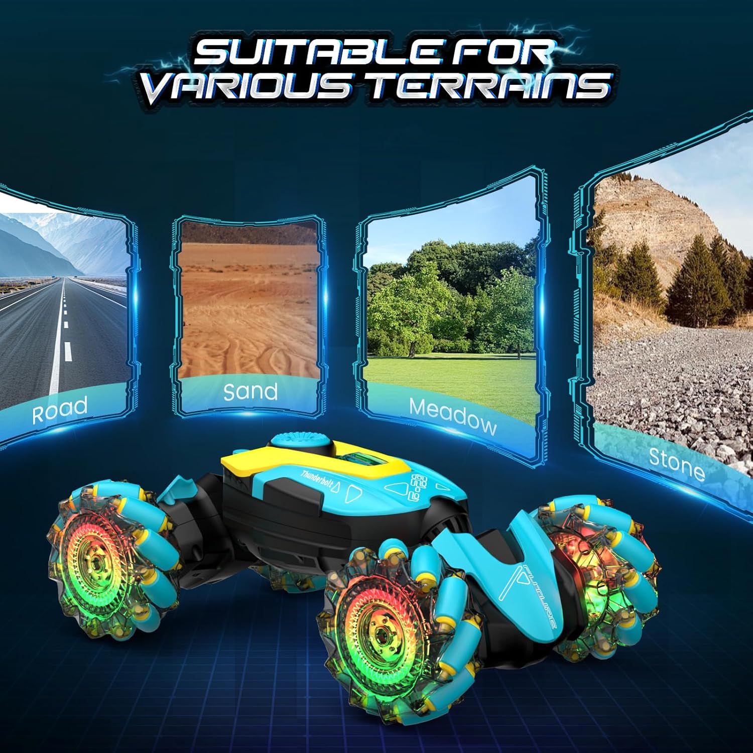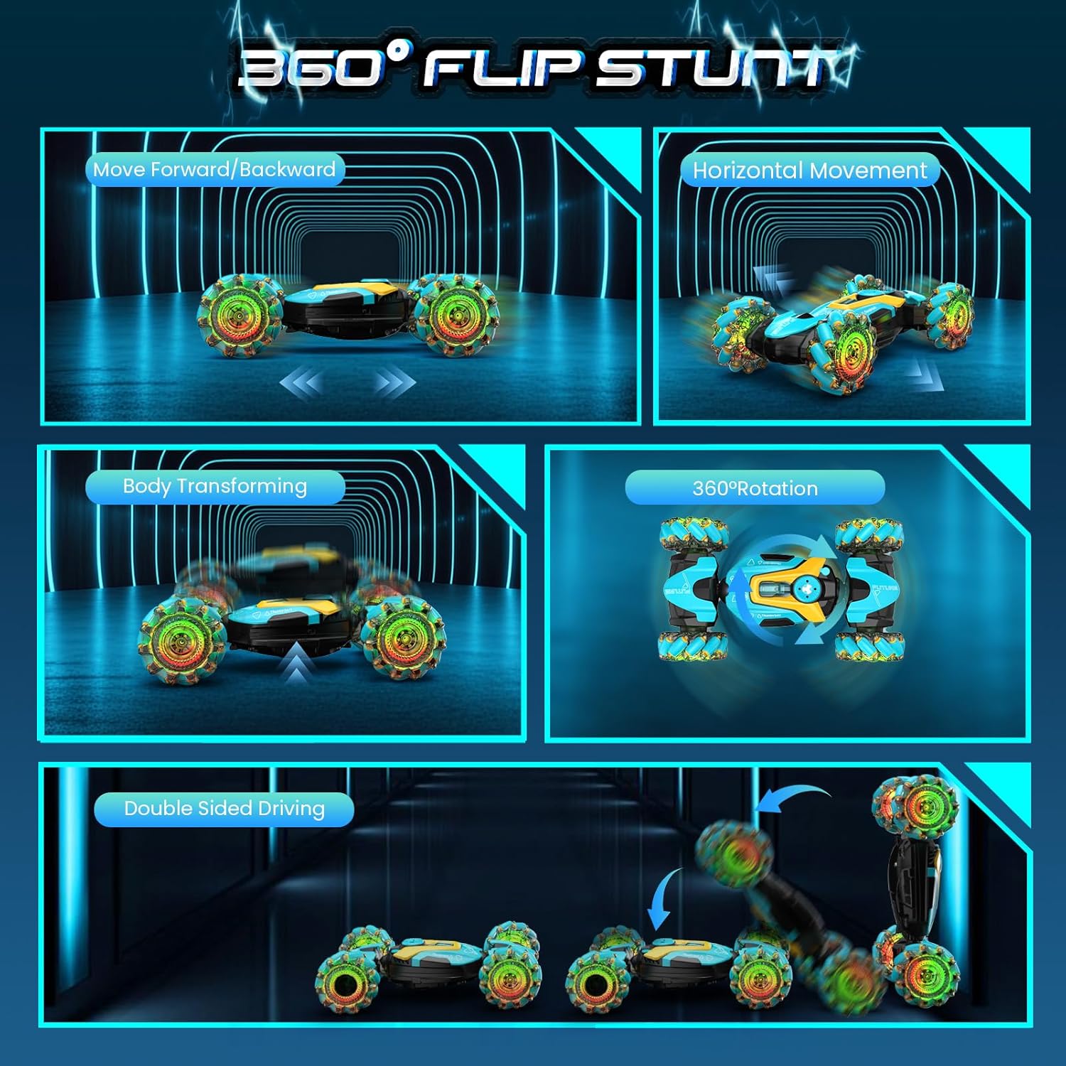Fantistic RC Stunt Car: l'auto acrobatica per bambini adotta un sistema di controllo remoto a 2,4 GHz, per una lunga distanza di controllo oltre i 20 m. Può muoversi facilmente in tutte le direzioni. Caratteristiche di arrampicata, torsione, avanzamento in avanti e indietro, rotazione a 360 gradi e ribaltamenti a doppio lato a 180 gradi. L'auto acrobatica RC può spruzzare, il che porta più divertimento per i bambini. Telecomando da 2,4 GHz e 2 modi di controllo: il telecomando da 2,4 GHz può anti-interferenza. I bambini secondari possono controllare diverse auto telecomandate contemporaneamente senza interferenze e possono guidare e ruotare l'auto giocattolo dal telecomando della maniglia o dal controller dell'orologio come vogliono. Permettono ai bambini di divertirsi a giocare con l'auto acrobatica più felice. Auto con telecomando resistente e sicuro: la fantastica auto acrobatica è realizzata con plastica ABS resistente di alta qualità e verniciatura a spruzzo. Con pneumatici in gomma morbida ed elastica di alta qualità, assorbimento degli urti, presa estremamente forte, resistenza allo scivolamento, non teme la strada scivolosa, consentendo all'auto di guidare su diversi terreni a proprio agio. Luci colorate per pneumatici e musica dinamica: il corpo dell'auto con telecomando ha luci LED luminose e colorate. Le luci a LED possono illuminare 4 pneumatici trasparenti. Quando l'auto RC è alla guida, le luci a LED si accenderanno e la musica arriva, il che porterà più divertimento ai bambini con i loro amici. Ameranno questo gadget. Raffreddare il design del pneumatico esplosione e le luci lo renderanno più attraente e interessante. Auto RC ricaricabili per bambini: include 2 batterie ricaricabili per auto giocattolo fornite con la confezione. Ogni capacità della batteria dell'auto giocattolo telecomandata è di 500 mAh, supporta 25 minuti continuando a giocare ogni batteria, per un totale di 50 minuti di gioco. Può essere completamente caricato in 2 ore.