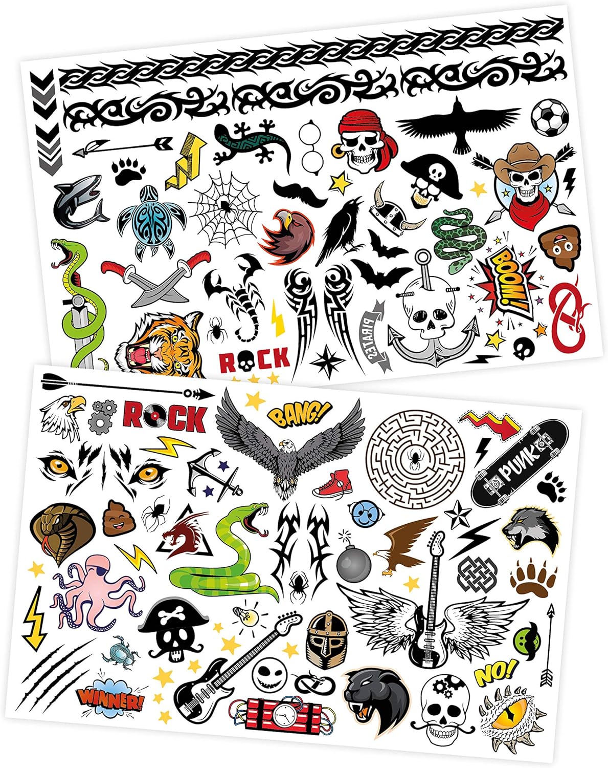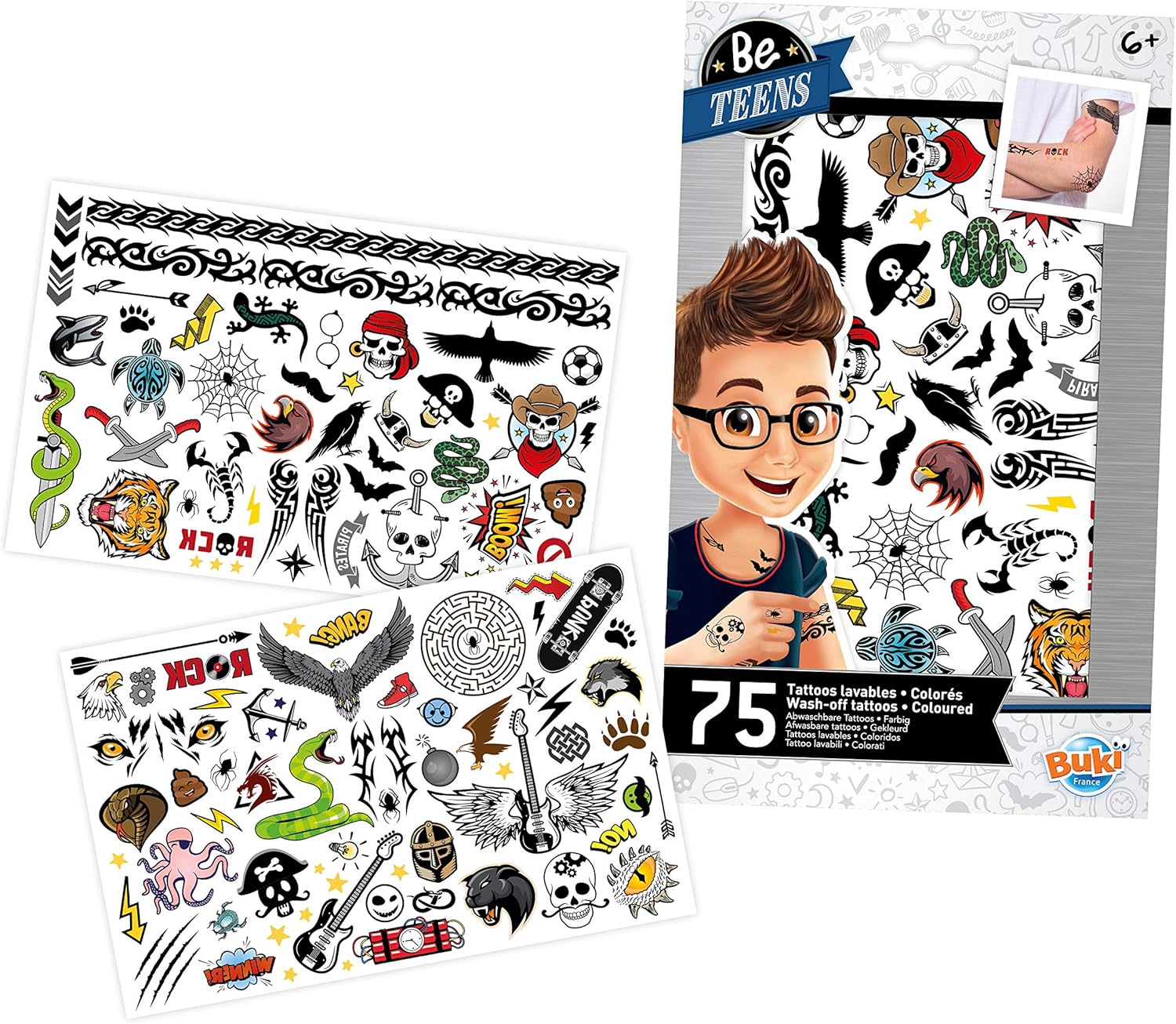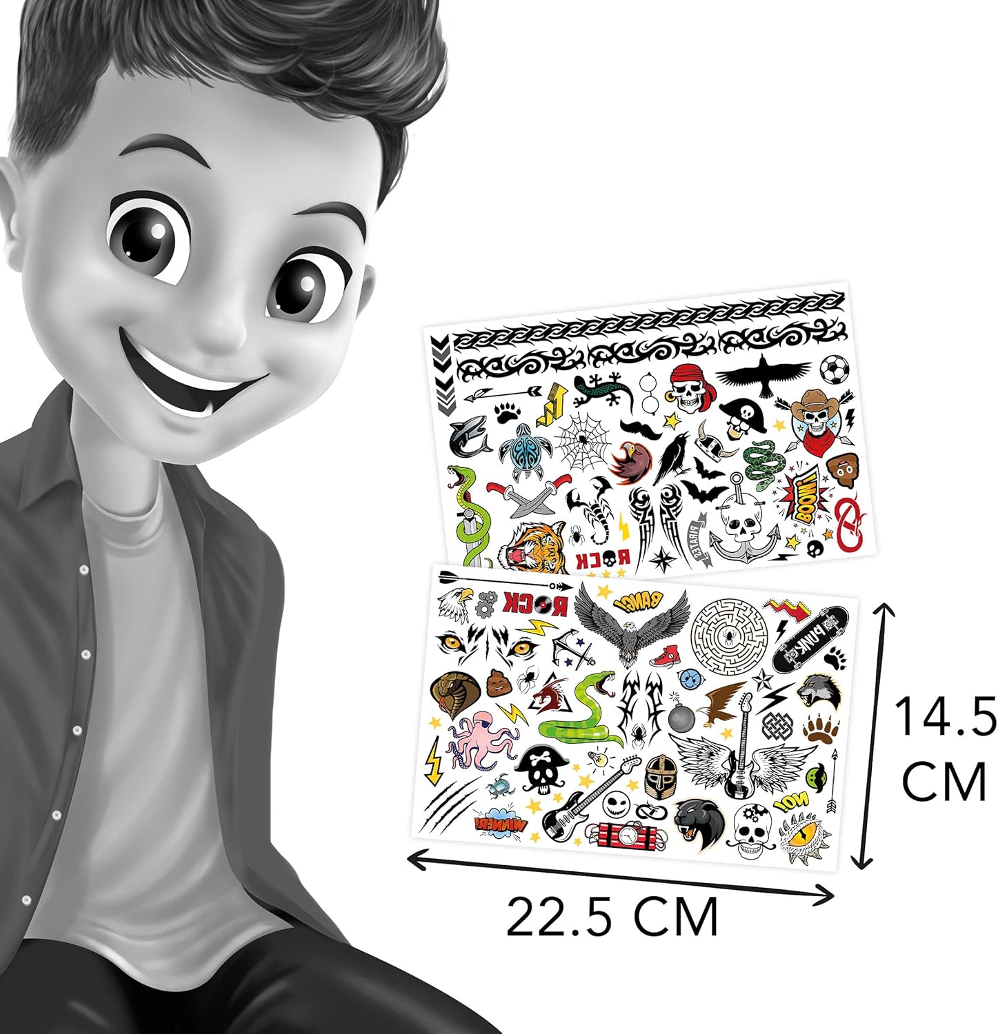 2 fogli per un totale di 75 tatuaggi Scegli un motivo e applicalo sulla pelle Applicare con una spugna umida I tatuaggi sono temporanei e lavabili A partire da 6 anni