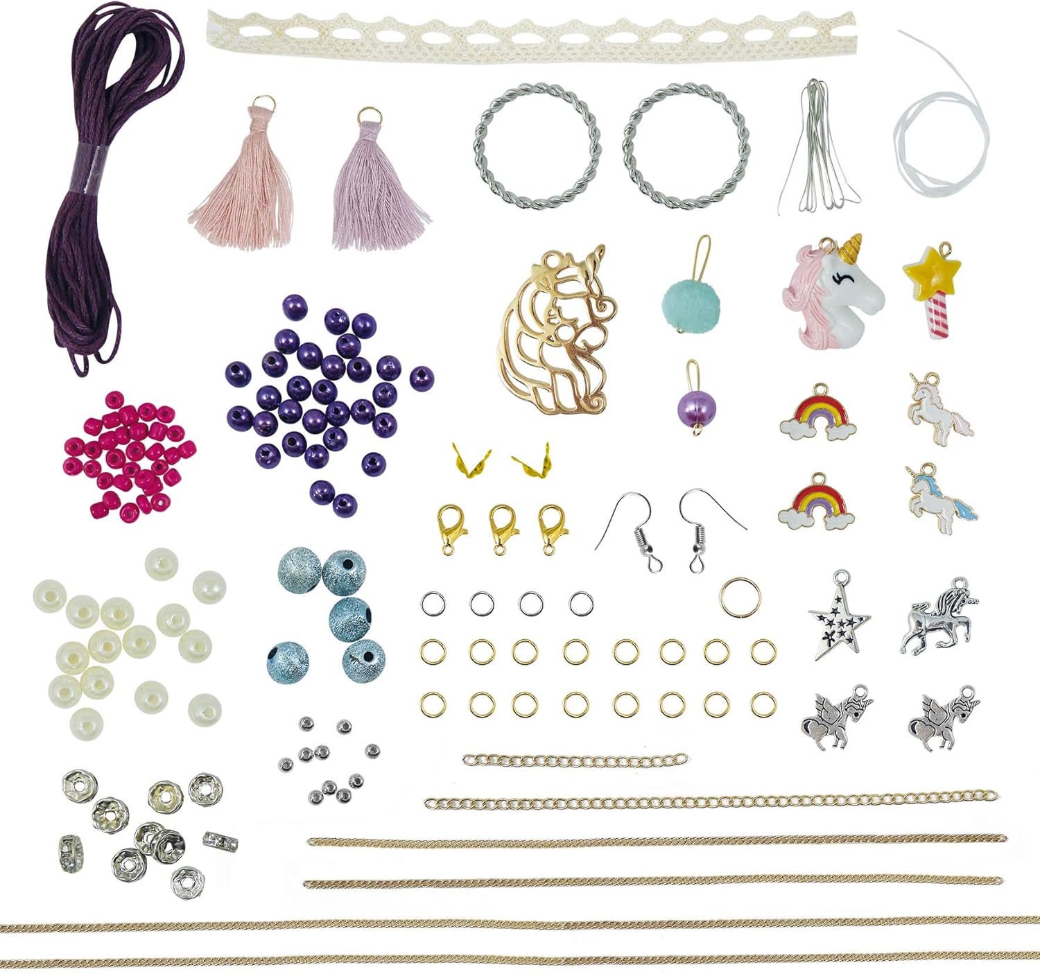 Una scatola per il fai-da-te per creare bellissimi gioielli alla moda, ispirati al fantastico mondo degli unicorni Infila, prepara e assembla perline e ciondoli per creare 5 gioielli Include tutti gli accessori per creare 2 collane, 1 paio di orecchini e 2 braccialetti: ciondoli colorati, ciondoli argentati, pompon, catenine, fermagli, e moltro altro ancora Include un libretto di istruzioni illustrato a colori Età consigliata: 8 anni +