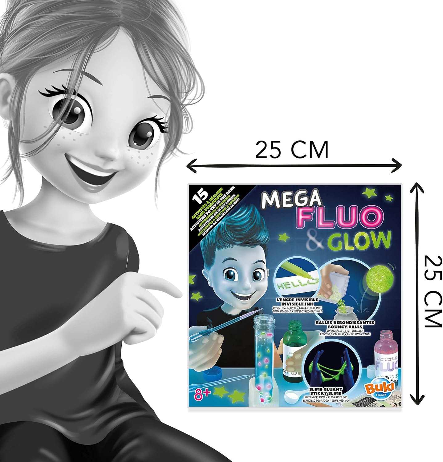 Un kit per realizzare 15 attività al buio per scoprire colori fluorescenti e oggetti fosforescenti 15 esperimenti spiegati passo dopo passo in un libretto a colori illustrato Crea dello slime e delle palle rimbalzanti che brillano al buio Molti accessori inclusi per fare gli esperimenti: polvere di slime, lampada UV (batteria inclusa) Età consigliata: 8 anni +