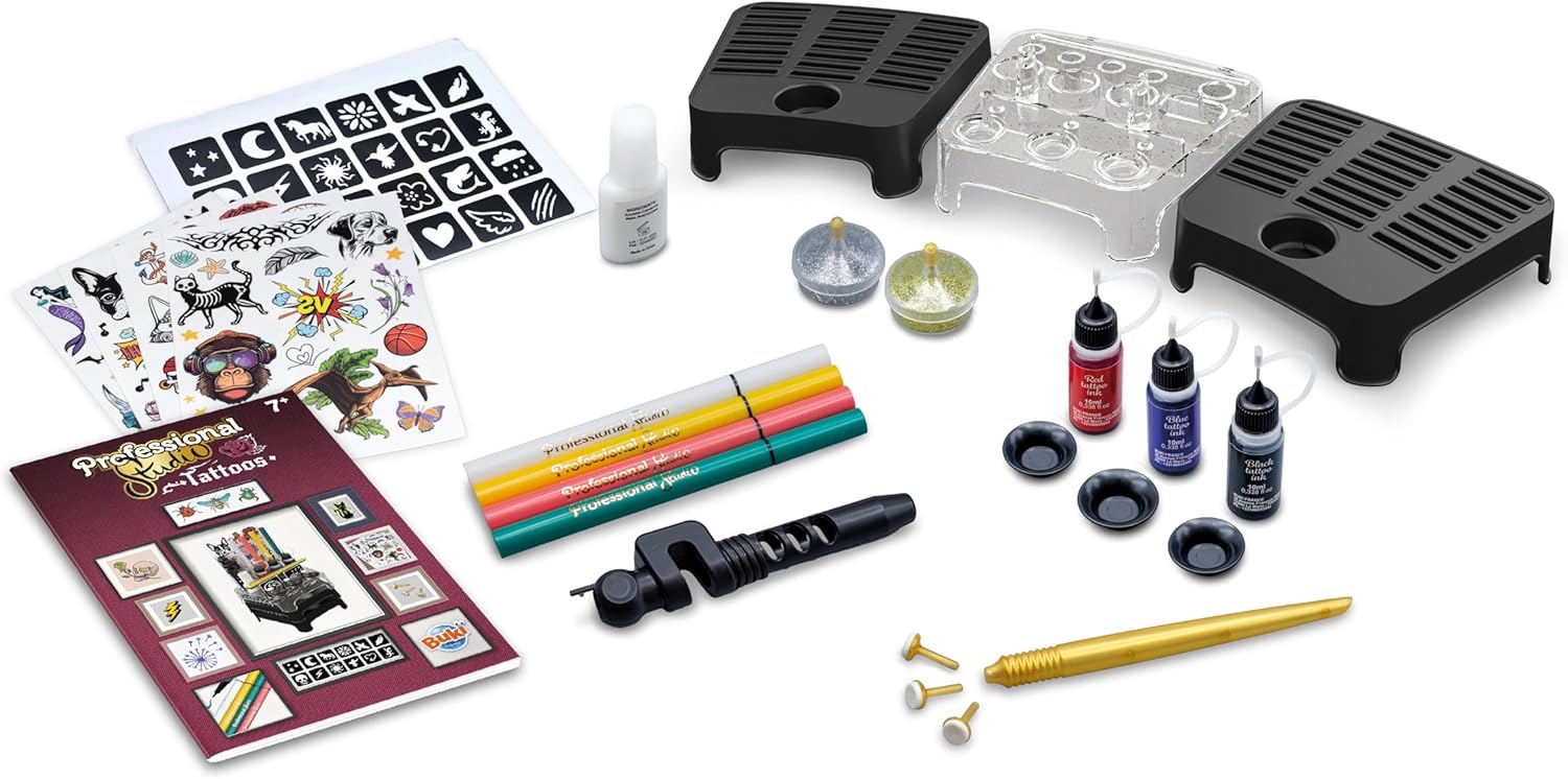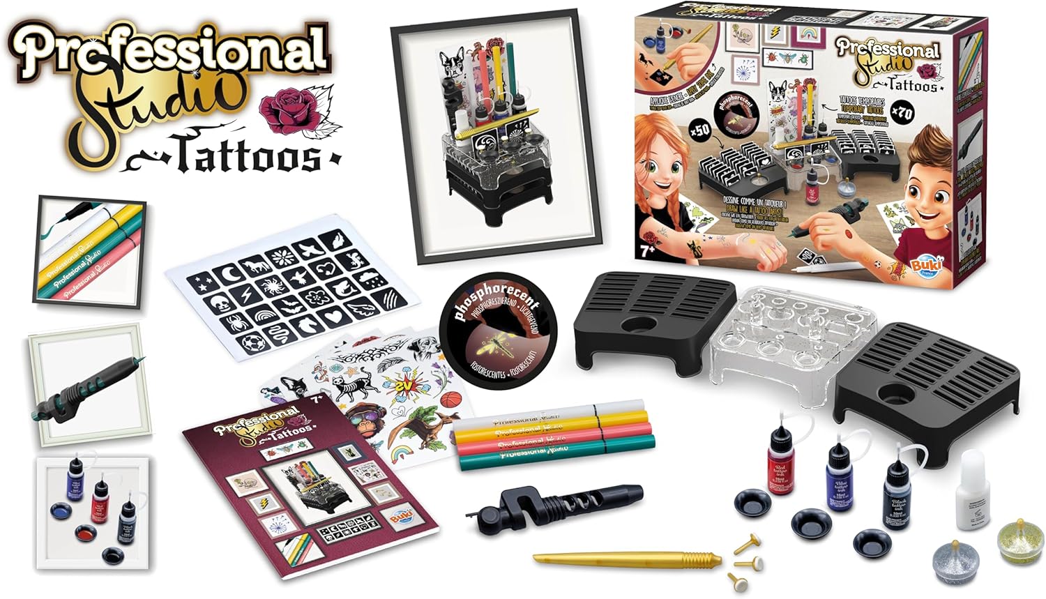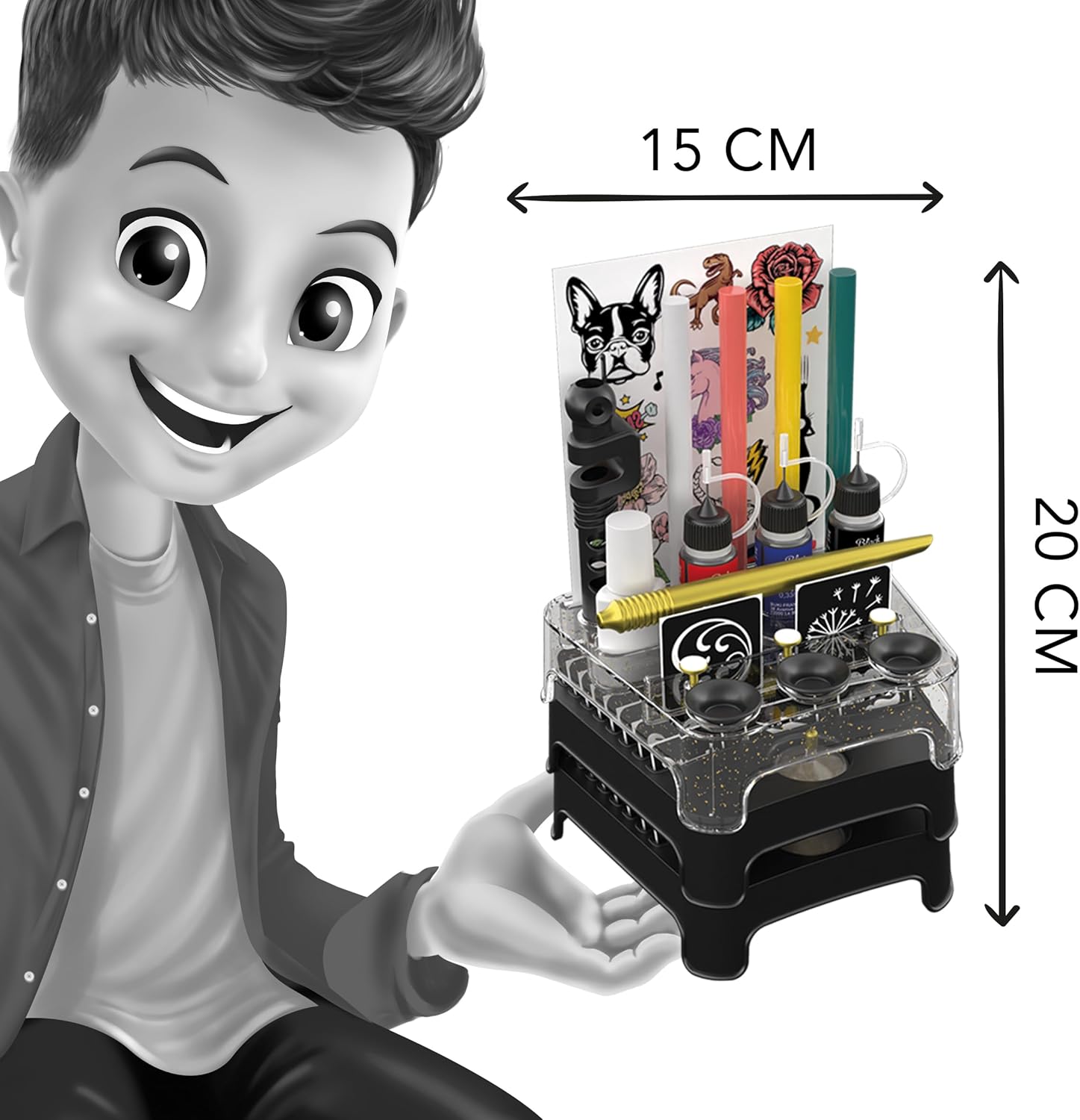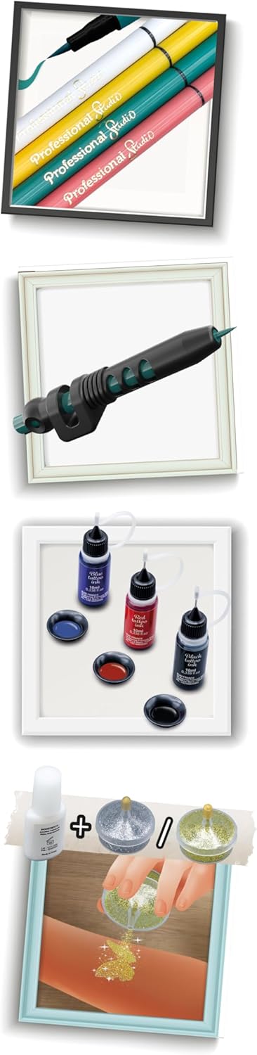 Diventa un vero artista del tatuaggio con Professional Studio Tattoos! Scegli uno stencil, posizionalo sulla pelle e applica l’inchiostro con la penna per timbri. Posiziona il pennarello per tatuaggi nello strumento, per disegnare liberamente o colorare gli stencil come un vero tatuatore! Se vuoi, puoi anche aggiungere dei glitter e far brillare il tatuaggio! Contiene: 4 pennarelli per tatuaggi, 3 boccette di inchiostro per tatuaggi, 4 fogli di tatuaggi temporanei, 2 vasetti di glitter, 1 flacone di colla cosmetica e 50 stencil autoadesivi. L’inchiostro, i pennarelli e i tatuaggi temporanei possono essere rimossi dopo qualche giorno semplicemente lavandosi o utilizzando uno struccante, a seconda del tatuaggio e del tipo di pelle. L’inchiostro, i pennarelli e i tatuaggi temporanei possono essere rimossi dopo qualche giorno semplicemente lavandosi o utilizzando uno struccante, a seconda del tatuaggio e del tipo di pelle.