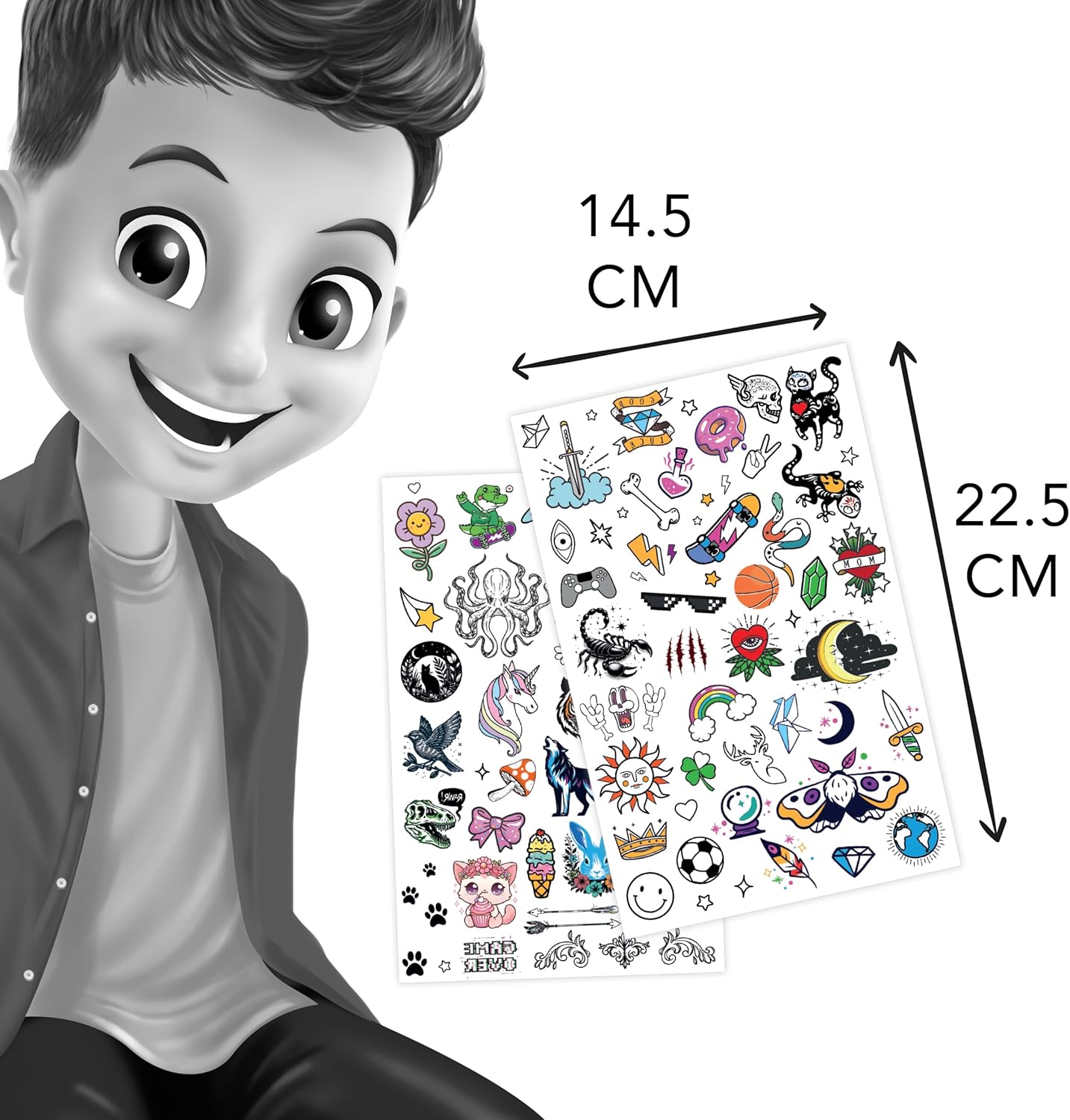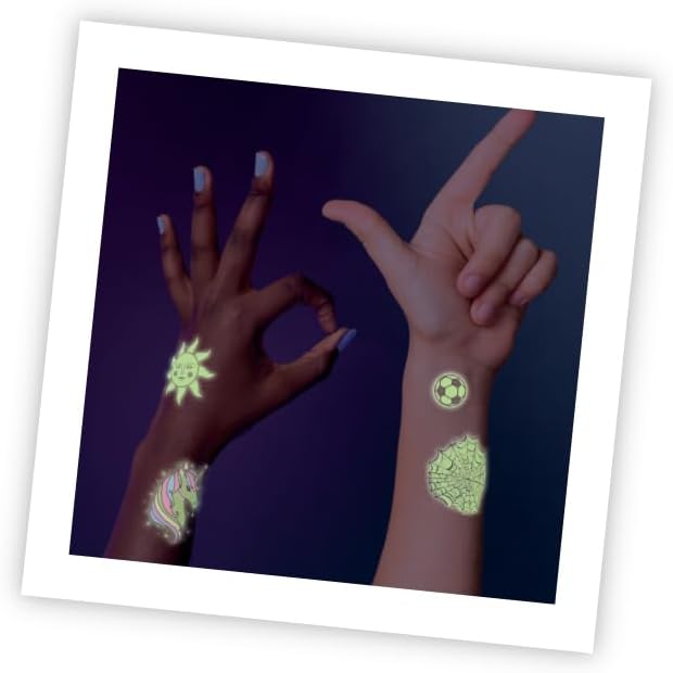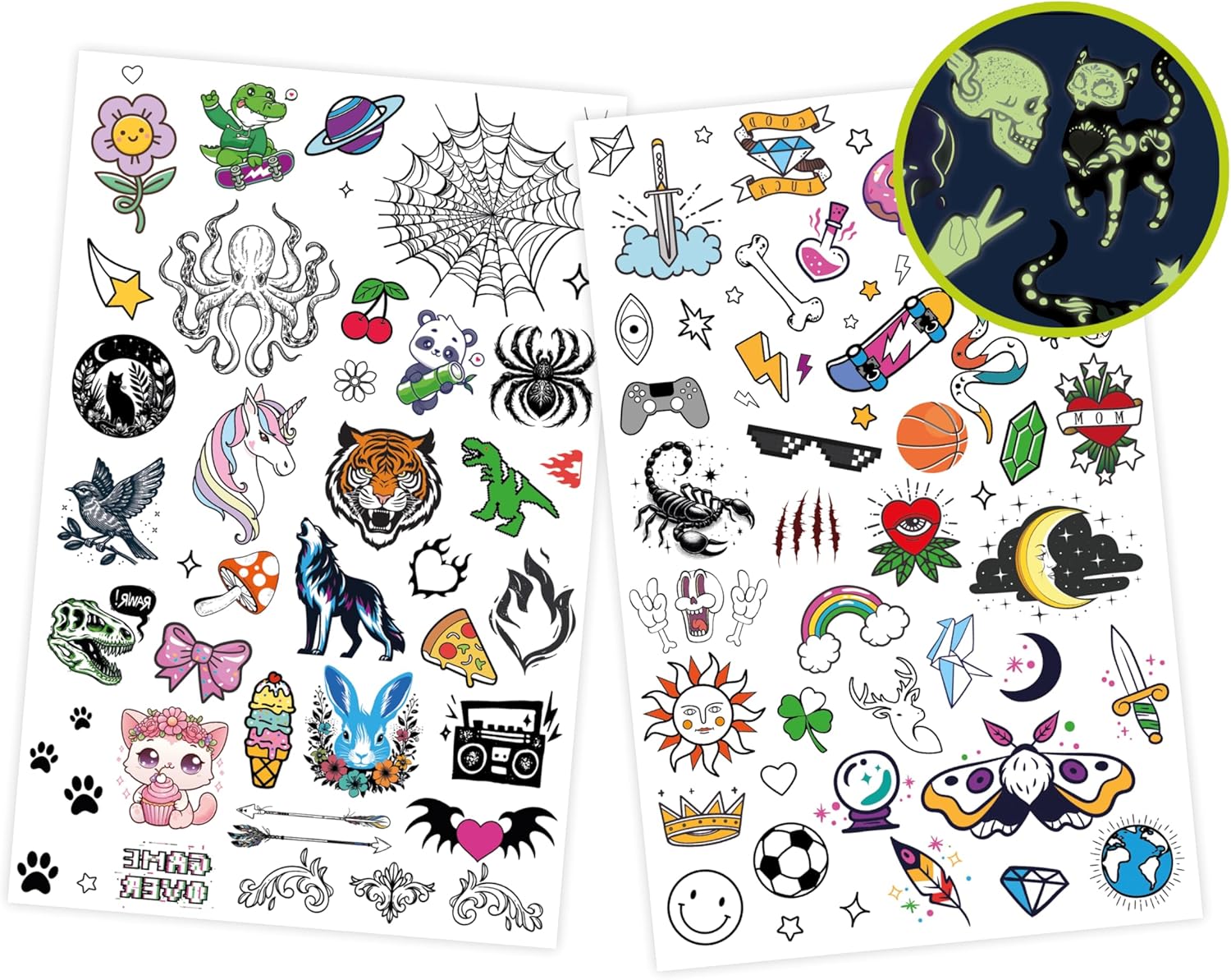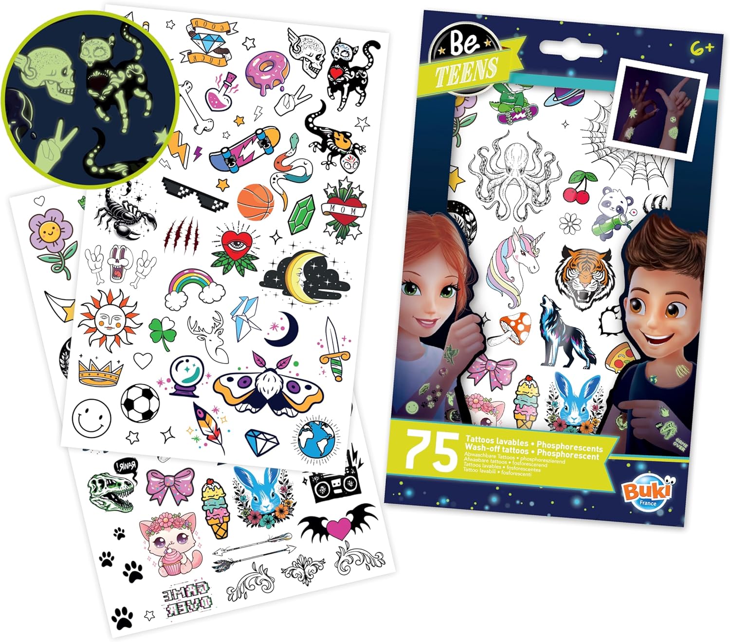 75 tatuaggi temporanei che si applicano con una spugna umida Una parte del tattoo si illumina di notte! Contiene 2 tavole per un totale di 75 tatuaggi Modello misto Da 6 anni