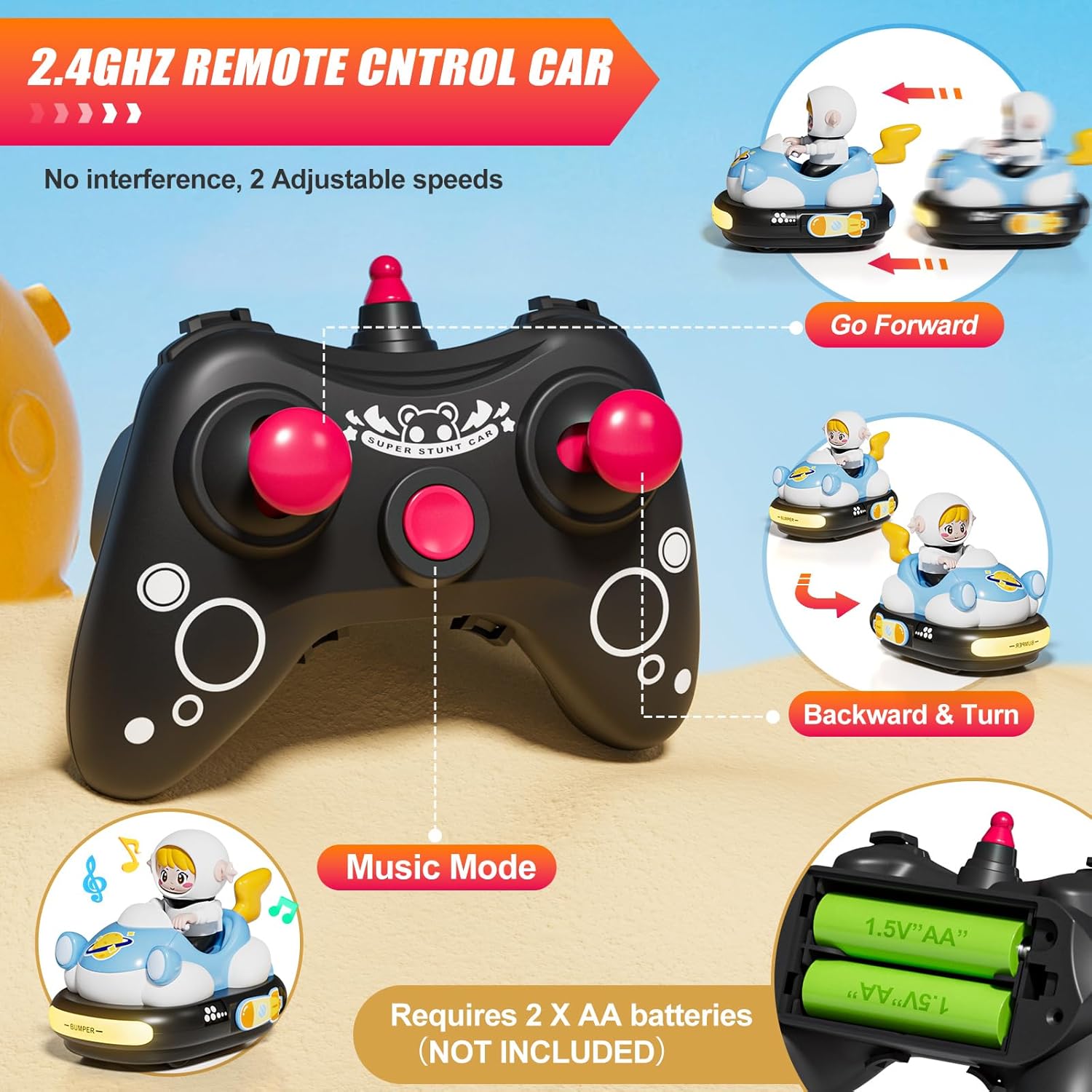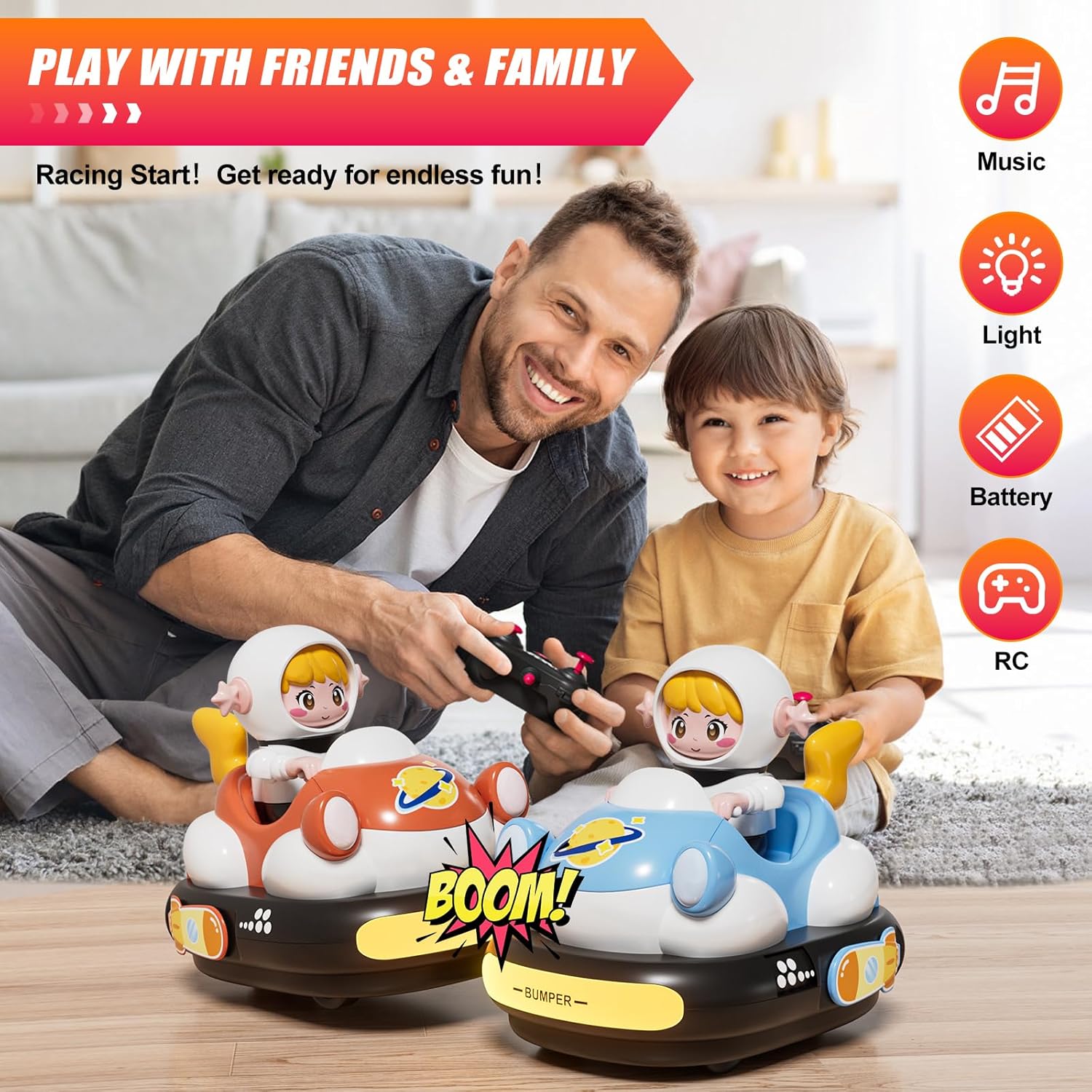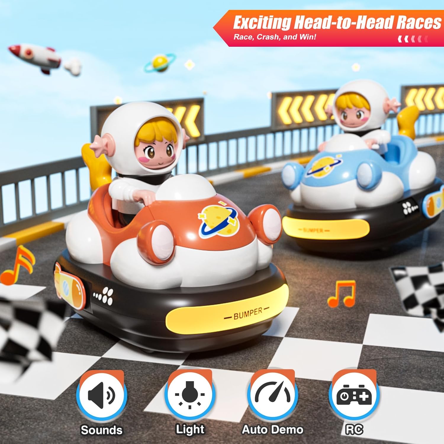 Avventura da corsa tutto in uno: il set include due auto RC a cartone animato (blu e arancione), due personaggi del conducente rimovibili, due telecomandi e due batterie ricaricabili con cavo di ricarica per un divertimento ininterrotto. Nota: ogni telecomando richiede 2 batterie AA (non incluse). Luci fantastiche e suoni realistici: ogni auto è dotata di suoni realistici, melodie intercambiabili e modalità mute opzionale, che garantisce ore di divertimento. I fari luminosi e le luci posteriori aumentano il piacere mentre il conducente che salta aggiunge tensione extra durante gli urti laterali. 【Divertimento interattivo per paraurti】Con un innovativo meccanismo di paraurti, ogni auto fornisce ulteriore eccitazione facendo saltare fuori il conducente quando il paraurti laterale viene colpito. Sia che si tratti di vittoria o sconfitta, vivi gare emozionanti e godersi il gameplay emozionante! 【Facile controllo per combattimenti epici】Grazie al controllo a frequenza singola che evita interferenze, entrambe le auto funzionano senza intoppi. I bambini possono controllarli in avanti, indietro, a sinistra o a destra con semplici pulsanti, perfetti per emozionanti gare a due battaglie. Materiali robusti e sicuri: realizzati in plastica ABS ad alta resistenza, queste auto per paraurti RC sono durevoli e sicure. Gli pneumatici in gomma antiscivolo offrono una presa e un controllo eccellenti, mentre i bordi lisci e il design robusto li rendono ideali per i bambini.