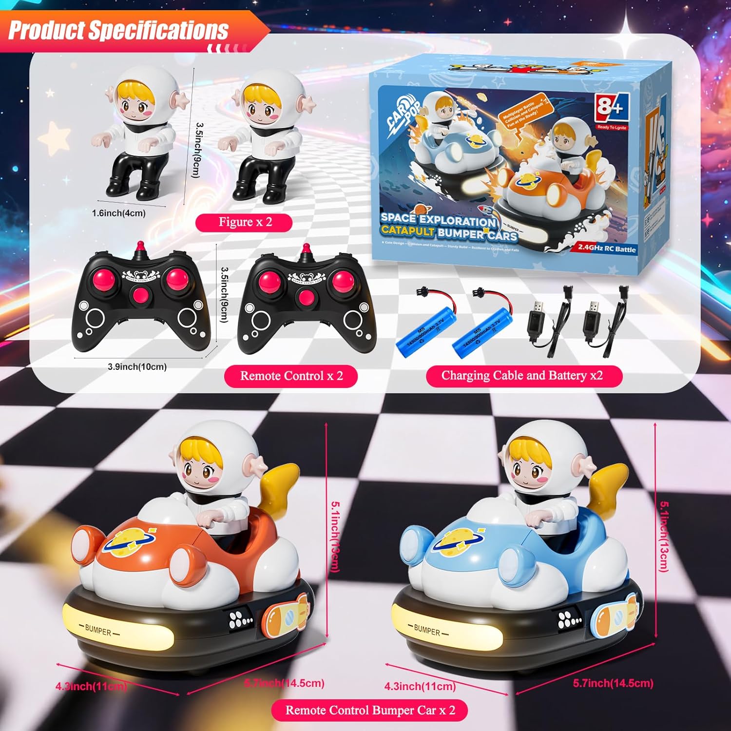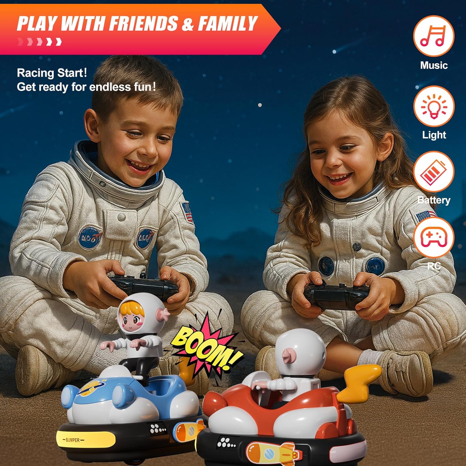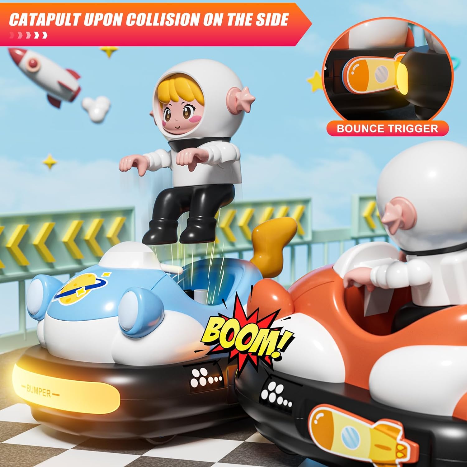 Avventura da corsa tutto in uno: il set include due auto RC a cartone animato (blu e arancione), due personaggi del conducente rimovibili, due telecomandi e due batterie ricaricabili con cavo di ricarica per un divertimento ininterrotto. Nota: ogni telecomando richiede 2 batterie AA (non incluse). Luci fantastiche e suoni realistici: ogni auto è dotata di suoni realistici, melodie intercambiabili e modalità mute opzionale, che garantisce ore di divertimento. I fari luminosi e le luci posteriori aumentano il piacere mentre il conducente che salta aggiunge tensione extra durante gli urti laterali. 【Divertimento interattivo per paraurti】Con un innovativo meccanismo di paraurti, ogni auto fornisce ulteriore eccitazione facendo saltare fuori il conducente quando il paraurti laterale viene colpito. Sia che si tratti di vittoria o sconfitta, vivi gare emozionanti e godersi il gameplay emozionante! 【Facile controllo per combattimenti epici】Grazie al controllo a frequenza singola che evita interferenze, entrambe le auto funzionano senza intoppi. I bambini possono controllarli in avanti, indietro, a sinistra o a destra con semplici pulsanti, perfetti per emozionanti gare a due battaglie. Materiali robusti e sicuri: realizzati in plastica ABS ad alta resistenza, queste auto per paraurti RC sono durevoli e sicure. Gli pneumatici in gomma antiscivolo offrono una presa e un controllo eccellenti, mentre i bordi lisci e il design robusto li rendono ideali per i bambini.