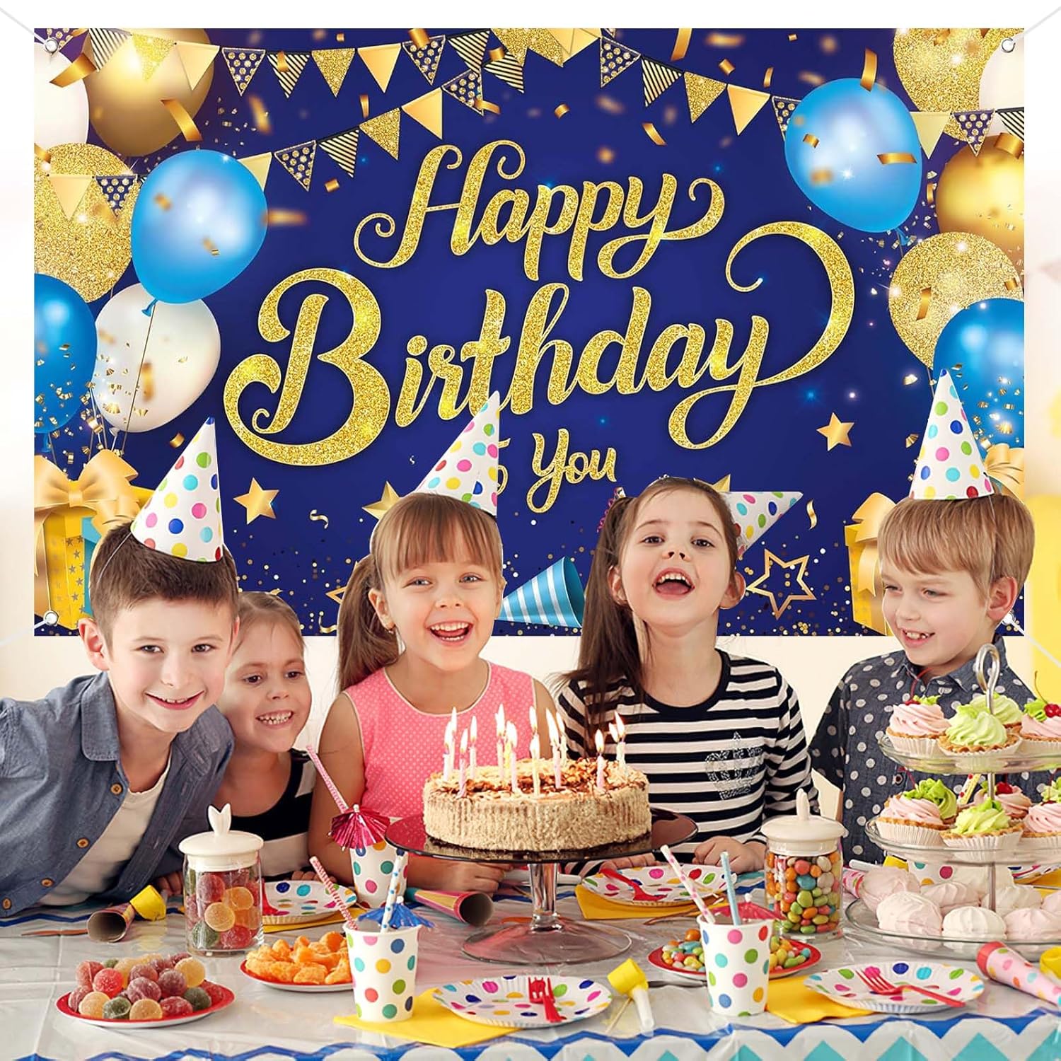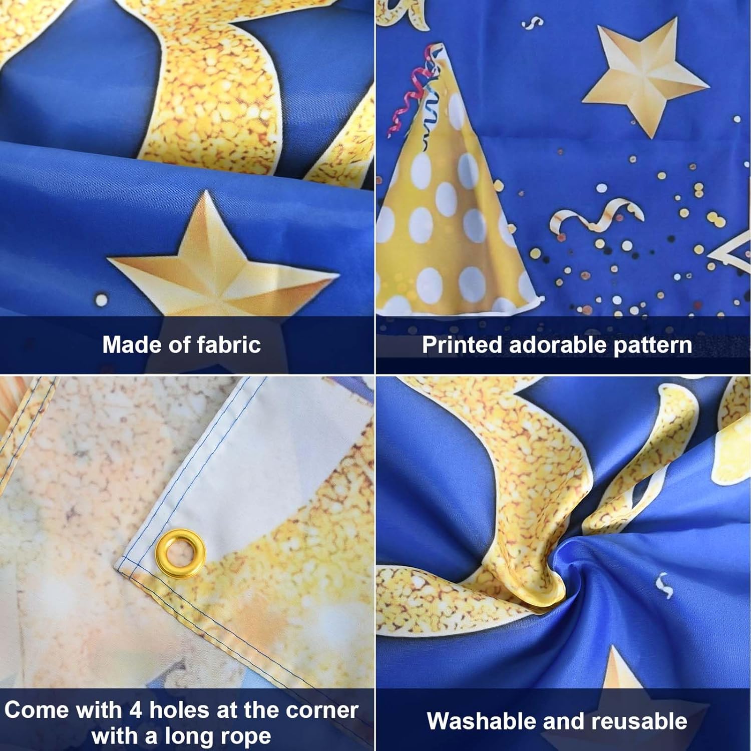 Design di Grandi Dimensioni: Questo tessuto decorativo di buon compleanno misura 110*185cm, che può coprire perfettamente la maggior parte della parete, del palcoscenico o essere visualizzato come sfondo di una festa per creare una scena coinvolgente a tema compleanno che catturerà l'attenzione dei vostri ospiti in qualsiasi occasione di celebrazione. Materiale di Alta Qualità: Realizzato in poliestere con buona durata e mantenimento del colore, riutilizzabile, facile da pulire e conveniente. L'accattivante combinazione di colori blu e oro migliora l'impatto visivo e l'atmosfera dell'evento. Comodo Set di Installazione: Viene fornito con una corda di 6 metri, che consente agli utenti di regolare facilmente la lunghezza di sospensione in base alle esigenze effettive, supporta allestimenti flessibili all'interno e all'esterno, riduce i tempi di preparazione e consente di ottenere facilmente l'effetto di allestimento desiderato. Facile da Riporre: Grazie alla sua leggerezza e alla sua pieghevolezza, questo fondale è facile da riporre e da trasportare. Dopo l'uso, può essere rapidamente ripiegato e riposto in uno spazio ridotto, evitando il problema delle decorazioni tradizionali che occupano un grande spazio. Uso Multifunzionale: Questo fondale può essere utilizzato non solo per le feste di compleanno, ma anche per le celebrazioni su larga scala con lo stesso tema, che può essere utilizzato come fondali, striscioni, tende da palcoscenico, ecc, un panno per più scopi.