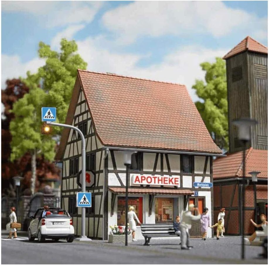 Busch - Apotheke H0 (Bu1599)( 4001738015997) comes from Busch. Category - Spoorweg Landschap, Number of pieces:, Difficulty Level: , Minimum age years, Type product: Landscaping, Subtype:, Scale :H0 - 1:87 , Assembly time (hours) , , Color - , Dimensions -91x93x111