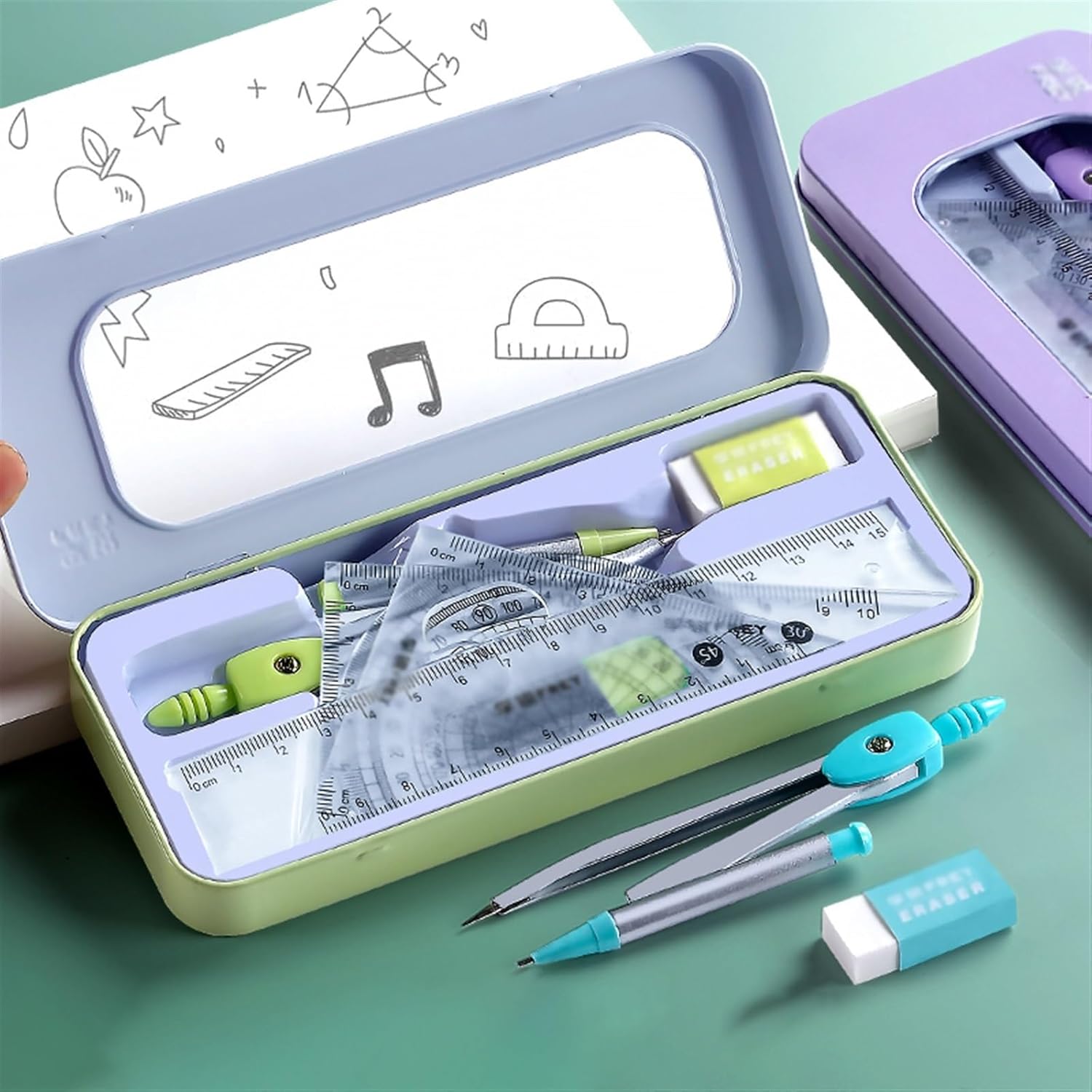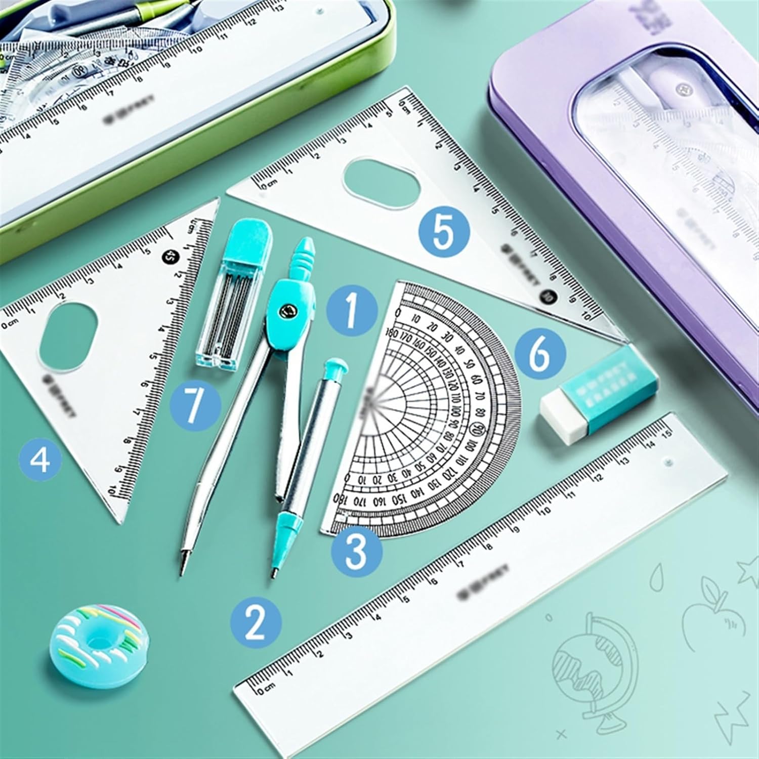 Il kit di geometria da 7 pezzi include: 1 bussola da studio in metallo, 2 triangoli (righello 45° e 3060), goniometro, gomma, ricarica di mina per matita. Un comodo set di geometria per bussola: le bussole in metallo resistenti non si piegano o si flettono durante l'uso, la testa della bussola dal design ergonomico è comoda da tenere, il supporto universale per bussola funziona con matite o penne di qualsiasi dimensione. Standard, righelli, triangoli e goniometro sono dotati di graduazione per una facile identificazione insieme a una scatola di immagazzinaggio durevole che è facile da trasportare e riporre Un pratico set di strumenti per scopi pratici Questo set di strumenti è perfetto per studenti, insegnanti, esperti di matematica, architetti, ingegneri, artisti, designer di tutti i livelli. Un buon set di geometria per insegnanti e studenti. Può essere utilizzato a scuola, in ufficio, a casa o al lavoro. Un regalo perfetto per i tuoi bambini e amici, facile da portare in classe e riporre in classe e a casa.