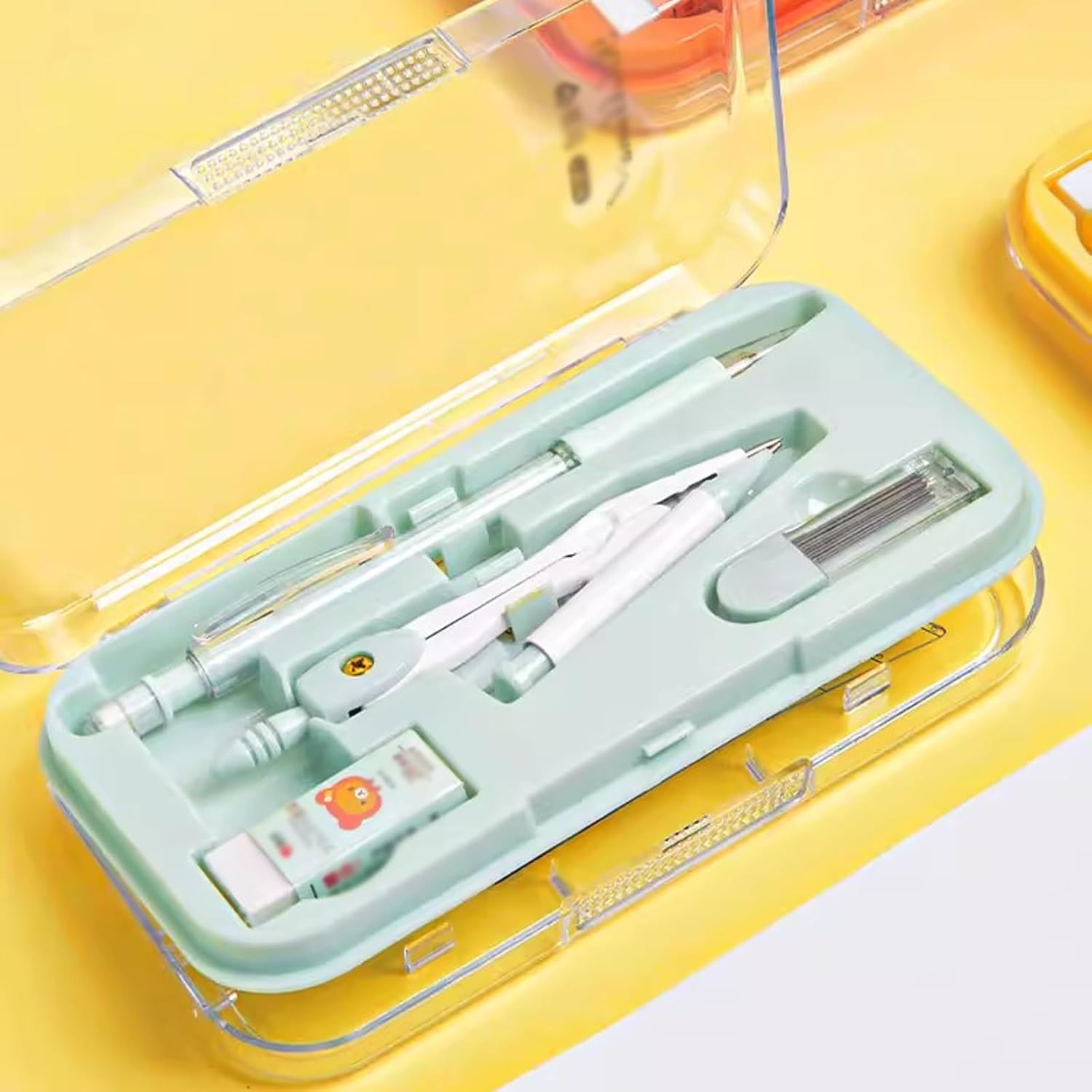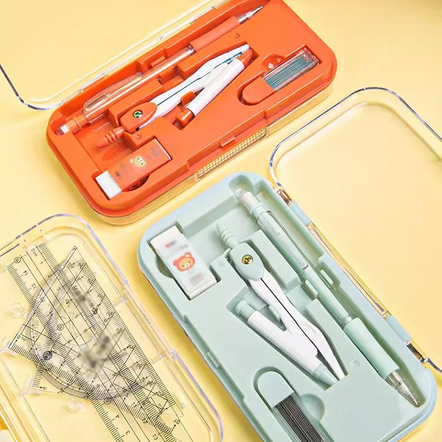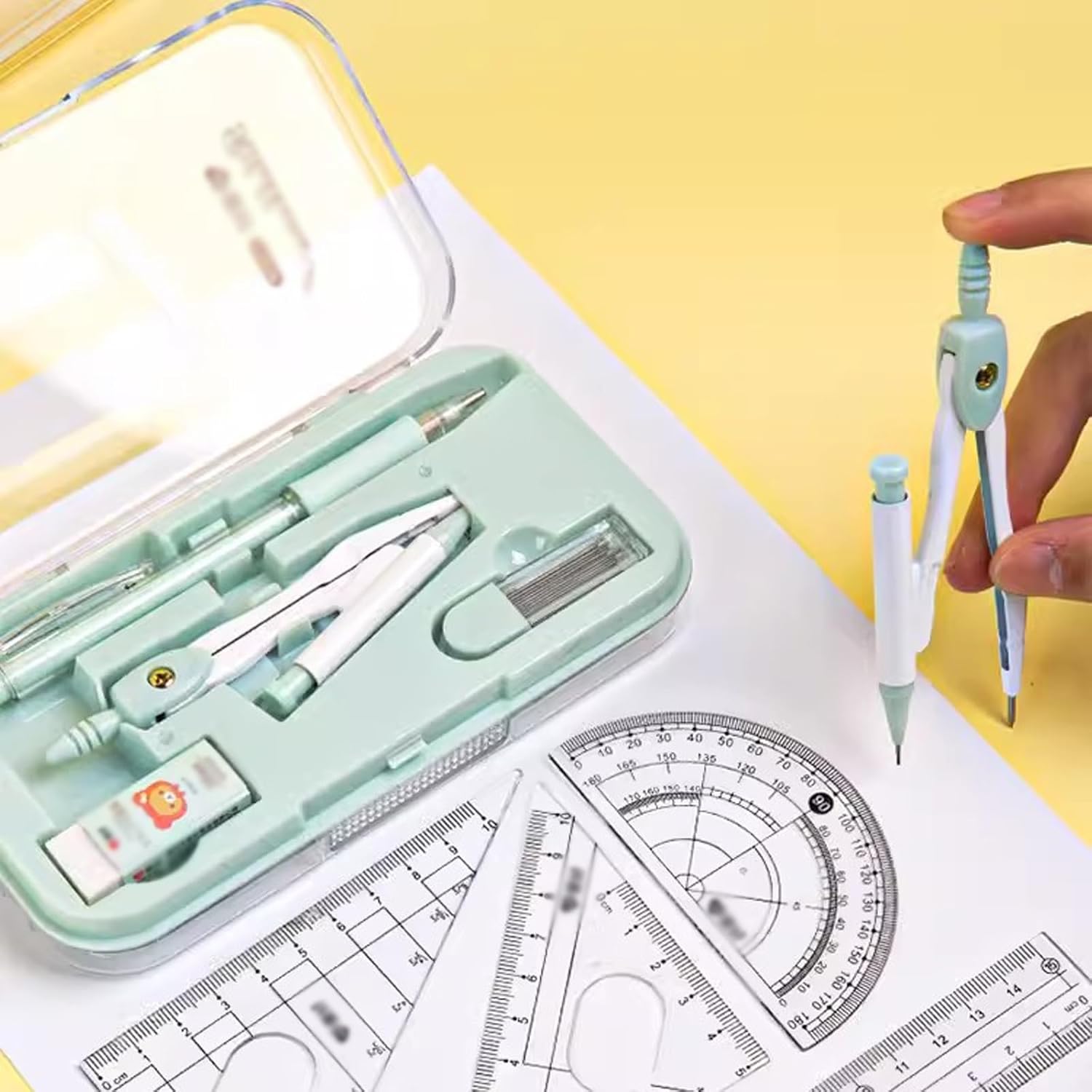 Il kit geometria da 8 pezzi comprende: 1 compasso da studio in metallo, 2 triangoli (45° e 60°), righello, goniometro, gomma, matita, ricarica mina. Un comodo set di geometrie per bussole: bussole in metallo resistente non si piegano o si flettono durante l'uso, la testa della bussola dal design ergonomico è comoda da tenere, il supporto universale per bussola funziona con qualsiasi matita o penna di dimensioni standard, righelli, triangoli e goniometro sono dotati di graduazione per una facile identificazione. Con una scatola portaoggetti resistente facile da trasportare e riporre. Un pratico set di strumenti per scopi pratici. Questo set di strumenti era perfetto per studenti, insegnanti, esperti di matematica, architetti, ingegneri, artisti, designer di tutti i livelli. Un buon set di geometria per insegnanti e studenti. Può essere utilizzato a scuola, in ufficio, a casa o al lavoro. Una buona scelta per insegnanti e studenti: è anche un regalo perfetto per i tuoi bambini e amici, facile da portare in classe e riporre in classe e a casa. Sceglilo come regalo per la stagione scolastica o come regalo di Natale. Applicabile a tutti i livelli: ottimo per l'uso a scuola o a casa. Il miglior strumento per disegnare cerchi per studenti, artisti, matematici, falegnami. È un'ottima scelta per le lezioni di matematica.