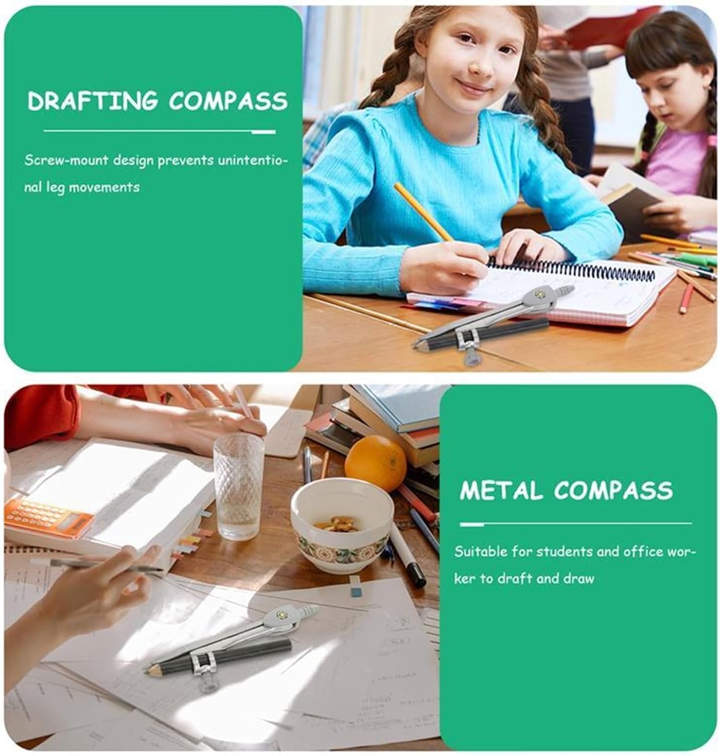 - Il design a vite impedisce movimenti involontari delle gambe. - Realizzato in metallo con placcatura lucida, ha una lunga durata. - Viene fornito con custodia e matita. - Adatto a studenti e impiegati per scrivere e disegnare. - Dimensioni: 12 x 3 x 3 cm Applicabile a tutti i livelli: ottimo per l'uso a scuola o a casa. Il miglior strumento per disegnare cerchi per studenti, artisti, matematici, falegnami. È un'ottima scelta per le lezioni di matematica.