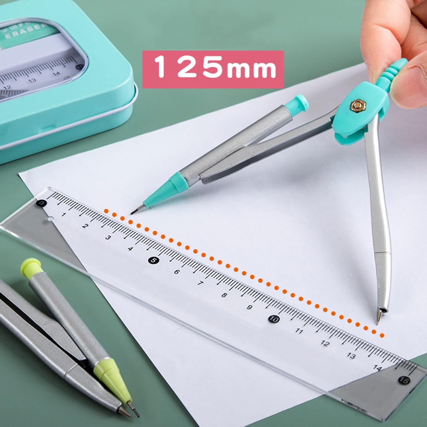I compassi geometrici sono realizzati in metallo e gli strumenti geometrici sono realizzati in plastica di alta qualità, resistente e che può essere utilizzata per anni. Kit di geometria da 7 pezzi Il set di kit di geometria include: 1 compes di studio in metallo, 2 triangoli (45° e 30/60°), 1 righello, 1 protettore, ricarica di mina da 0,7 mm, temperamatite, gomma. Con una resistente custodia in ferro, per proteggere e tenere gli strumenti in un posto nello zaino o sulla scrivania. Facile da trasportare e riporre. Facile da usare per studenti di tutti i livelli, architetti, ingegneri, designer, artisti, insegnanti per progetti di disegno, pittura, disegno scolastico o ufficio. Una scelta pratica per insegnanti e studenti: è anche un regalo perfetto per i tuoi bambini e amici, facile da portare in classe e riporre in classe e a casa.