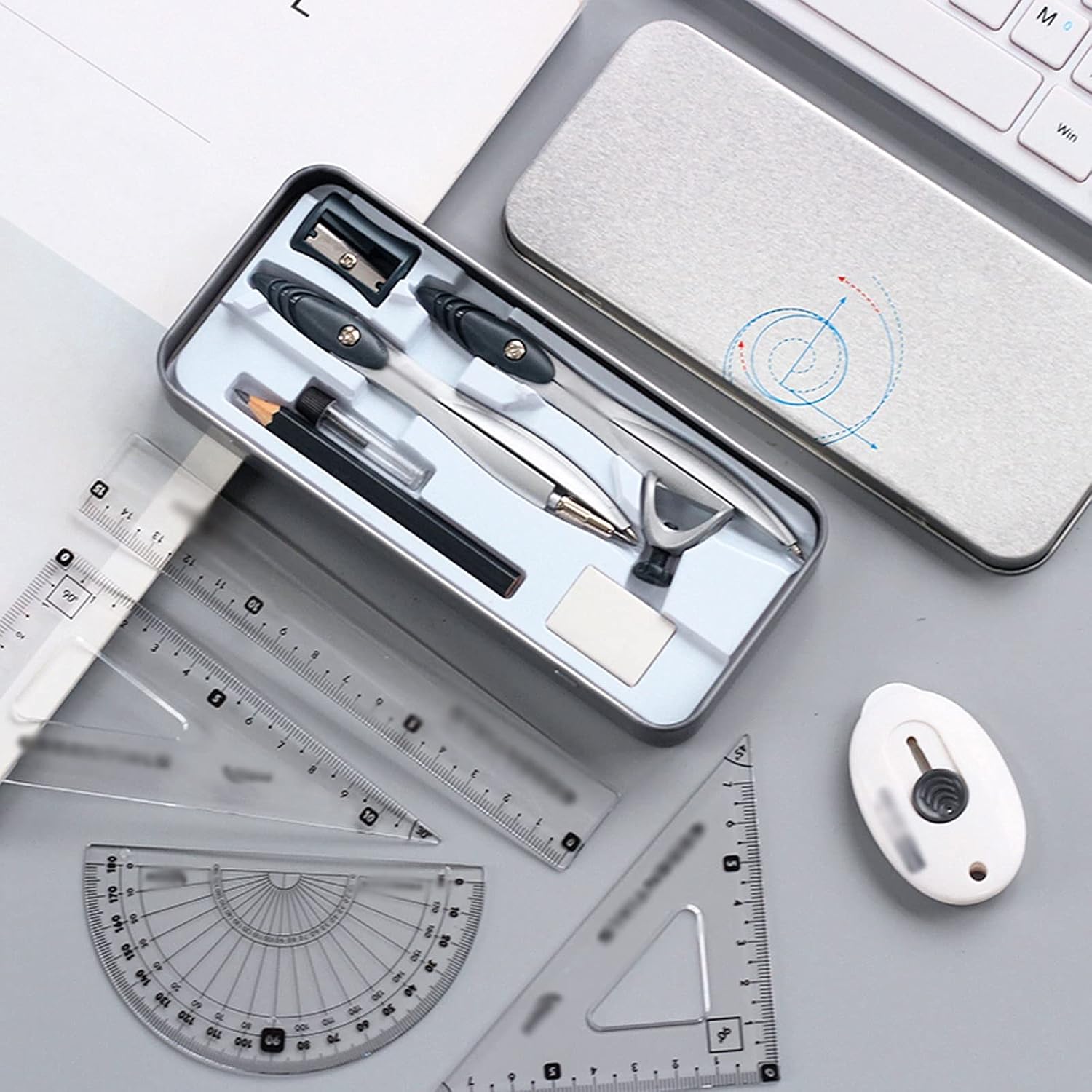 Set di dieci pezzi: un righello, due compassi, una gomma, un taglierino a 180°, un temperamatite, due triangoli (60° e 45°), una matita e una mina. Il set di bussole è realizzato in acciaio inossidabile, resistente e facile da trasportare. La bussola matematica può soddisfare diversi requisiti di disegno ed è comoda da usare. Il kit di geometria è confezionato singolarmente per una facile conservazione. Il kit di geometria matematica può essere utilizzato per lavorare a scuola, in ufficio, a casa o per uscire.