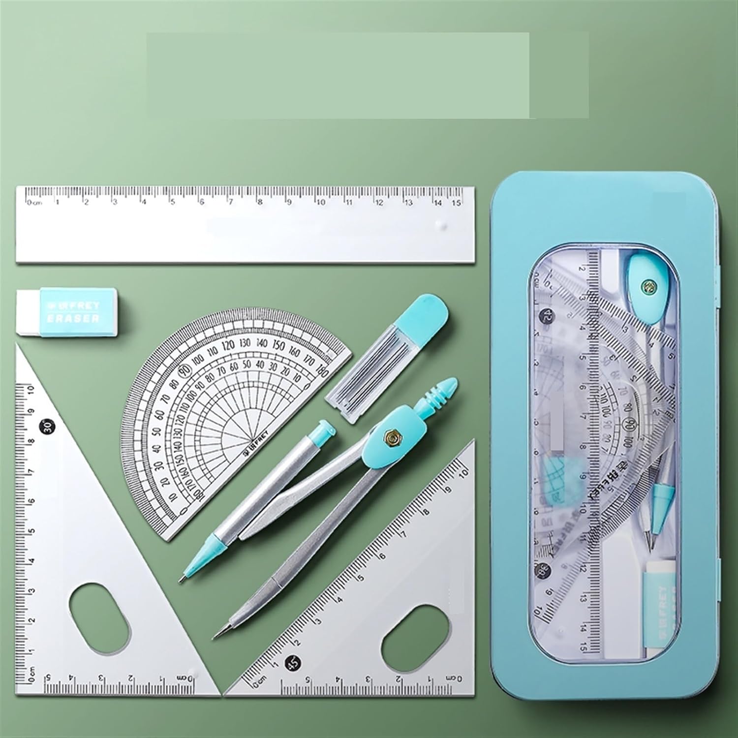 Il kit di geometria da 7 pezzi include: 1 bussola da studio in metallo, 2 triangoli (righello 45° e 3060), goniometro, gomma, ricarica di mina per matita. Un comodo set di geometria per bussola: le bussole in metallo resistenti non si piegano o si flettono durante l'uso, la testa della bussola dal design ergonomico è comoda da tenere, il supporto universale per bussola funziona con matite o penne di qualsiasi dimensione. Standard, righelli, triangoli e goniometro sono dotati di graduazione per una facile identificazione insieme a una scatola di immagazzinaggio durevole che è facile da trasportare e riporre Un pratico set di strumenti per scopi pratici Questo set di strumenti è perfetto per studenti, insegnanti, esperti di matematica, architetti, ingegneri, artisti, designer di tutti i livelli. Un buon set di geometrie per insegnanti e studenti. Può essere utilizzato a scuola, in ufficio, a casa o al lavoro.