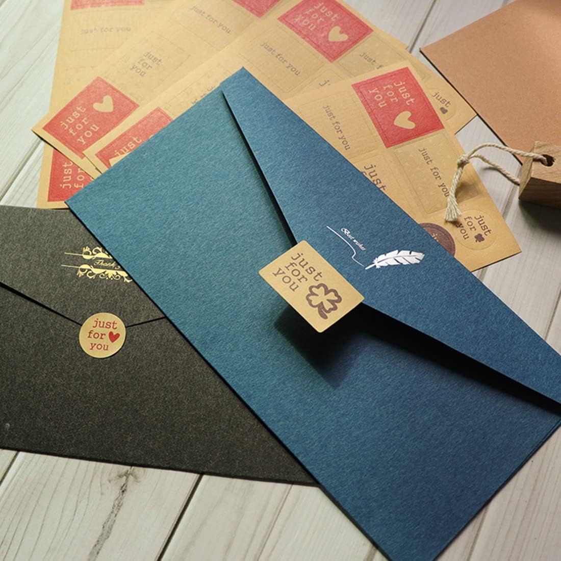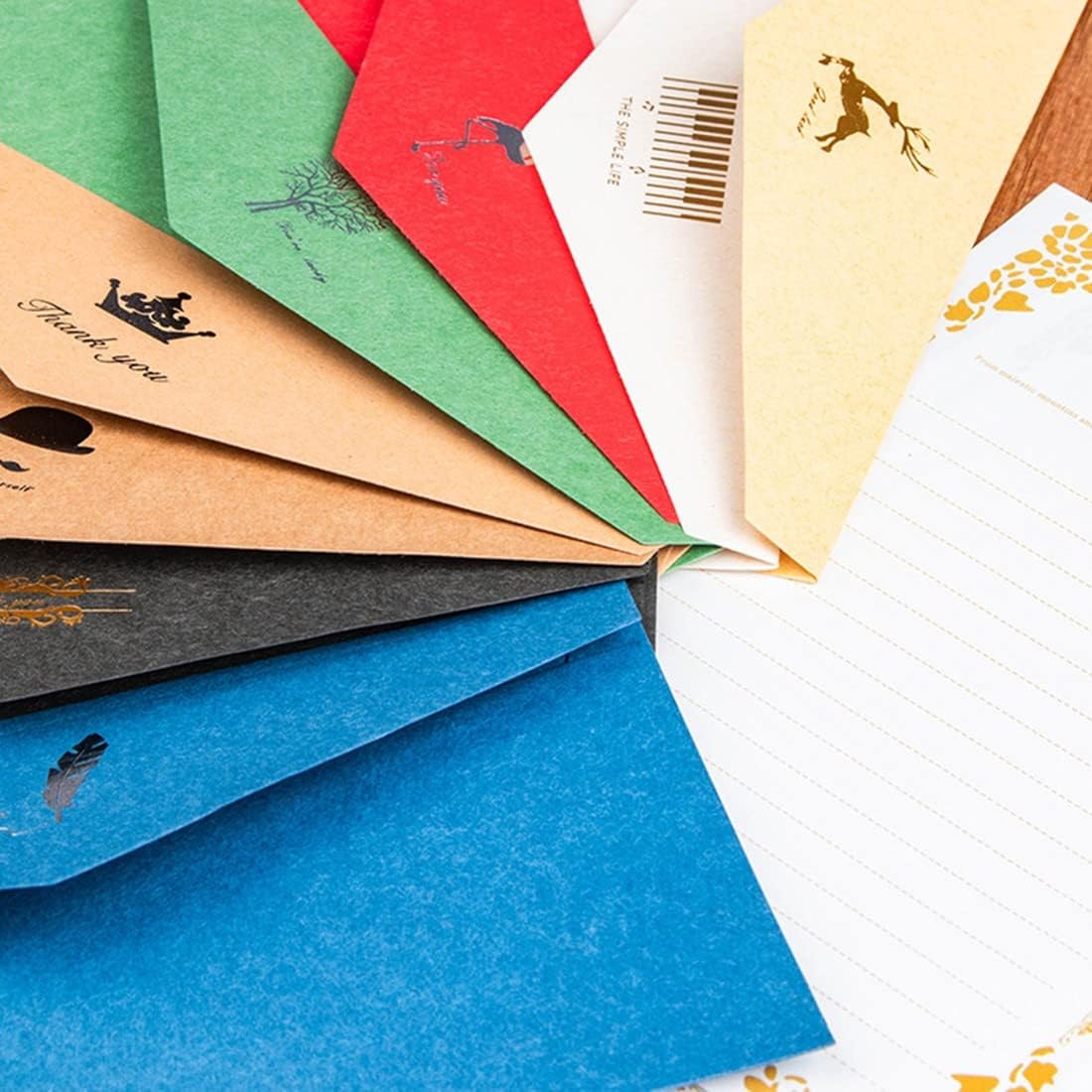 Buste Vintage Carta Kraft: Set di 8 buste e 16 carte vuote, ideali per biglietti di auguri personalizzati, inviti e molto altro. Stile Antico: Ogni busta ha un design pulito e una grafica vintage sul retro, realizzata con la tecnica di bronzo antico. Materiale Resistente: Le buste sono realizzate in robusta carta kraft e non si rompono facilmente. Colori Diversi: Ogni busta ha un colore diverso e un motivo di bronzo unico, che rappresenta un significato di benedizione differente. Misura Adatta: Le buste hanno una misura di 220*210 mm, perfette per biglietti di auguri di varie dimensioni.