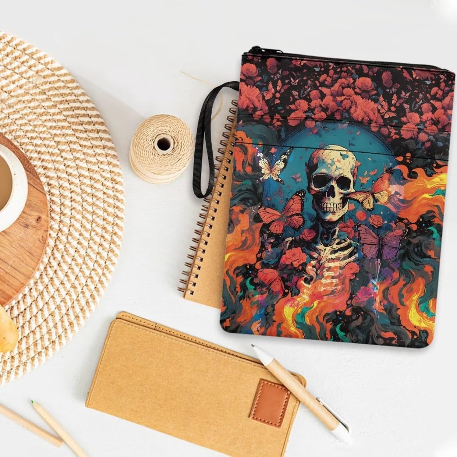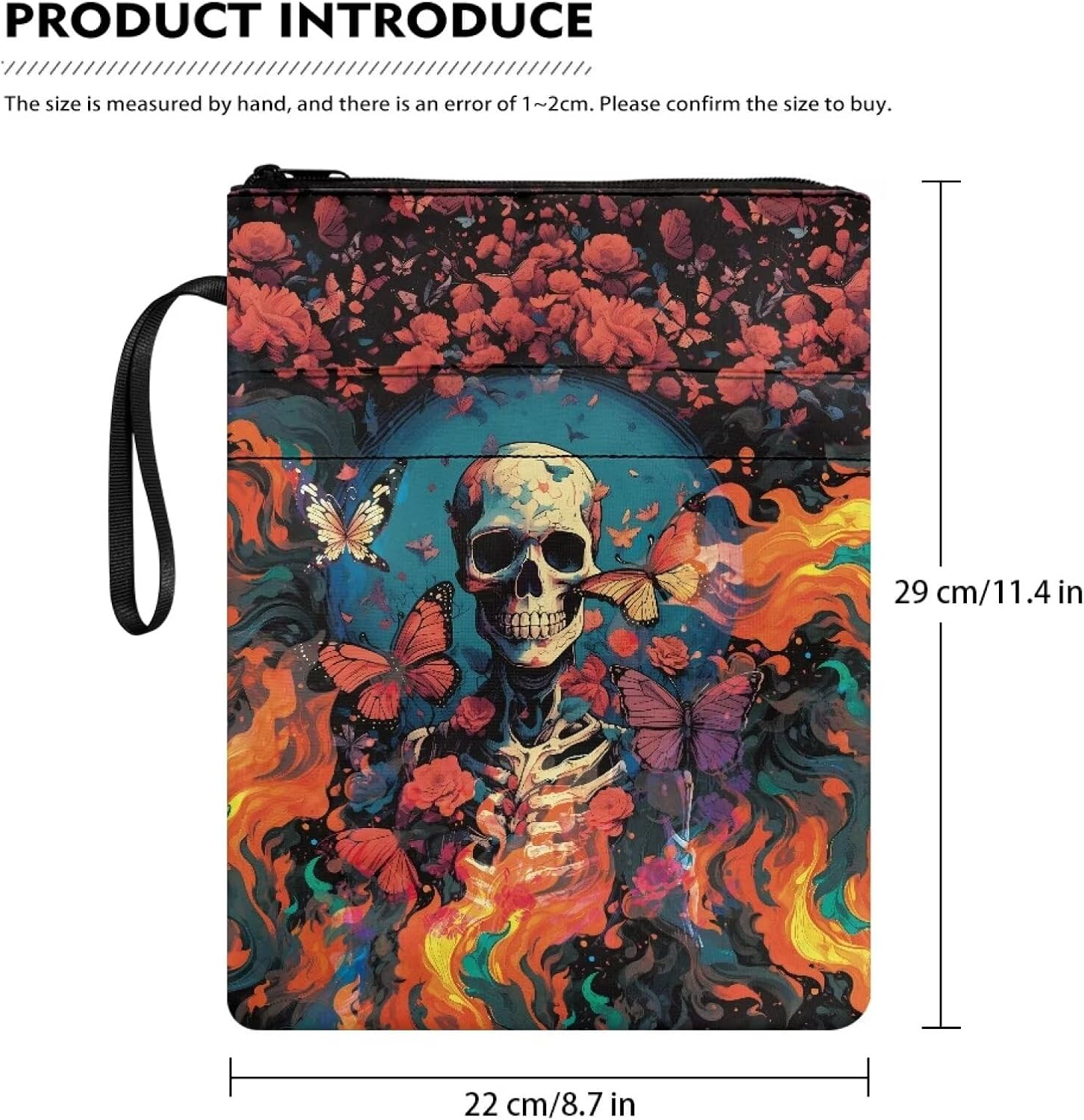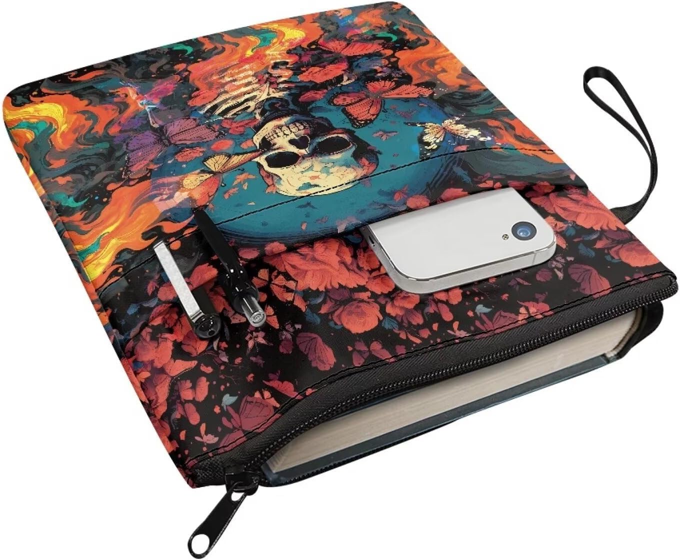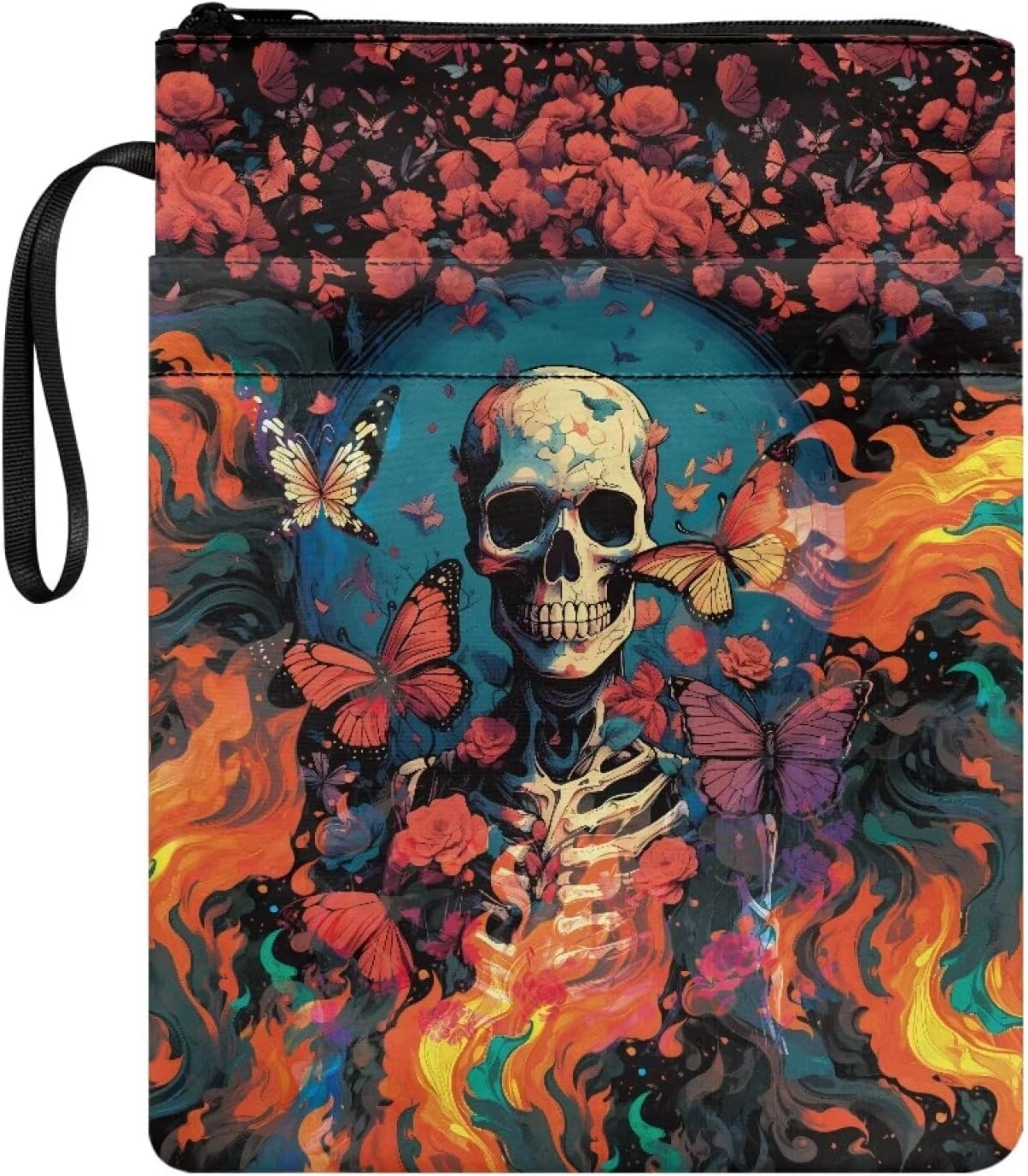 Busta libro farfalla rosa fuoco teschio stampa e tasca frontale amante regalo 29,6 x 22,6 cm libri protettore pounch con chiusura lampo