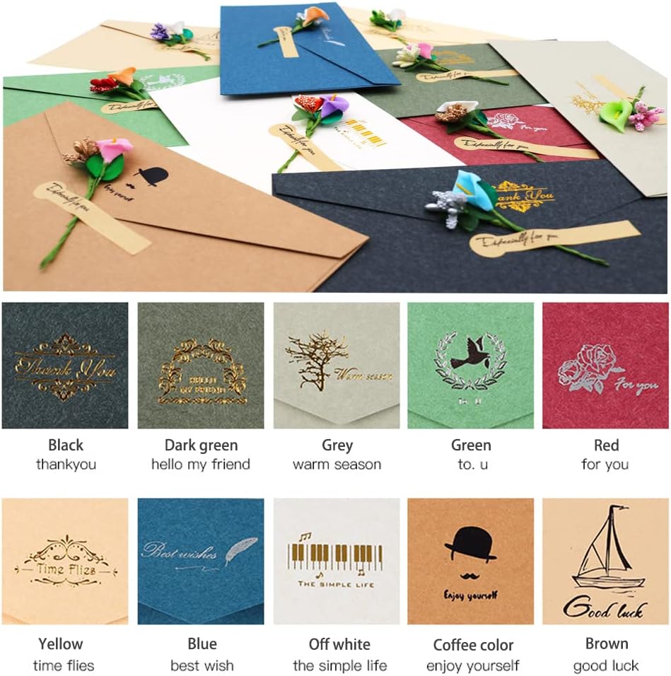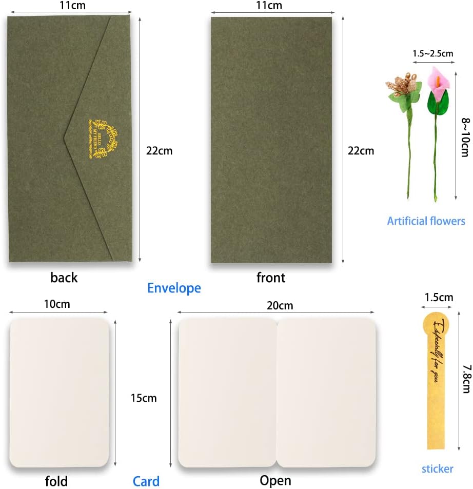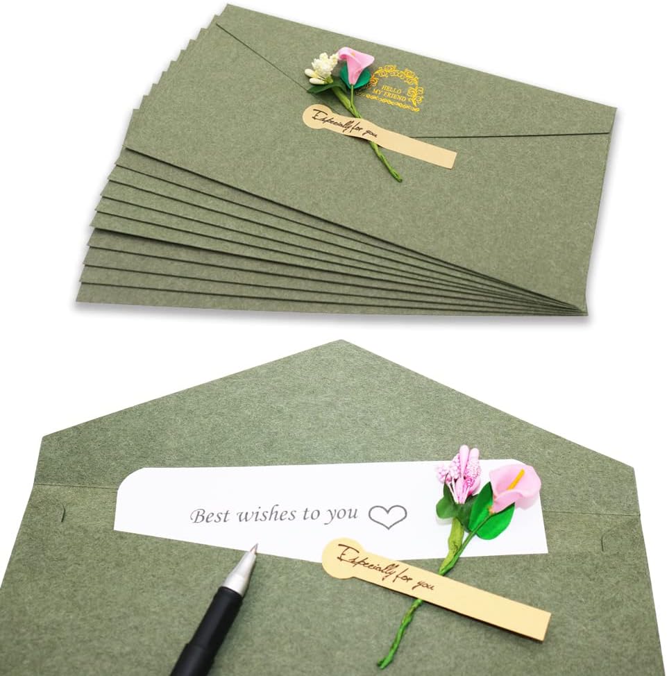 IL PACCHETTO INCLUDE:10 buste di carta kraft vintage (Verde scuro); 10 biglietti di auguri bianchi vuoti;20 fiori secchi (stile e colore casuali);10 adesivi. DIMENSIONI:busta (22x11 cm),biglietto di auguri (aperto 20x15 cm,piegato a metà 10x15 cm), adesivo (7.8x1.5 cm). BUSTE:il materiale è realizzato in carta kraft di alta qualità,con uno stile retrò,con un design bianco sul davanti e un delicato motivo abbronzante sul retro;puoi usare il sigillo di cera durante la sigillatura,perché può renderlo più raffinato e retrò. CARTA E FIORI SECCHI:la carta kraft ha un disegno bianco bianco su entrambi i lati,offrendoti un sacco di spazio creativo.I fiori secchi fatti a mano sono di colore brillante,piccoli e squisiti,rendendo la tua busta più unica. AMPIAMENTE UTILIZZATO:è un set perfetto di strumenti.Può essere usato come inviti per compleanni, matrimoni,feste e biglietti di auguri per Natale,Ringraziamento e altre festività.Ovviamente è anche una normale lettera,pubblica le tue benedizioni con un francobollo.