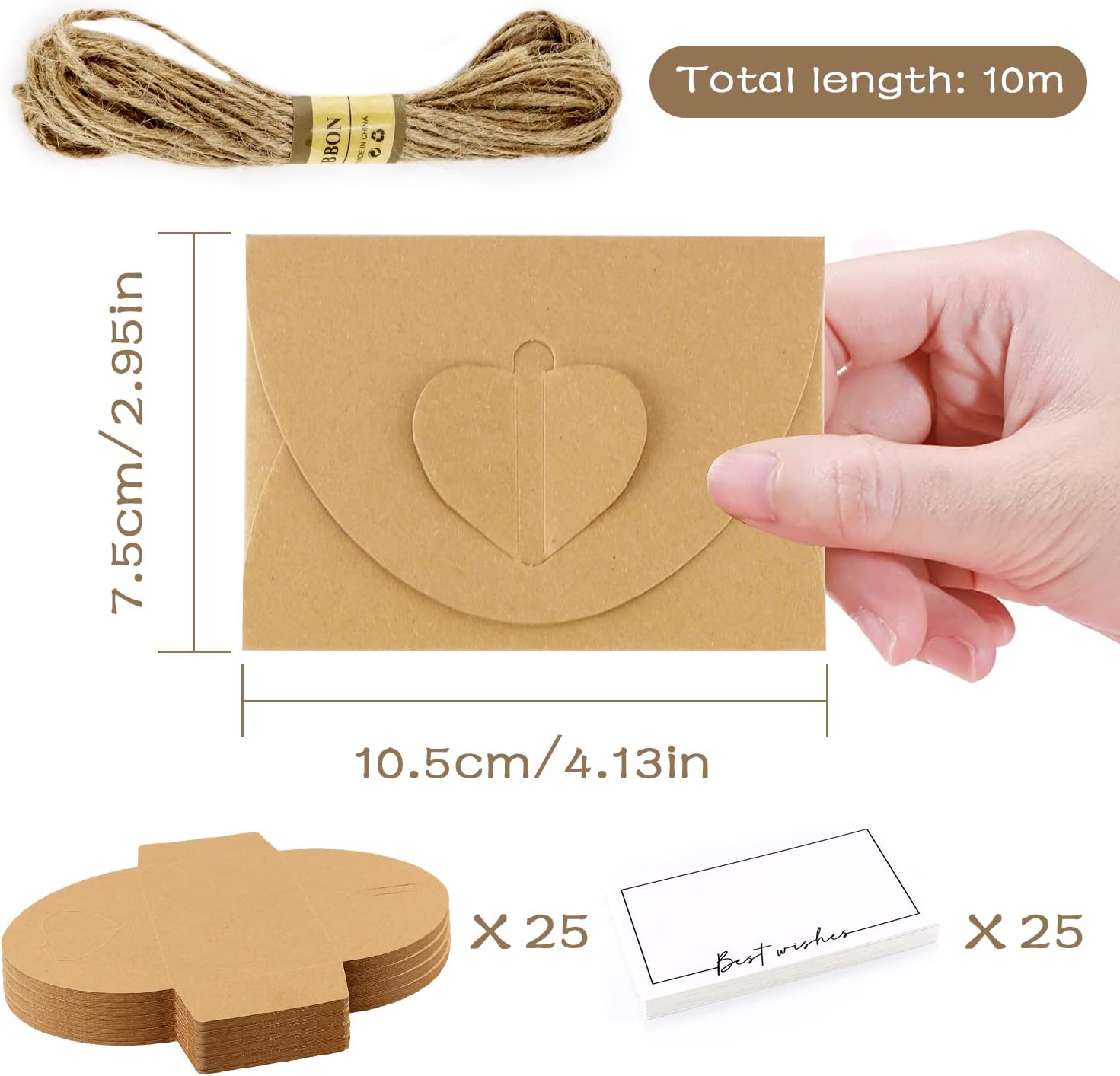 SET DI BUSTE MINI:Buste di carta kraft vintage da 25 pezzi con chiusura a cuore + 25 carte di carta bianca.
