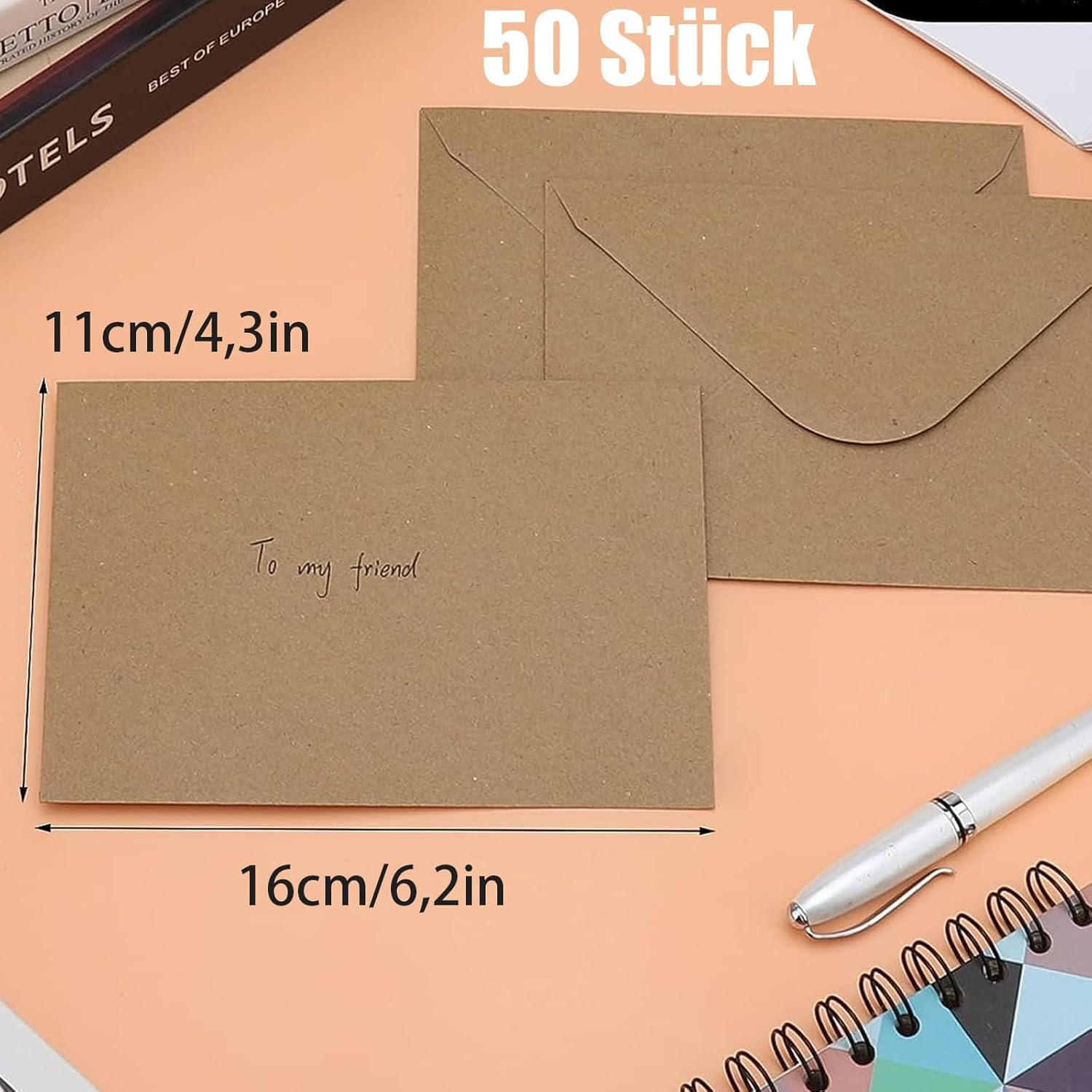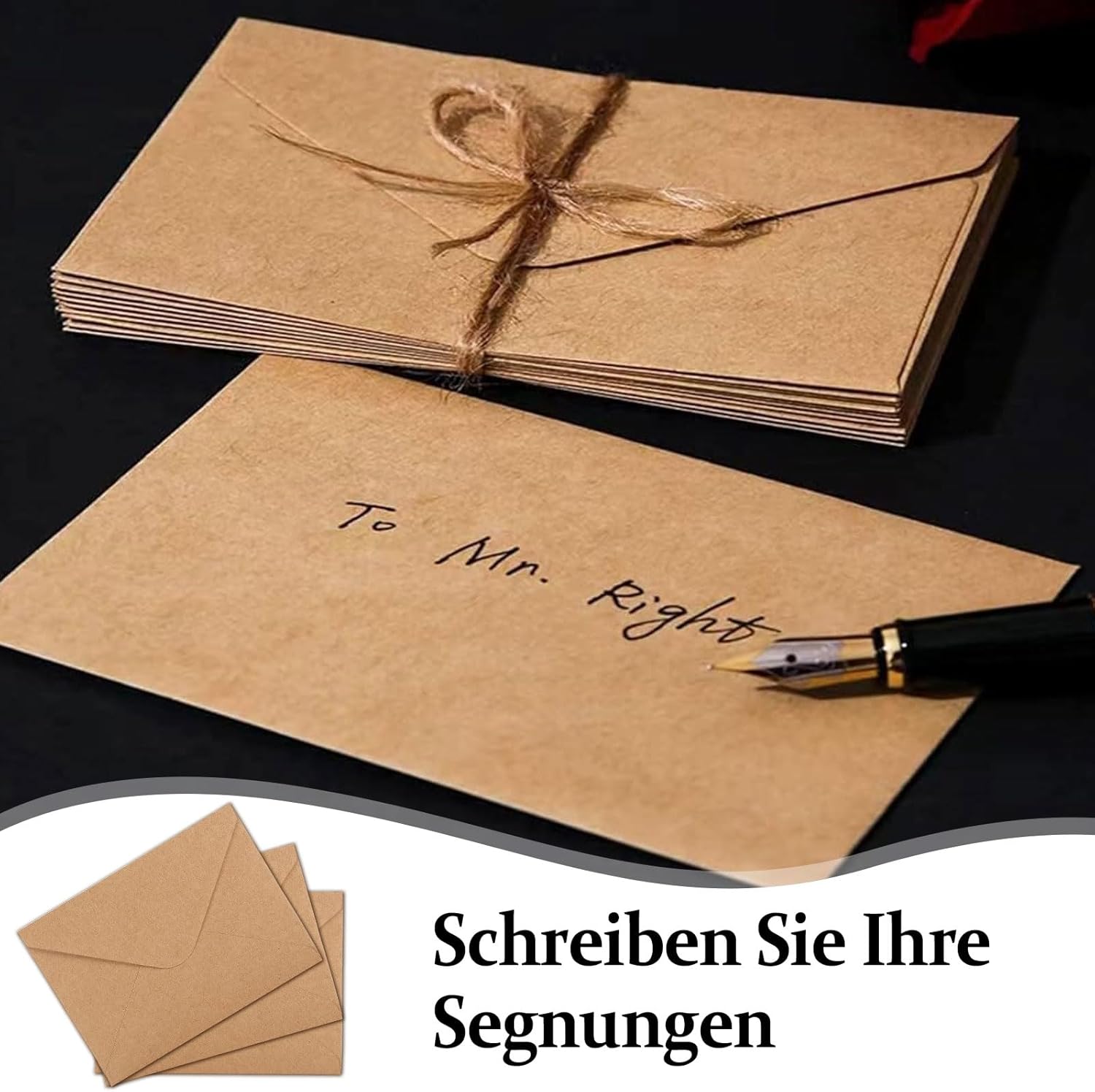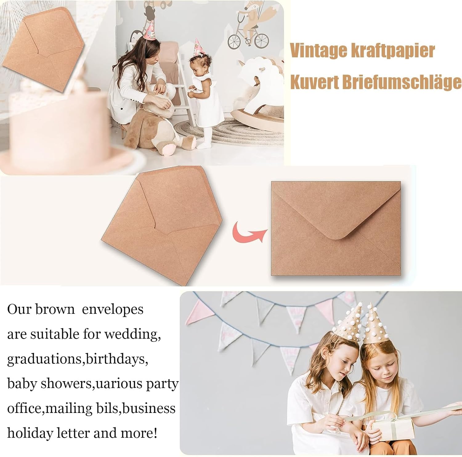 Il set di buste Kraft contiene 50 buste vintage che sono sufficienti per le esigenze quotidiane. Le buste in carta kraft misurano 110 x 160 mm / 3,4 x 6,2 pollici, non solo adatte per lettere, ma anche biglietti e foto possono essere inseriti in buste. Le buste sono realizzate in carta da 140 g/m², che non si strappa o si deforma facilmente ed è piacevole al tatto. Versatile: le buste in carta kraft sono perfette per ringraziamenti, biglietti per le vacanze, inviti, lettere d'amore, annunci, cancelleria, foto e cartoline. Occasioni adatte: compleanni, matrimoni, feste, festività, eventi aziendali, banchetti e feste.