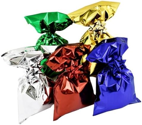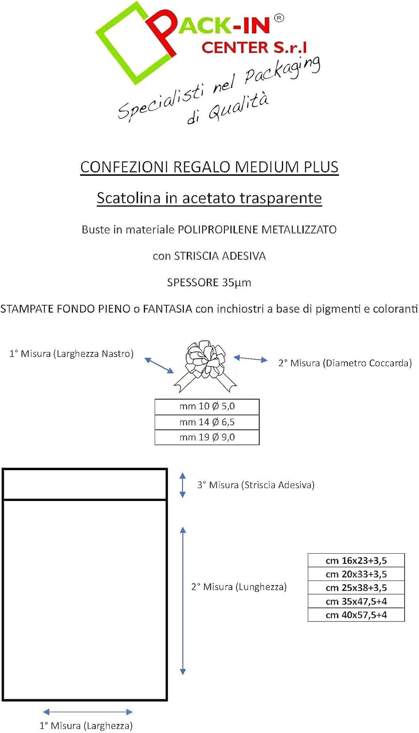 Misure Buste 5 pz per misura 1 per colore: cm 16x25, cm 20x35, cm 25x40, cm 35x50, cm 40x60 Misure Coccarde: 5 pz mm 10, 10 pz mm 14, 10 pz mm 19 Materiale Polipropilene Metallizzato 35µm con striscia adesiva per la chiusura agevolata del pacco Confezione da 25 Buste in 5 misure + 25 Coccarde in 3 misure, confezionate in una scatolina di acetato trasparente Colori delle Buste: ORO, ROSSO, VERDE, BLU, ARGENTO. Colori delle Coccarde: ORO, ROSSO, VERDE, BLU, ARGENTO.