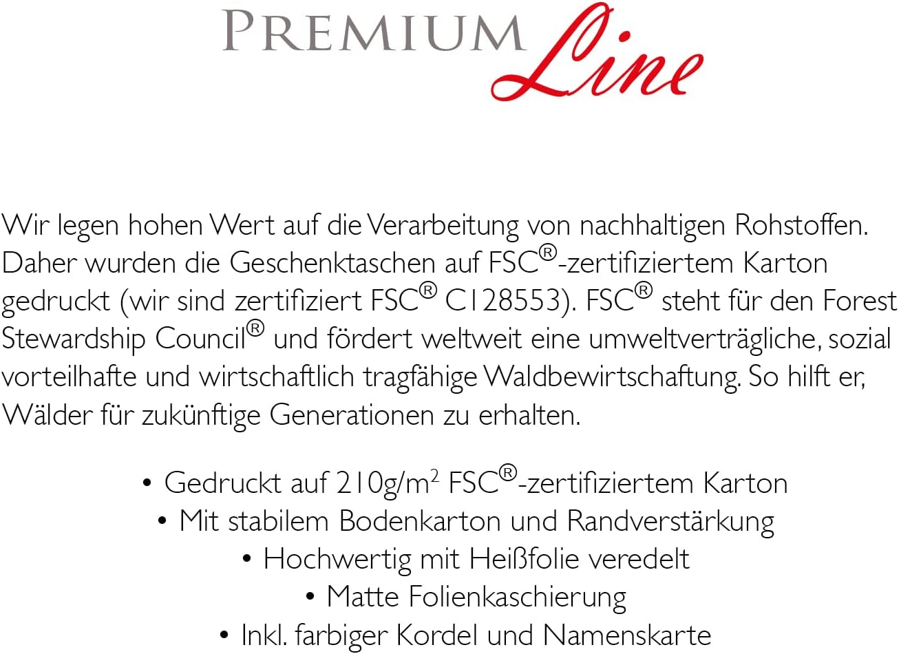 QUALITÀ PREMIUM - Fornitura: 6 sacchetti regalo di alta qualità in qualità premium DESIGN DI ALTA QUALITÀ - Rifinitura di alta qualità con lamina d'oro e laminazione opaca PERFETTO PER UN REGALO - Taglia L = Grande (26 x 32 x 12 cm) EXTRA PRATICI - Ogni borsa incl. cordoncino colorato, biglietto da visita e dispositivo Euroforo ROBUSTO - carta robusta e resistente agli strappi, spessore carta: 210 g/m²