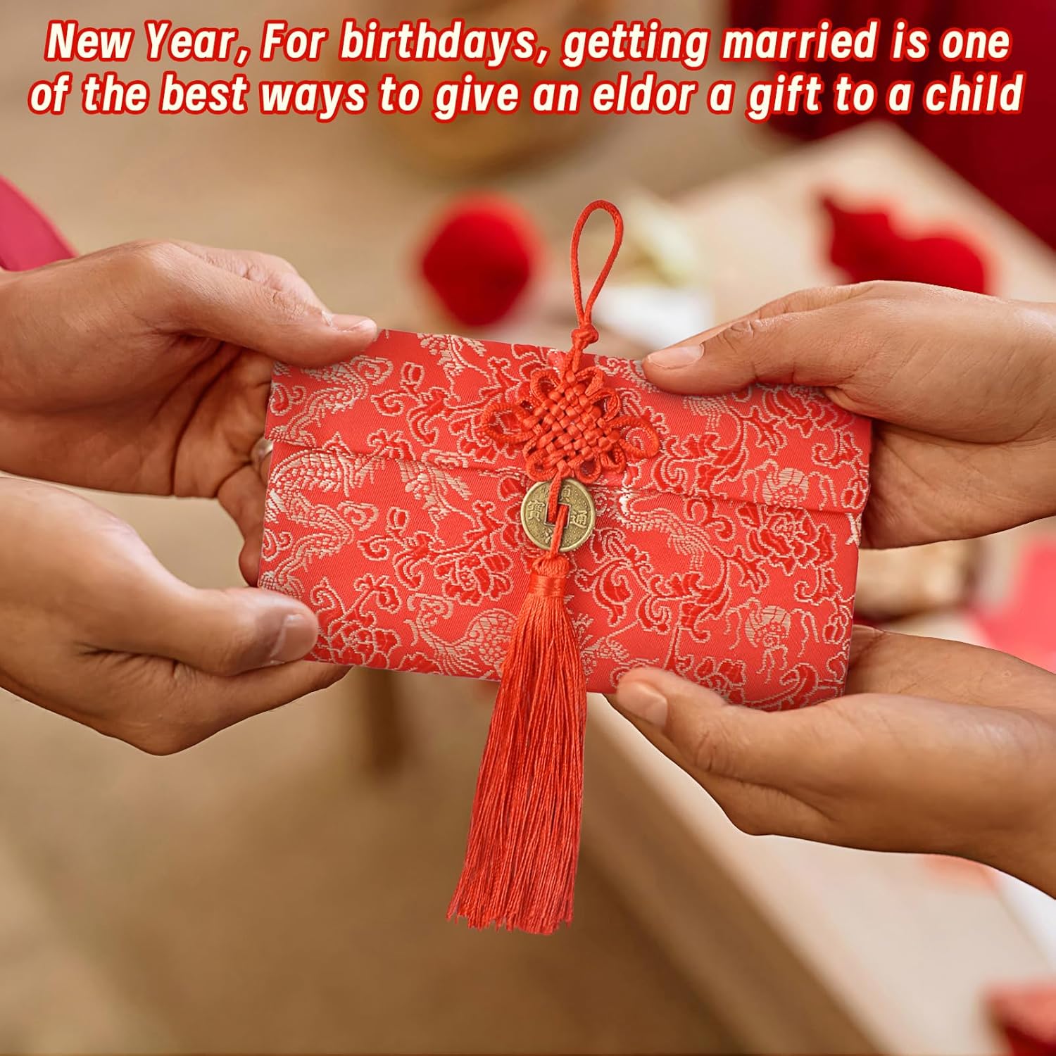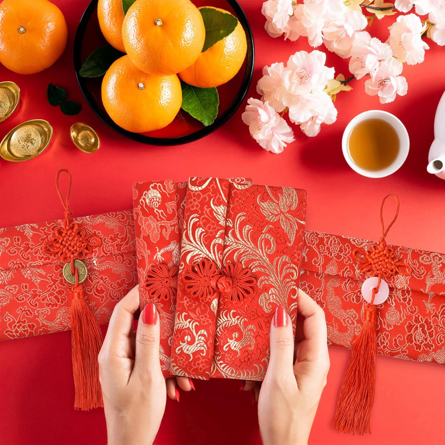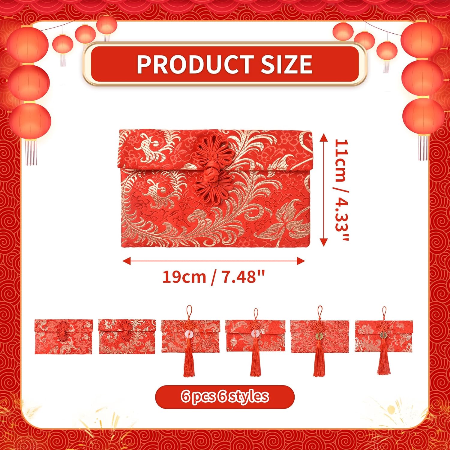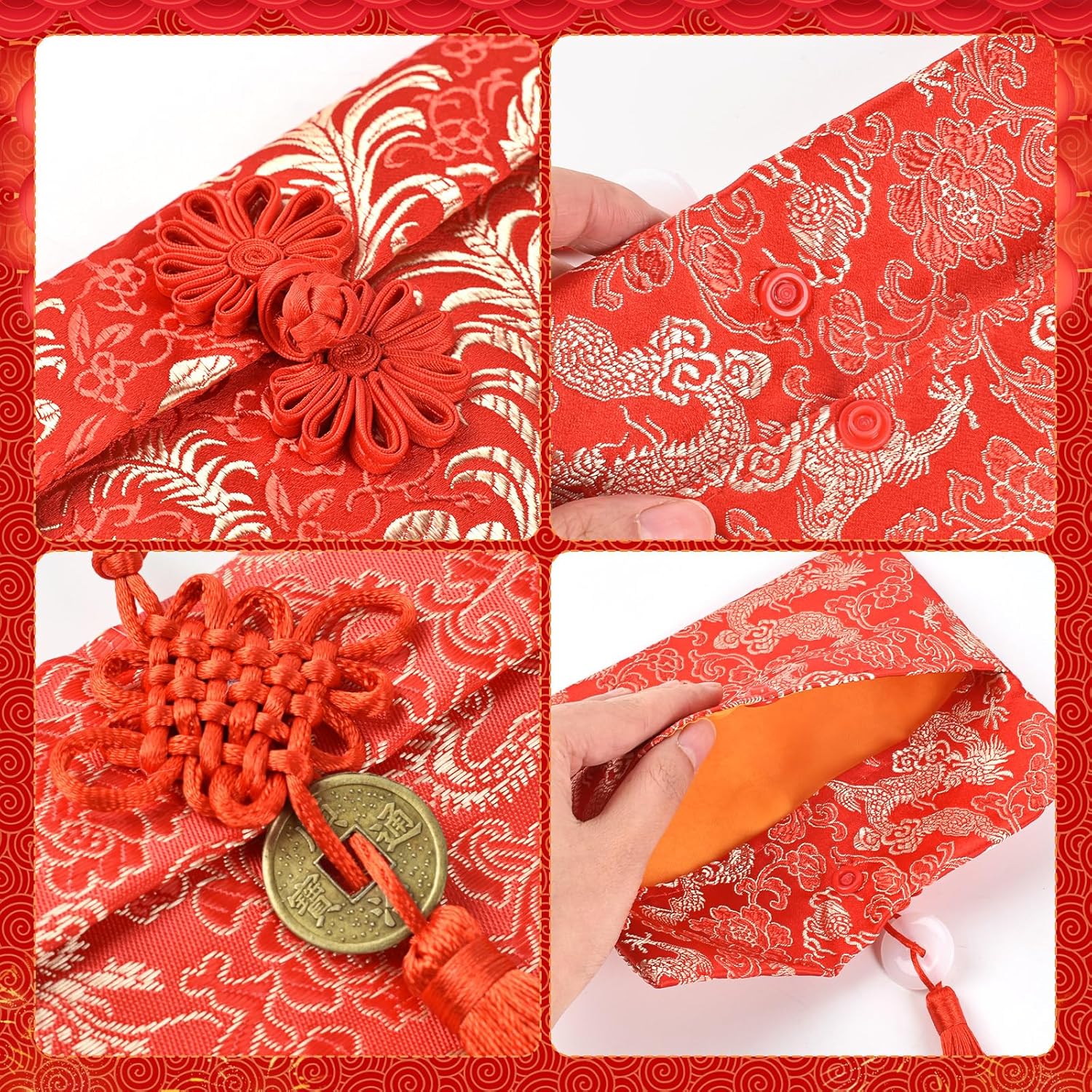 Design squisito: la busta rossa è principalmente rossa, con motivi ricamati di draghi dorati, fenici e fiori sulla superficie, che sembra più elegante e pieno di stile cinese. Materiale: realizzato in broccato, cotone e poliestere, completamente foderato in seta. Con una consistenza liscia, è possibile utilizzarli per conservare soldi fortunati o biglietti di auguri. 3 stili di pulsanti: nodo cinese, ciondolo in giada e moneta di rame. Diversi stili li rendono più diversi e classici. Grandi regali: regalare buste rosse è il modo più tradizionale per i cinesi di condividere gioia e benedizioni. Puoi mettere soldi o regali in buste rosse per trasmettere le tue benedizioni ad amici e familiari. Ampia applicazione: le buste rosse in seta sono adatte per Capodanno cinese, matrimoni, regali di compleanno, lauree, anniversari, sacchetti per gioielli o altre occasioni speciali.