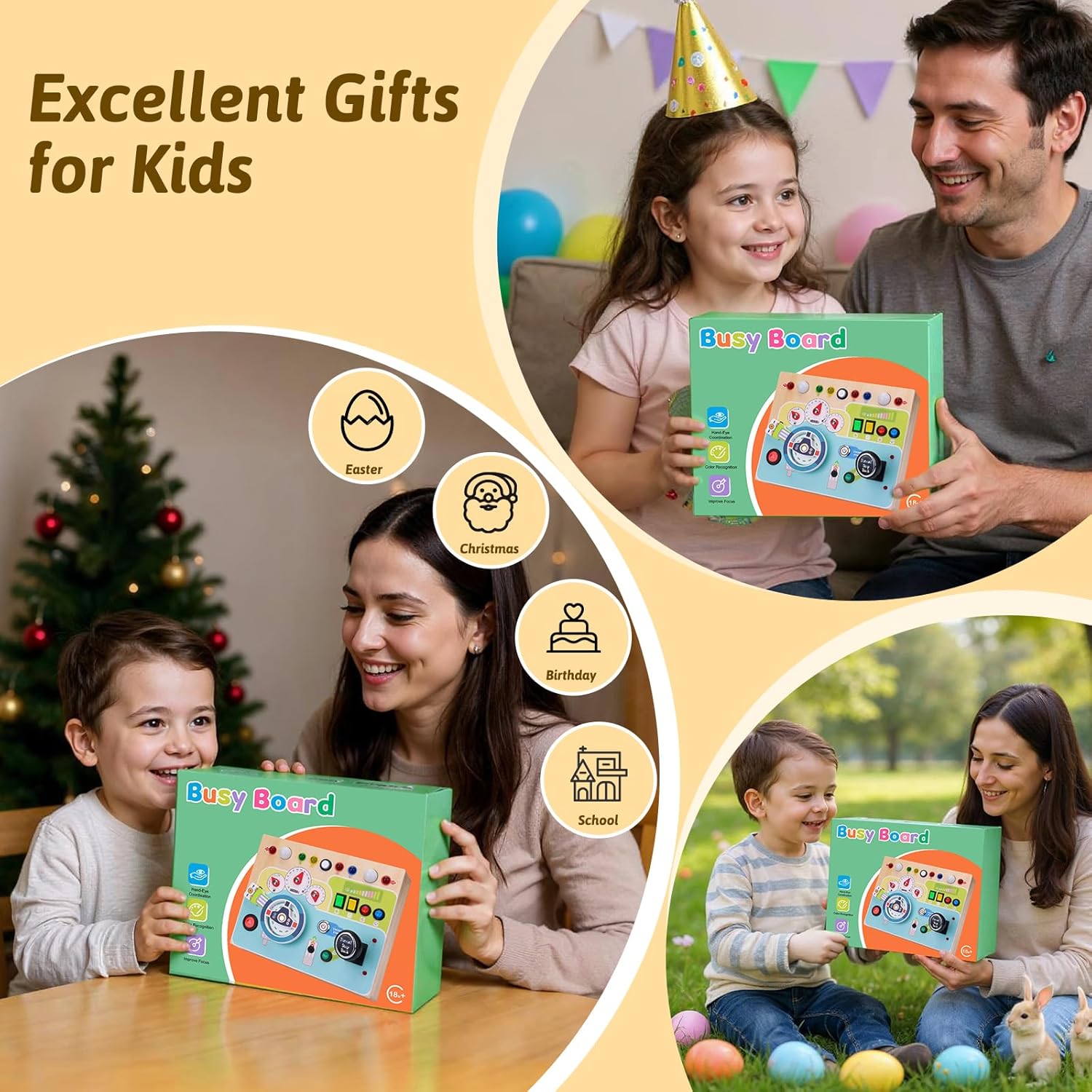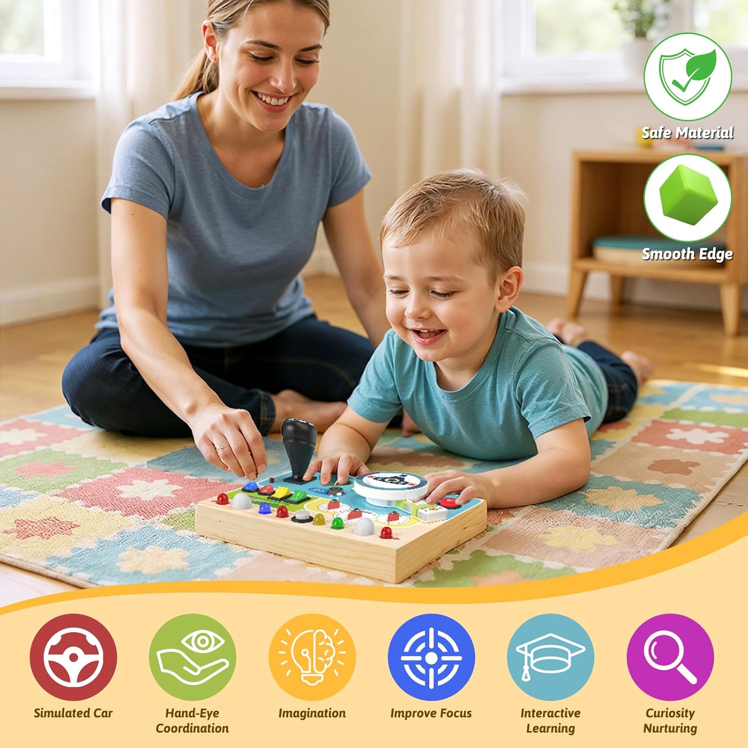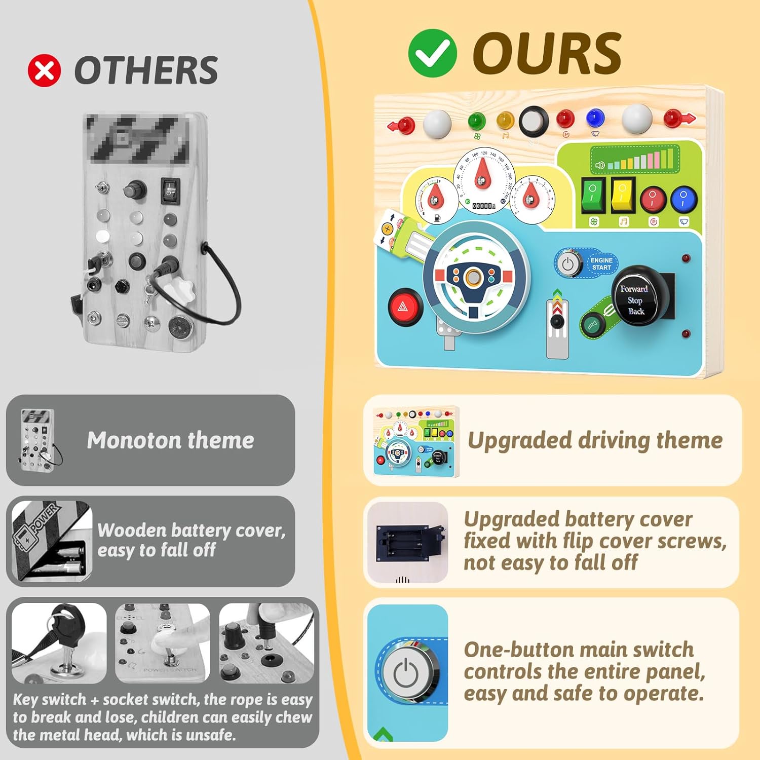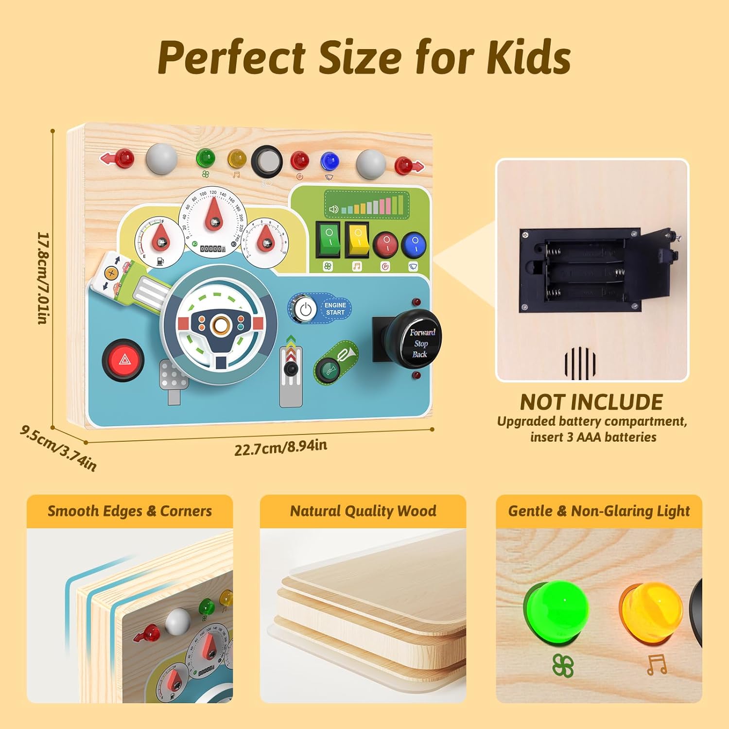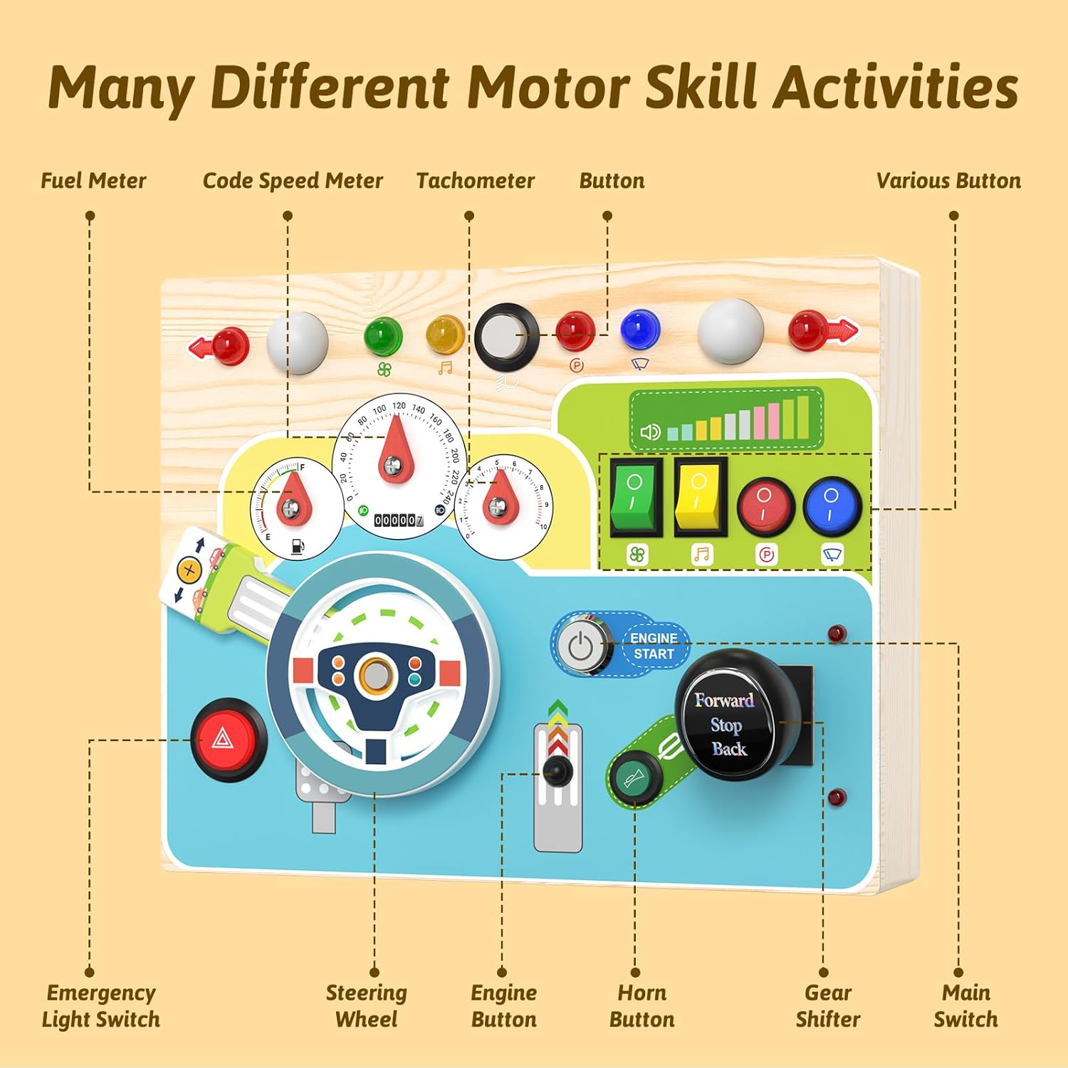 Design in stile aggiornato: questa plancia busy sposta l'auto su una piccola tavola di legno, simulando così una situazione di guida reale: interruttore di accensione, leva di comando, indicatori di direzione, luci di segnalazione, cruscotto, ecc. Delizia il tuo bambino con diversi effetti di luce, un clacson realistico e diversi interruttori per una varietà di divertimento. La tavola activity colorata tiene occupato il bambino e l'interruttore principale garantisce sicurezza durante l'apprendimento. Giocattolo educativo: questo giocattolo in legno per attività favorisce la destrezza, la coordinazione occhio-mano e la differenza di colore del vostro bambino per le abilità motorie e il puro divertimento. Grazie al design sofisticato, tutti i bottoni a pressione hanno la dimensione perfetta per consentire ai bambini di premere facilmente. Promuove l'apprendimento precoce con questo giocattolo sensoriale. Nota: richiede 3 batterie AAA (batterie non incluse). 【Robusto e resistente】 Questo giocattolo motorio in legno ecologico con bordi lisci è durevole. Tutti i pulsanti e gli interruttori del Montessori Busy Board sono montati in modo sicuro e offrono un giocattolo sicuro e robusto per i bambini. Non devi preoccuparti che tuo figlio lo rompa ed è molto sicuro per il tuo bambino. La luce delicata protegge gli occhi dei bambini. Portatile e facile da viaggiare: questo giocattolo Montessori Busy Board misura 22,7 x 17,8 x 9,5 cm ed è facile da trasportare, perfetto per viaggiare in auto o in aereo. Questa tavola montessori intrattiene i bambini senza causare rumore e garantisce un viaggio tranquillo per genitori e bambini. Regalo perfetto per i bambini: questo giocattolo in legno Sensorik è un ottimo giocattolo Montessori per bambini, facile da premere ed è il perfetto regalo di compleanno e di Natale. Gioca con i tuoi figli e insegna loro colori e dimensioni.