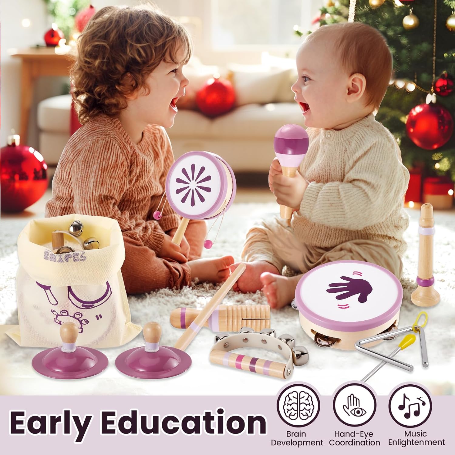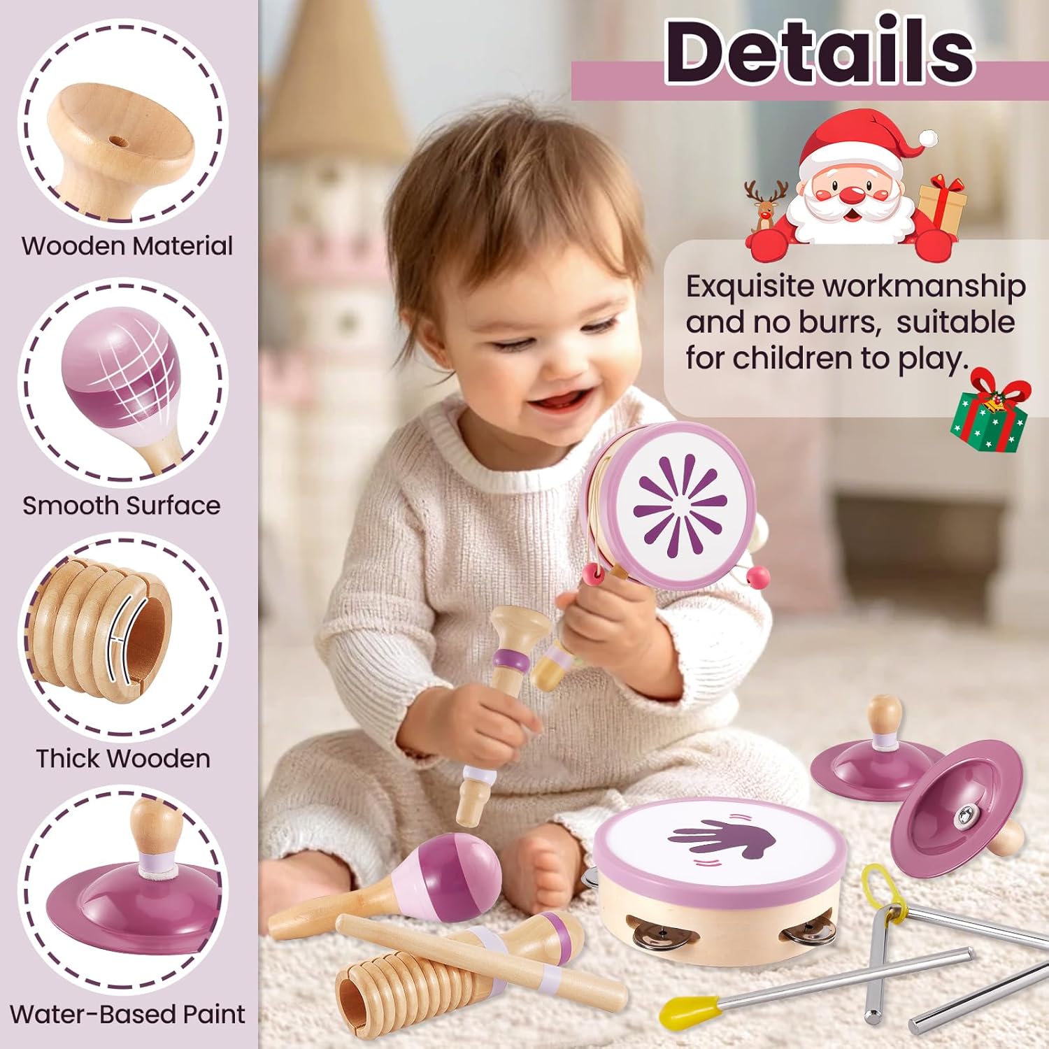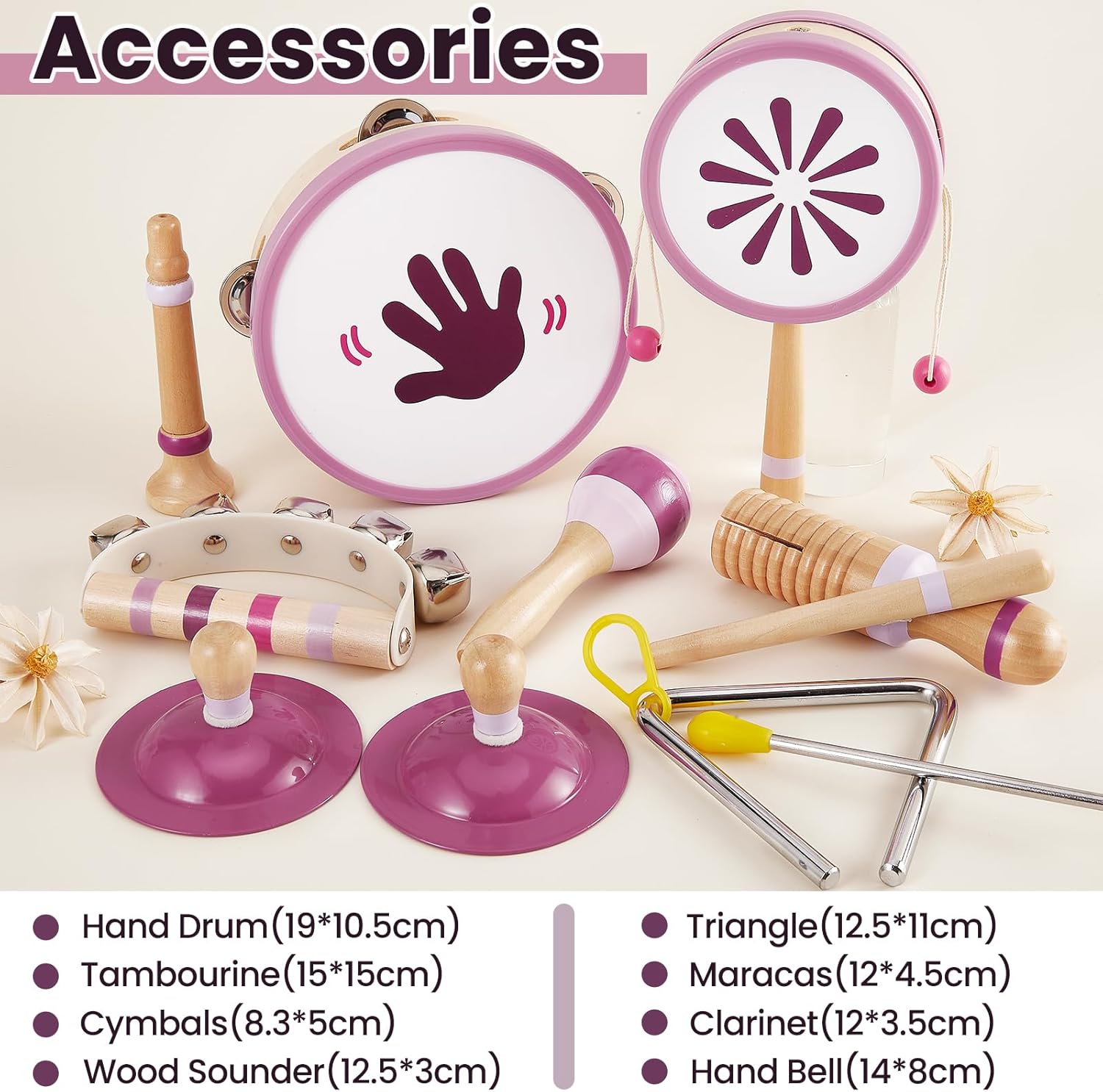Set completo di strumenti musicali: questo set di 8 strumenti per i più piccoli include piatti, campanelli, triangolo con bacchetta, maracas, tamburello, tamburo, clarinetto e tromba: tutto ciò di cui hai bisogno per stimolare l'esplorazione musicale. Ideale per introdurre i bambini a partire dai 12 mesi a ritmi, suoni e giochi creativi. Alta qualità e sicurezza: realizzato in legno naturale con superficie liscia e bordi arrotondati. Tutti gli accessori soddisfano gli standard di certificazione di sicurezza, i genitori possono essere certi che i loro bambini potranno giocare in tutta tranquillità. Giochi per lo sviluppo precoce: il bambino può sviluppare la sua discriminazione uditiva grazie ai suoni di diversi strumenti. Esercita la coordinazione occhio-mano attraverso movimenti di scuotimento/colpo. Stimola la creatività musicale e l'espressione di sé durante il gioco. Perfetto per il primo set di giocattoli musicali di un bambino. Giocattoli per interni ed esterni: con tasche con coulisse per un facile trasporto all'interno o all'esterno. I bambini possono formare un piccolo gruppo con gli amici sul prato; Gli accessori completi sono adatti come strumenti didattici. Regalo ideale per 12 mesi e oltre: confezionato in una scatola colorata pronta per il regalo. Perfetto per compleanni, Natale o come: materiale per attività prescolari/strumenti per l'apprendimento Montessori/cofanetto “I miei primi strumenti”.