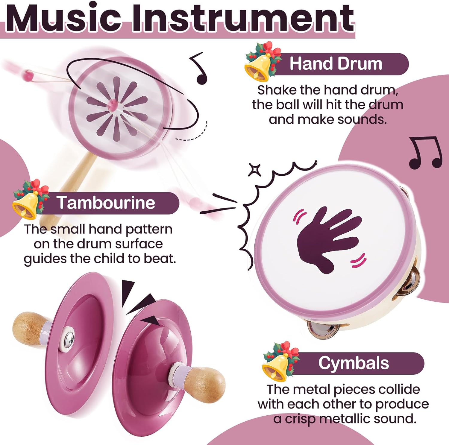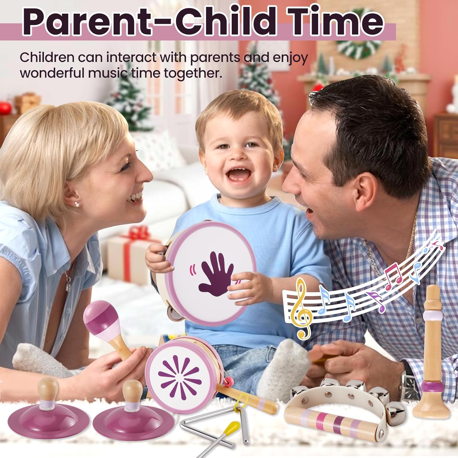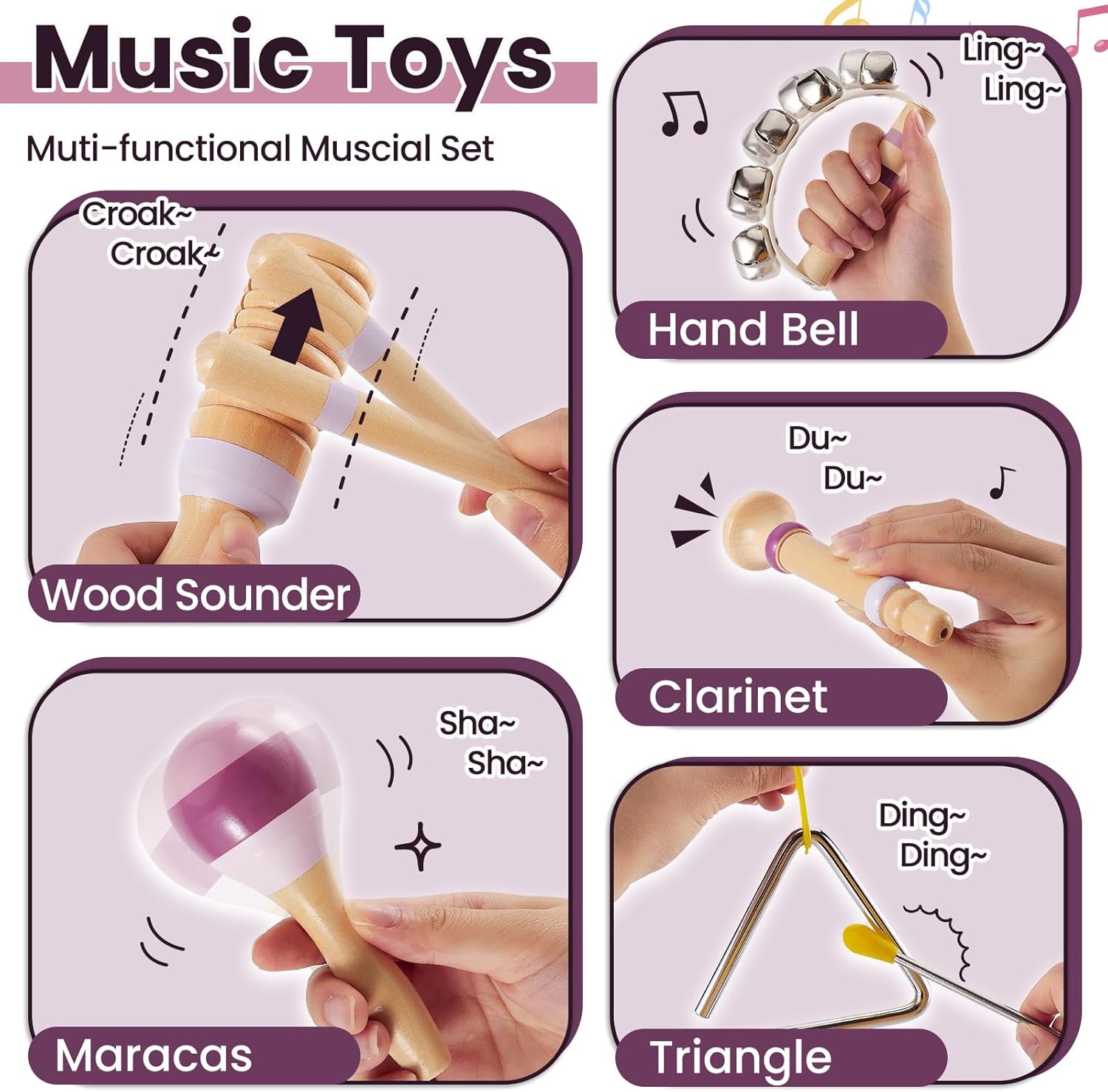 Set completo di strumenti musicali: questo set di 8 strumenti per i più piccoli include piatti, campanelli, triangolo con bacchetta, maracas, tamburello, tamburo, clarinetto e tromba: tutto ciò di cui hai bisogno per stimolare l'esplorazione musicale. Ideale per introdurre i bambini a partire dai 12 mesi a ritmi, suoni e giochi creativi. Alta qualità e sicurezza: realizzato in legno naturale con superficie liscia e bordi arrotondati. Tutti gli accessori soddisfano gli standard di certificazione di sicurezza, i genitori possono essere certi che i loro bambini potranno giocare in tutta tranquillità. Giochi per lo sviluppo precoce: il bambino può sviluppare la sua discriminazione uditiva grazie ai suoni di diversi strumenti. Esercita la coordinazione occhio-mano attraverso movimenti di scuotimento/colpo. Stimola la creatività musicale e l'espressione di sé durante il gioco. Perfetto per il primo set di giocattoli musicali di un bambino. Giocattoli per interni ed esterni: con tasche con coulisse per un facile trasporto all'interno o all'esterno. I bambini possono formare un piccolo gruppo con gli amici sul prato; Gli accessori completi sono adatti come strumenti didattici. Regalo ideale per 12 mesi e oltre: confezionato in una scatola colorata pronta per il regalo. Perfetto per compleanni, Natale o come: materiale per attività prescolari/strumenti per l'apprendimento Montessori/cofanetto “I miei primi strumenti”.