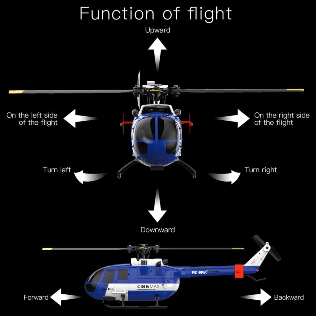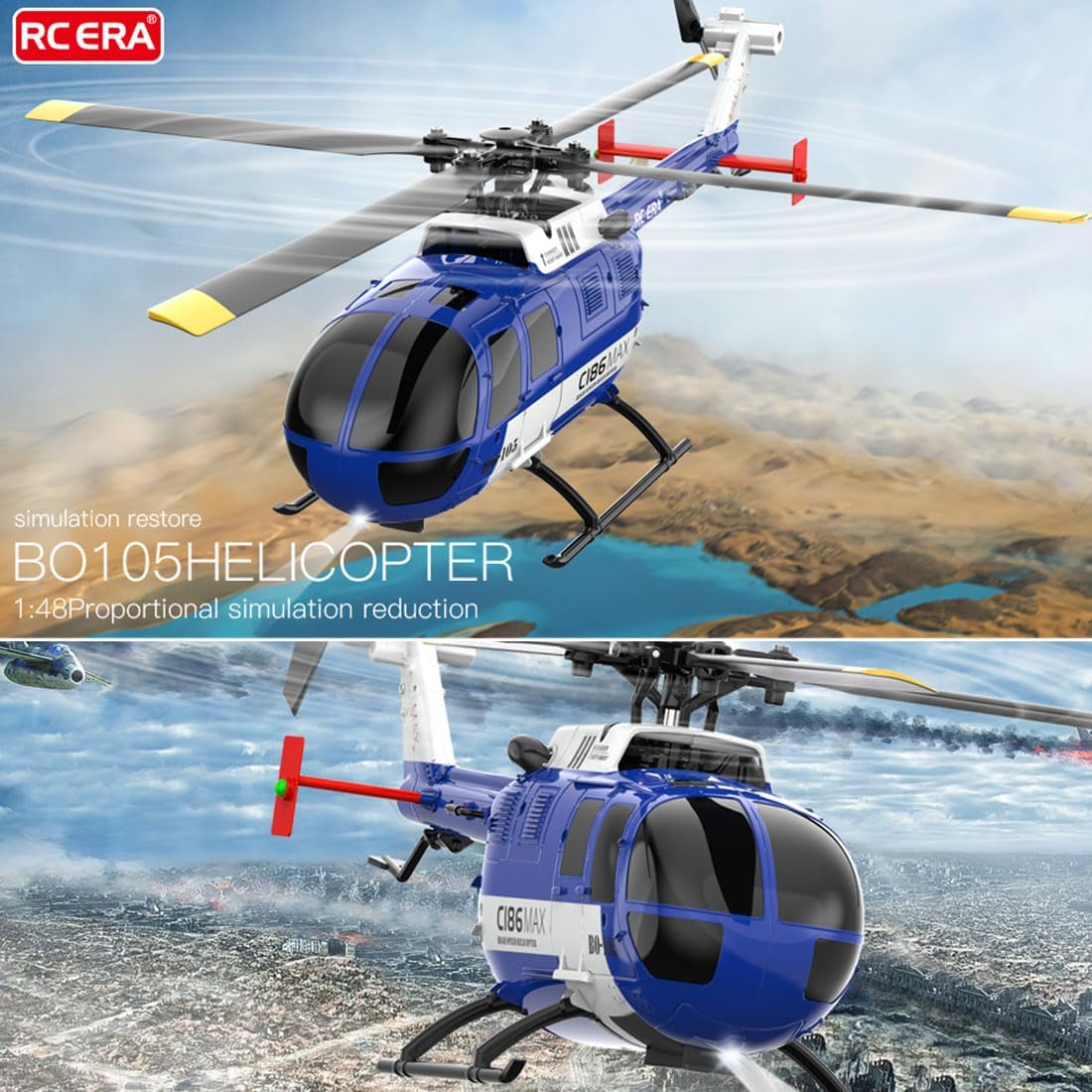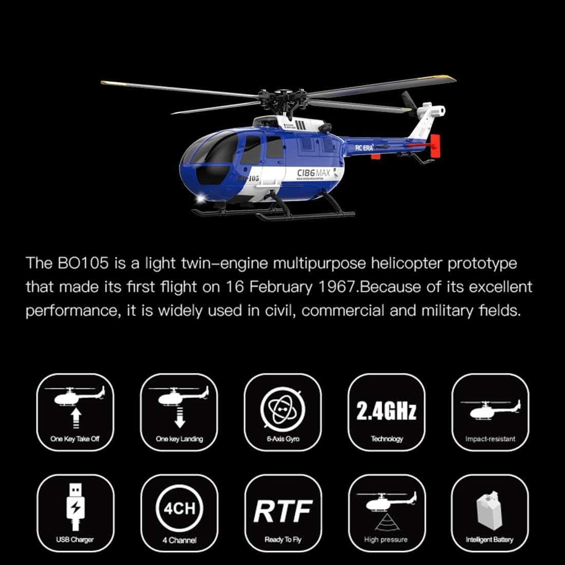 C186MAX BO105 RC Elicottero - 1:48 2.4G 4CH RTF singolo Flybarless Direct-Drive con giroscopio a 6 assi, allarme di bassa tensione, funzione One Click, Posizionamento del flusso ottico (RTF RC