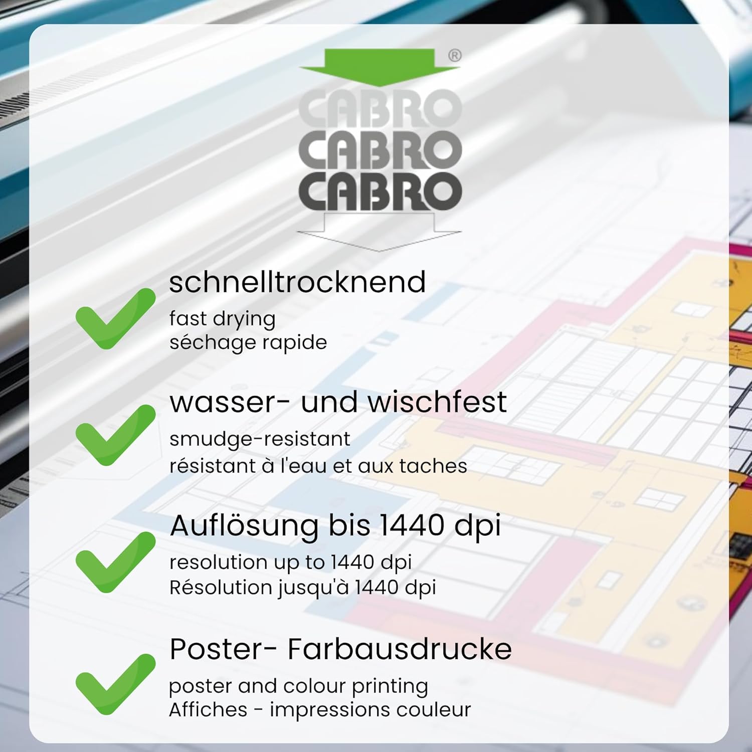 Rivestimento opaco di alta qualità: 90 g/m² per stampe ad asciugatura rapida, impermeabili e resistenti alle sbavature Extra largo: larghezza 914 mm × 46 m di lunghezza con guscio solido da 50 mm per una corsa precisa Stampa ad alta risoluzione: perfetta per poster, foto e grafica tecnica fino a 1440 DPI Compatibile con plotter a getto e cad. Eccellenti caratteristiche di scorrimento e stampa senza pieghe Resistenza del colore e set di dettagli: presentazione di colori brillanti e linee sottili con precisione Unità di imballaggio: 1 rotolo – PEZZO PER UTENTI FLESSIBILI CON PICCOLE ESIGENZE