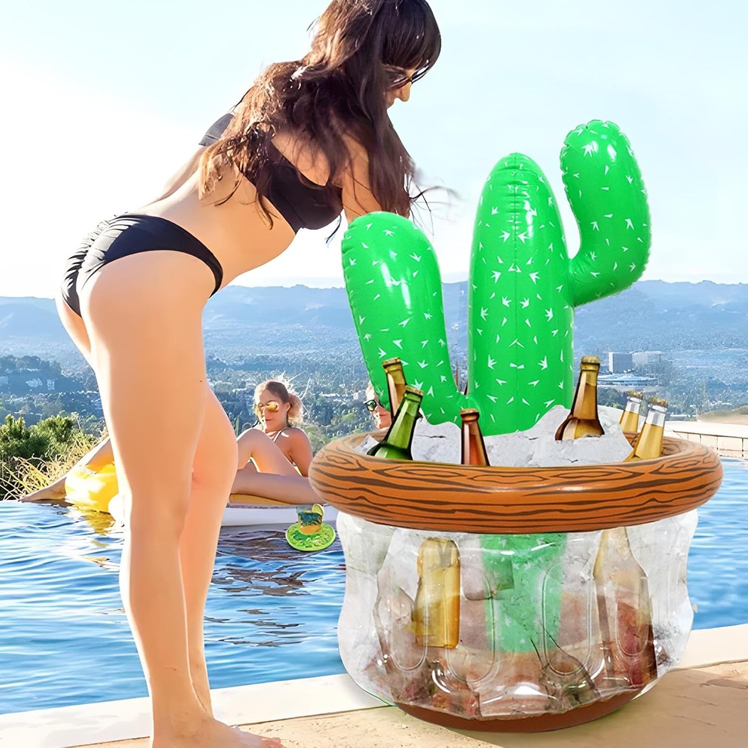Beverage Cooler Container: Effortlessly fitting a variety of bottles and cans, this multifunctional Cactus Cooler ensures your beverages stay chilled, making every party more delightful. Party Must-Have: Set your party apart with our Inflatable Cactus Ice Bucket, a practical cooler that doubles as a chic decorative piece. Adding a unique scenery to your celebration, impress your guests with this trendy must-have. Effortless Relaxation: Just inflate when using, this inflatable designed Cactus Cooler is light and easy to carry, does not take up too much space, and easy to place and store, making it perfect for any outdoors lifestyle. Hot Weather Savior: Quench your thirst and stay cool on sweltering days with our Cactus Cooler. Its 72cm height and 49cm diameter water storage barrel ensure a high-capacity stream of refreshing relief. Wide Applications: Ideal for pool parties and outdoor activities, this Cactus Cooler is a must-have for any social gathering, ensuring a cool, invigorating experience.