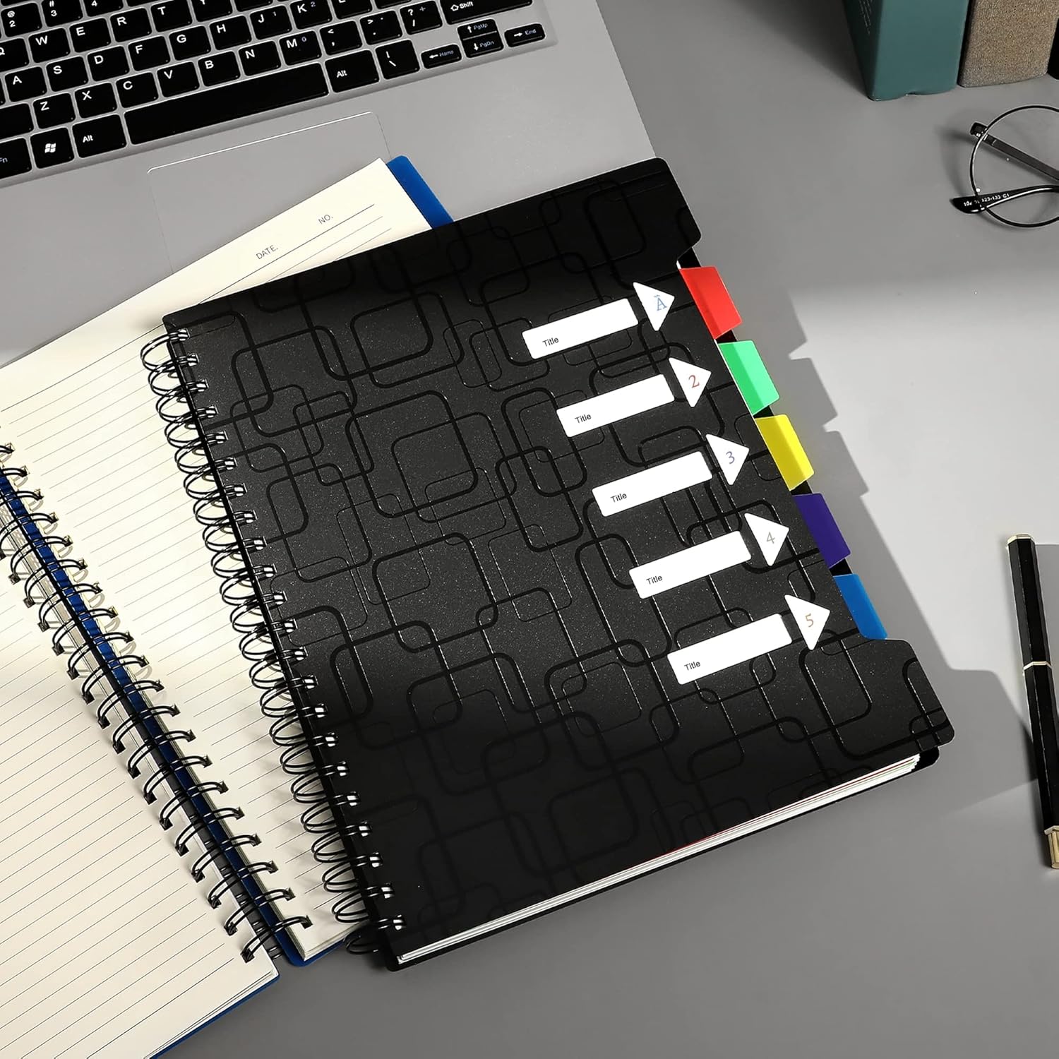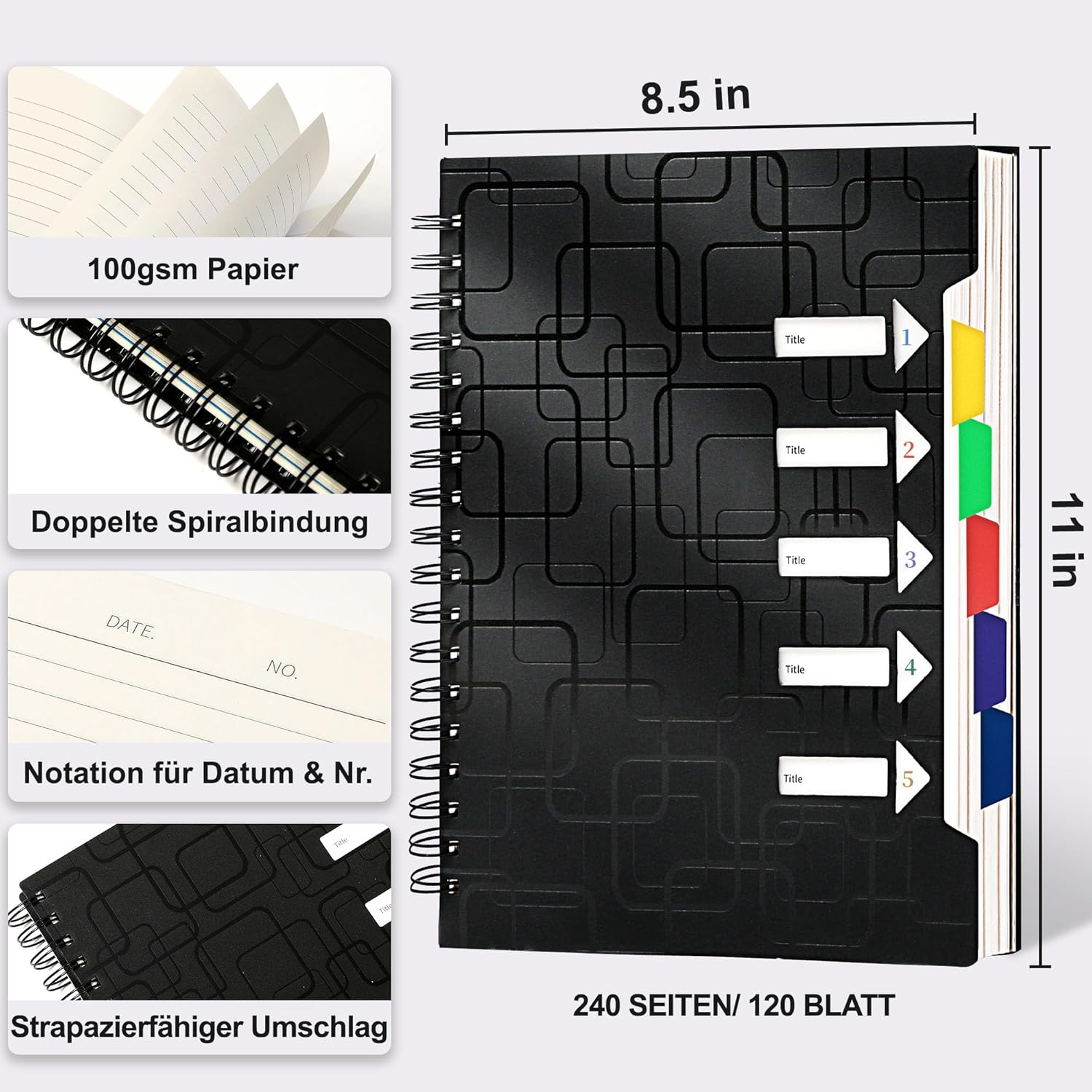 CAGIE Quaderno A4, Quaderno a spirale, 240 pagine (120 fogli), formato A4, blocco note piccolo a righe, con linguette, per lavoro, ufficio, scuola, college - Essenziali - Nero - 24 x 29 cm