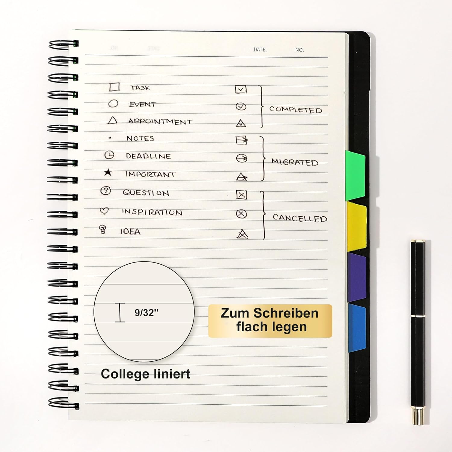Schönes Notizbuch, sieht sehr hochwertig aus, aber die Spiralbindung wird immer weiter, man kann sie dann wieder zusammendrücken, nach ein paar Tagen geht sie aber wieder auseinander. Das Deckblatt auf der RÜckseite ist schon verloren gegangen.