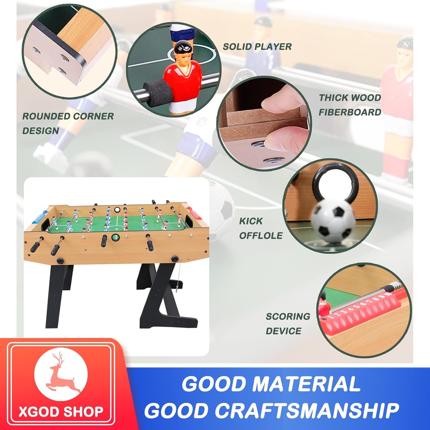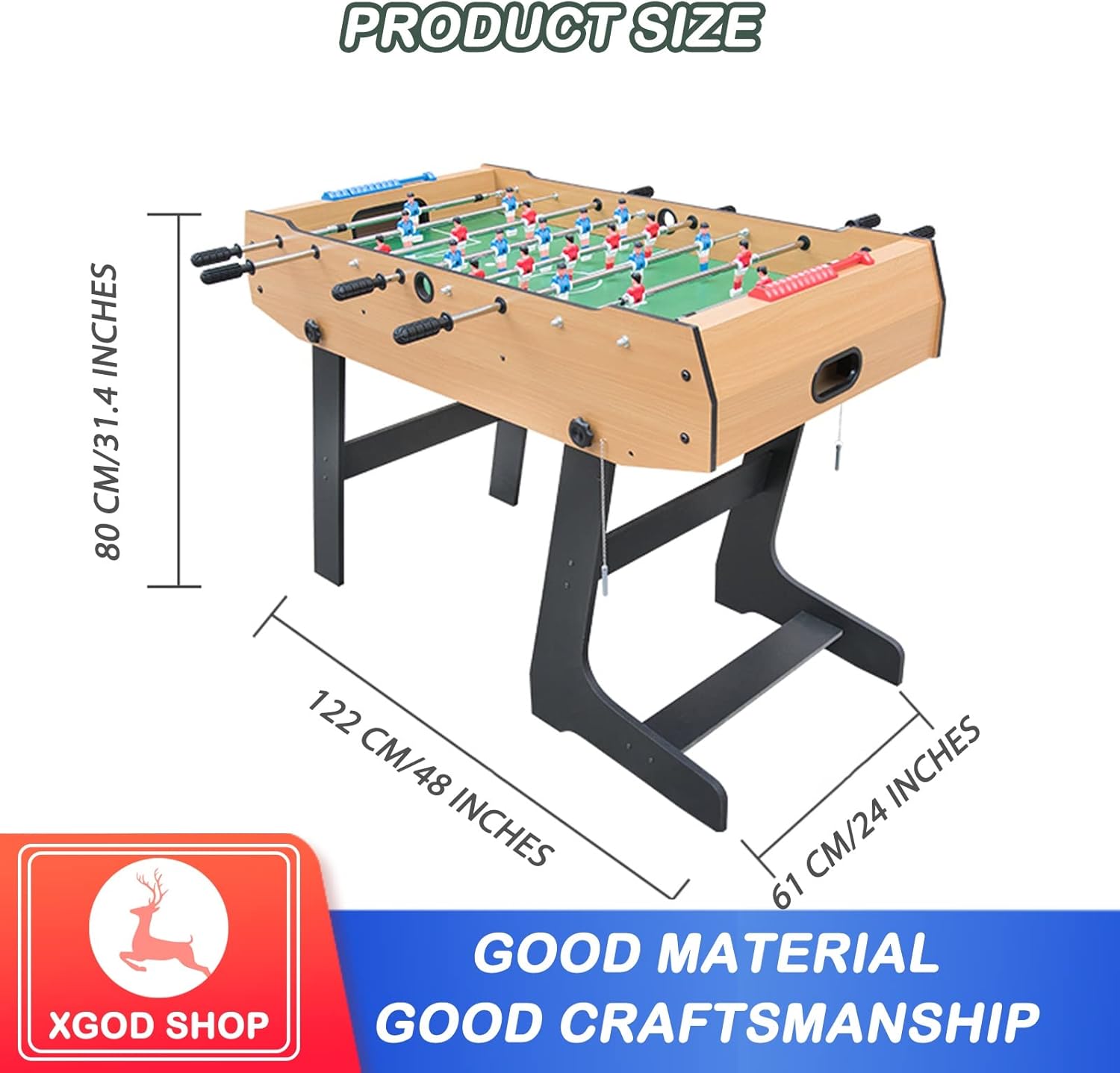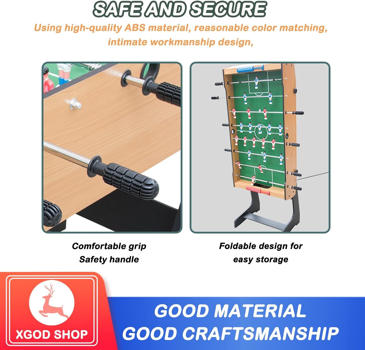 【Scelta di intrattenimento perfetta: calcio balilla】 Il calcio balilla è adatto non solo ai bambini, ma anche agli adulti. Può migliorare la coordinazione occhio-mano e stimolare l'interesse per il calcio e l'hockey. Può anche promuovere il rapporto genitore-figlio. Questa è la scelta di intrattenimento perfetta per feste e riunioni di famiglia. Questo tavolo da gioco è facile da montare e permette di godersi i propri sport preferiti in famiglia. 【Calcibalilla pieghevole per bambini】 Questo calciobalilla pieghevole può essere posizionato ovunque in casa. Il suo design pieghevole non occupa molto spazio. Puoi quindi riporlo quando non ti serve, vicino alla parete del divano, nel ripostiglio, sotto il letto. 【Calcibali da tavolo facile da giocare e da montare】 Le sei robuste aste in acciaio del biliardino da calcio scorrono fluidamente e controllano facilmente la rotazione. E i segnapunti su entrambi i lati possono facilmente contrastare il tuo punteggio. Tutti questi dettagli lo rendono uno strumento di intrattenimento ideale; questo biliardino da calcio, secondo le dettagliate istruzioni di installazione, può assemblare un calcio balilla con parti complete in 10 minuti. 【Combinazione di biliardino robusto】 Questo biliardino è realizzato in fibra di legno classica, che incarna una struttura eccellente e resistente. Grazie all'asta in acciaio cromato di grande diametro e all'impugnatura in gomma antiscivolo, i giocatori possono sempre percepire un senso di controllo, uno scorrimento fluido e un comodo controllo della rotazione.