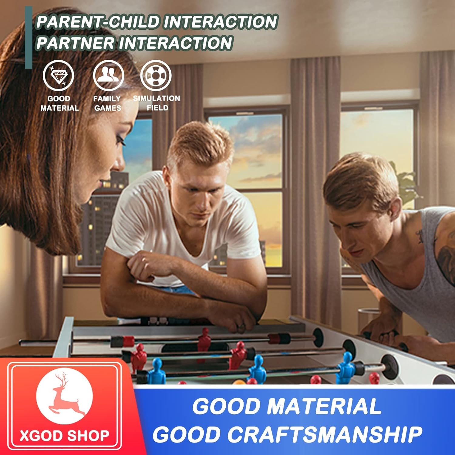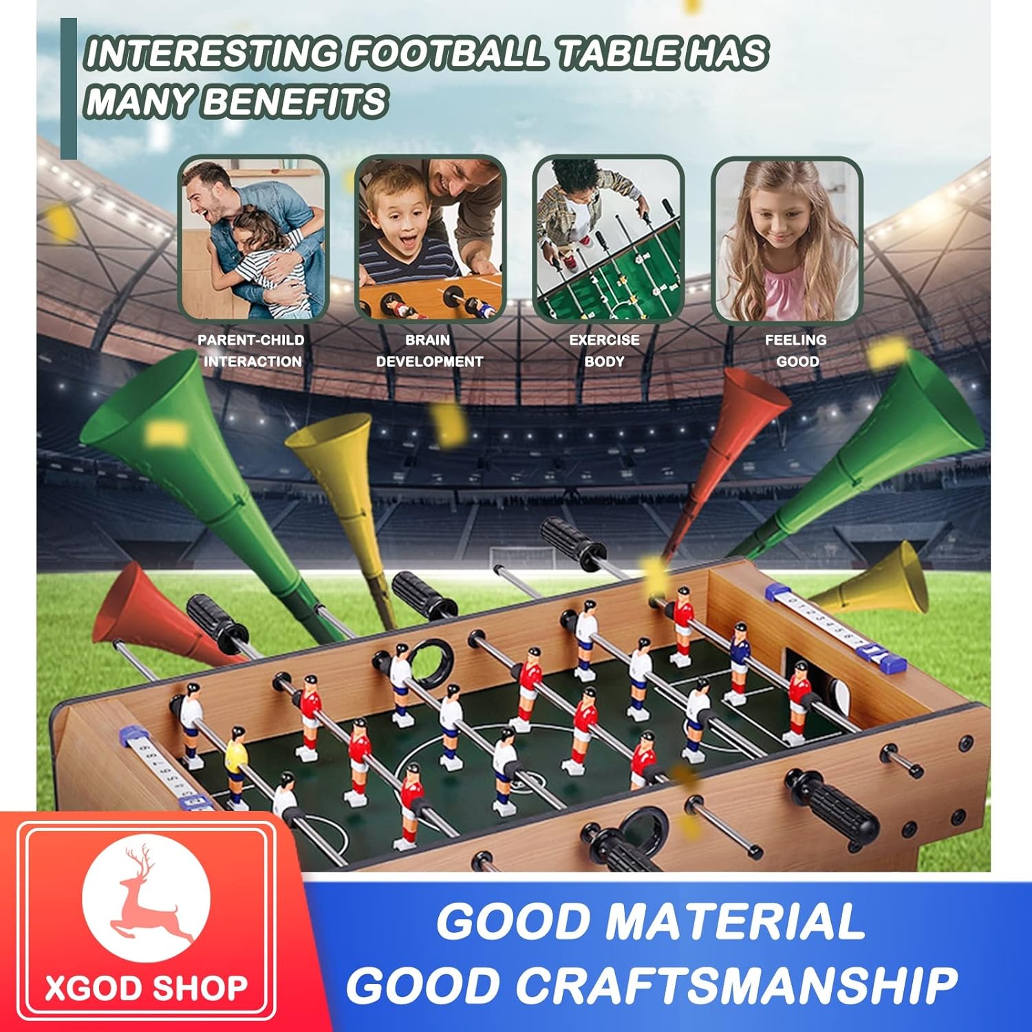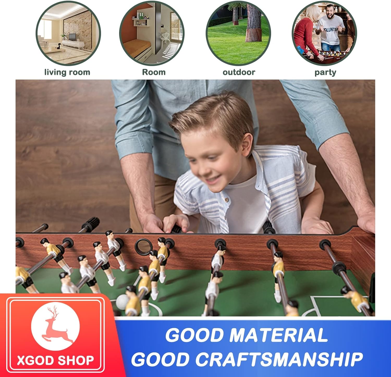 【Scelta di intrattenimento perfetta: calcio balilla】 Il calcio balilla è adatto non solo ai bambini, ma anche agli adulti. Può migliorare la coordinazione occhio-mano e stimolare l'interesse per il calcio e l'hockey. Può anche promuovere il rapporto genitore-figlio. Questa è la scelta di intrattenimento perfetta per feste e riunioni di famiglia. Questo tavolo da gioco è facile da montare e permette di godersi i propri sport preferiti in famiglia. 【Calcibalilla pieghevole per bambini】 Questo calciobalilla pieghevole può essere posizionato ovunque in casa. Il suo design pieghevole non occupa molto spazio. Puoi quindi riporlo quando non ti serve, vicino alla parete del divano, nel ripostiglio, sotto il letto. 【Calcibali da tavolo facile da giocare e da montare】 Le sei robuste aste in acciaio del biliardino da calcio scorrono fluidamente e controllano facilmente la rotazione. E i segnapunti su entrambi i lati possono facilmente contrastare il tuo punteggio. Tutti questi dettagli lo rendono uno strumento di intrattenimento ideale; questo biliardino da calcio, secondo le dettagliate istruzioni di installazione, può assemblare un calcio balilla con parti complete in 10 minuti. 【Combinazione di biliardino robusto】 Questo biliardino è realizzato in fibra di legno classica, che incarna una struttura eccellente e resistente. Grazie all'asta in acciaio cromato di grande diametro e all'impugnatura in gomma antiscivolo, i giocatori possono sempre percepire un senso di controllo, uno scorrimento fluido e un comodo controllo della rotazione.