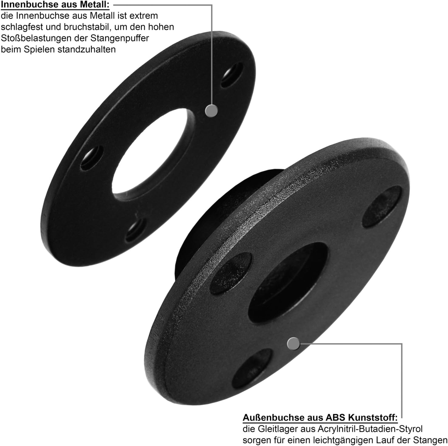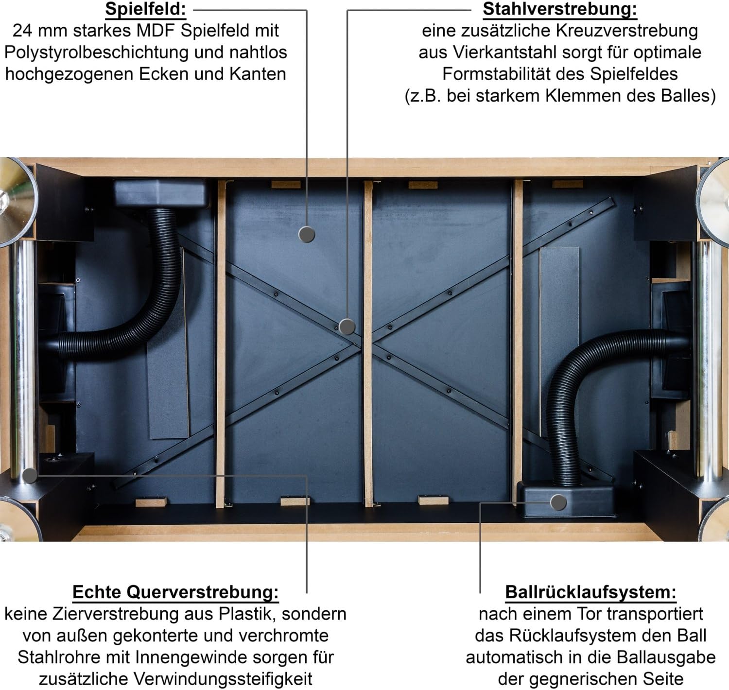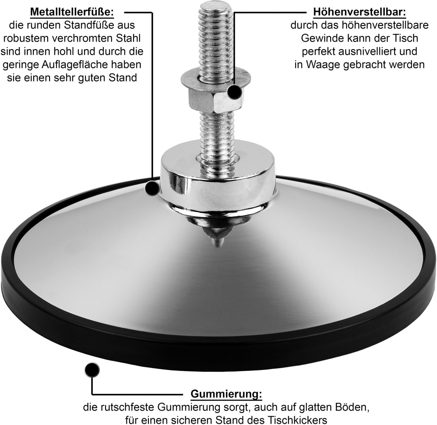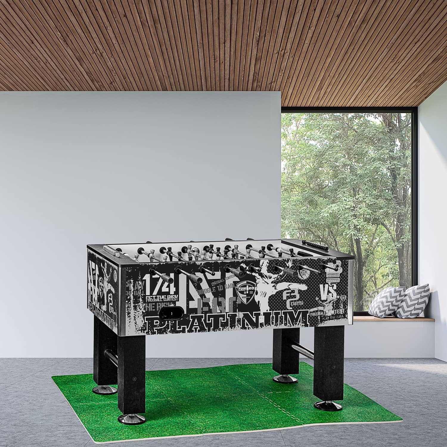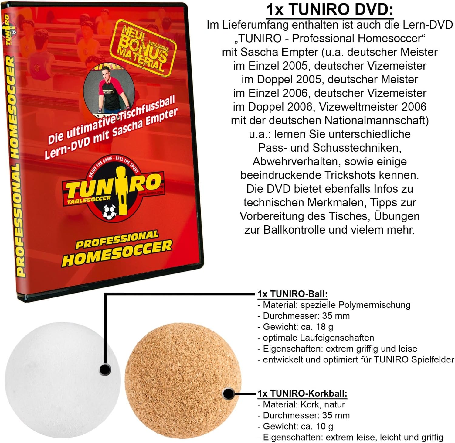Biliardino TUNIRO “BASIC” / Decoro a scelta: nero, bianco, legno, platino / Peso: ca. 75 kg / Dimensioni: 137 x 120 x 93 cm / Spessore parete: 25 mm / incl. DVD TUNIRO e 2x palline: Ø 35 mm Maniglie da biliardino “ULTRAGRIP”: forma ergonomica ed estremamente facili da impugnare / Materiale: gomma naturale Aste cave “BASIC”: leggere Peso per un minimo affaticamento delle braccia e dei polsi - ideale per principianti / Materiale: acciaio cromato (spessore: 2 mm, Ø 15,9 mm) Cuscinetto liscio "RESISTOR" con boccola interna in metallo / Figure da gioco bilanciate e saldate ad ultrasuoni con piede da calcio Consegnato tramite corriere con corpo preassemblato: tutto quello che devi fare è assemblare le gambe e le aste