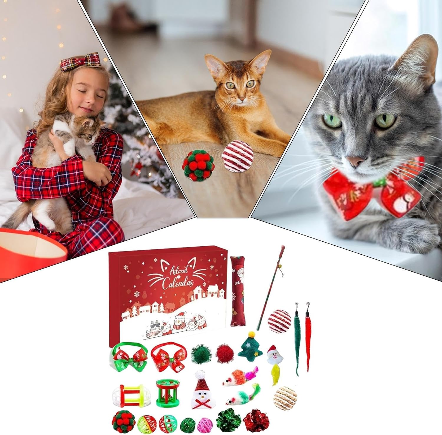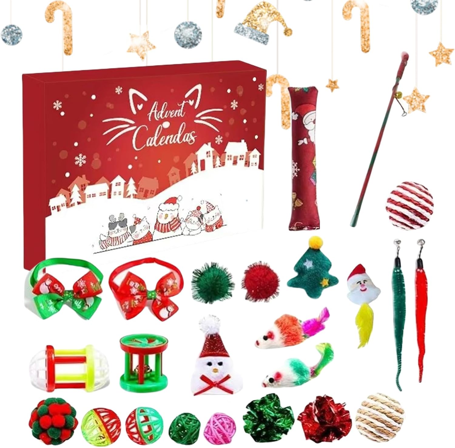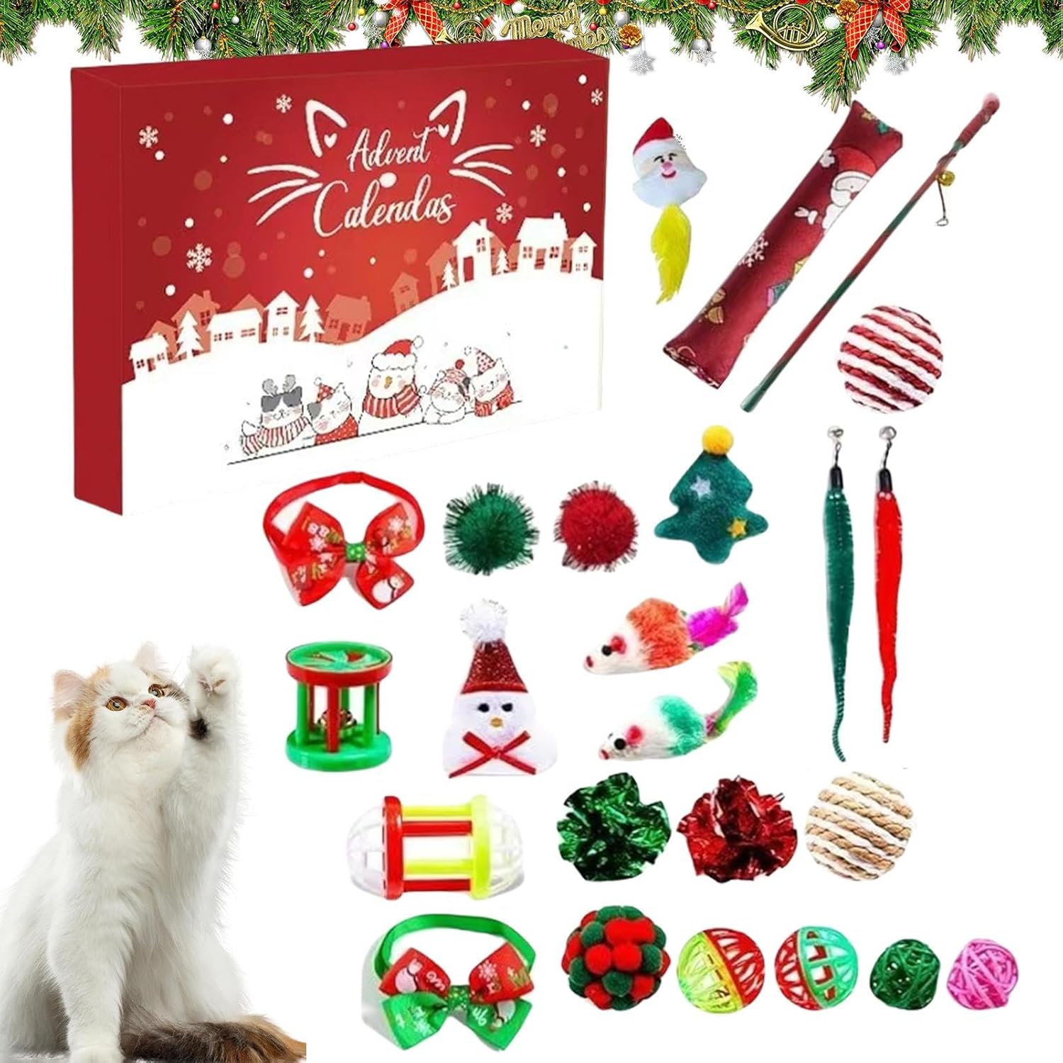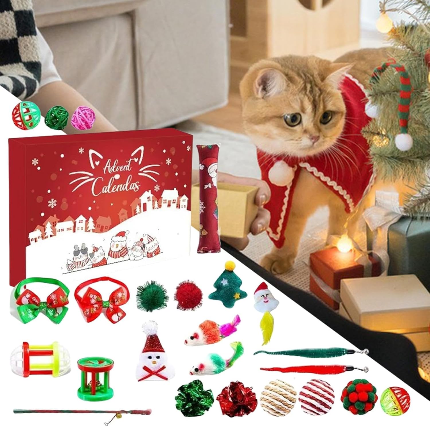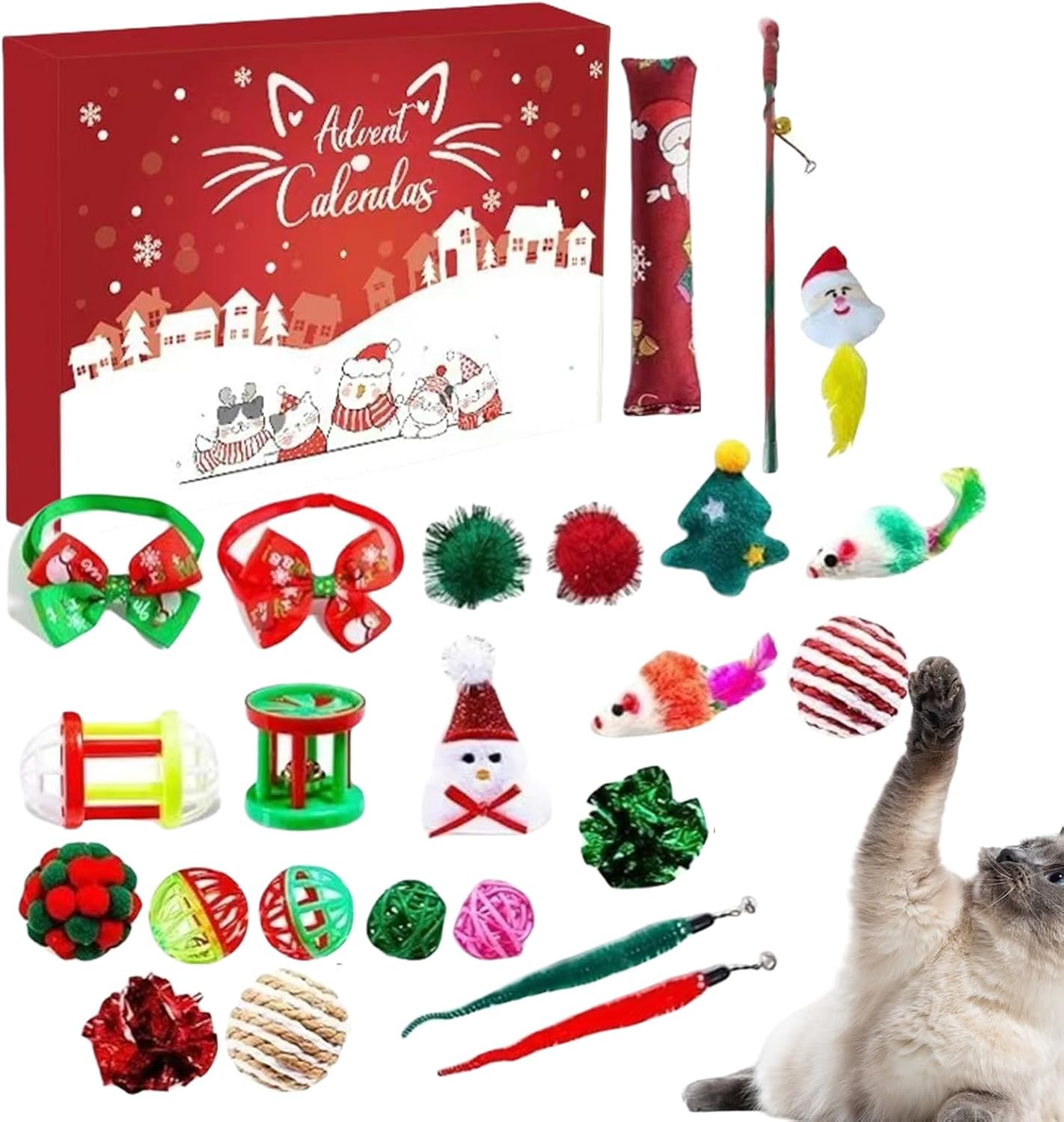 Set Gioco Vacanze Coinvolgente: Questo Calendario 'Avvento per Gatti con Giocattoli presenta una gamma di 24 giocattoli per gatti distinti, inclusi palline topo e pesci in sisal, concepiti per stimolare gli istinti di caccia naturali e incoraggiare l'esercizio quotidiano; ottimo per intrattenere i gatti con attività di gioco ttivo durante l'stagione natalizia. Attesa : Questo Calendario 'Avvento di Natale per Gatti con Giocattoli fornisce una giornaliera per i gatti con giocattoli coinvolgenti nascosti dietro ogni finestra, promuovendo eccitazione giocosa e creando momenti gioiosi mentre sviluppa l'attesa durante il conto alla rovescia di 24 giorni fino al Natale, arricchendo l'allegria in casa con divertimento quotidiano per il animale domestico. Giocattolo mente Accattivante: Progettato con tonalità festive luminose e stile cartoon adorabile, questo giocattolo per gatti calendario 'Avvento natalizio suscita l'interesse felino, fornendo intrattenimento senza fine per i gattini e completando l'atmosfera allegra e festività stagionali a casa, con design festivo che cattura l'attenzione per un gioco piacevole Qualità Materiali Sicuri: Progettato con attenzione meticolosa ai dettagli, il calendario 'avvento giocattolo per gatti utilizza materiali atossici e sicuri per garantire sicurezza e robustezza durante l'uso. Offre una fonte affidabile di intrattenimento che mantiene i gatti felicemente occupati durante le occasioni festive, con una qualità costante che assicura performance e soddisfazione per animali e proprietari in un contesto gioioso. Costruttore di Anticipazione Mattutina: Questo giocattolo calendario 'avvento per gatti stabilisce un piacevole rituale mattutino mentre i gatti esplorano con entusiasmo i 24 scomparti individuali, costruendo eccitazione e offrendo un coinvolgimento costante che rafforza il emotivo tra te e il compagno felino ogni giorno a stagione.