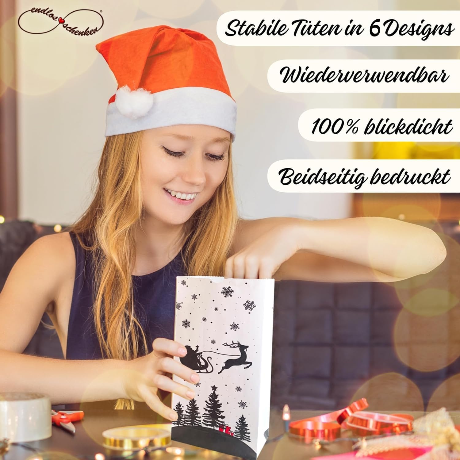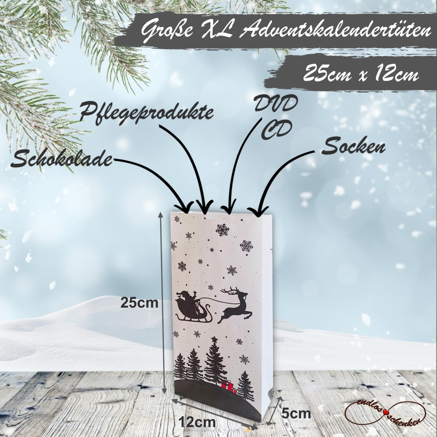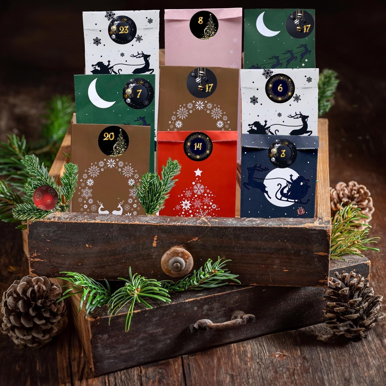 Sacchetti dell'Avvento da riempire, set completo con sacchetti di carta kraft e bellissimi adesivi. Tutto ciò di cui hai bisogno per realizzare il tuo calendario dell'Avvento fai da te è incluso. Sacchetti di carta completamente opachi con fondo quadro per poter confezionare bene tutti i tuoi regali. Puoi personalizzare il calendario natalizio con i numeri autoadesivi. Gli adesivi sono extra resistenti. Siamo un'azienda tedesca. Puoi trovare i nostri calendari natalizi fai-da-te da compilare sotto il marchio infiniteschenken. 24 sacchetti di carta kraft (25 cm x 12 cm x 5 cm) in sei diversi modelli con numeri del calendario dell'Avvento intorno, realizzati con stampa digitale di alta qualità.