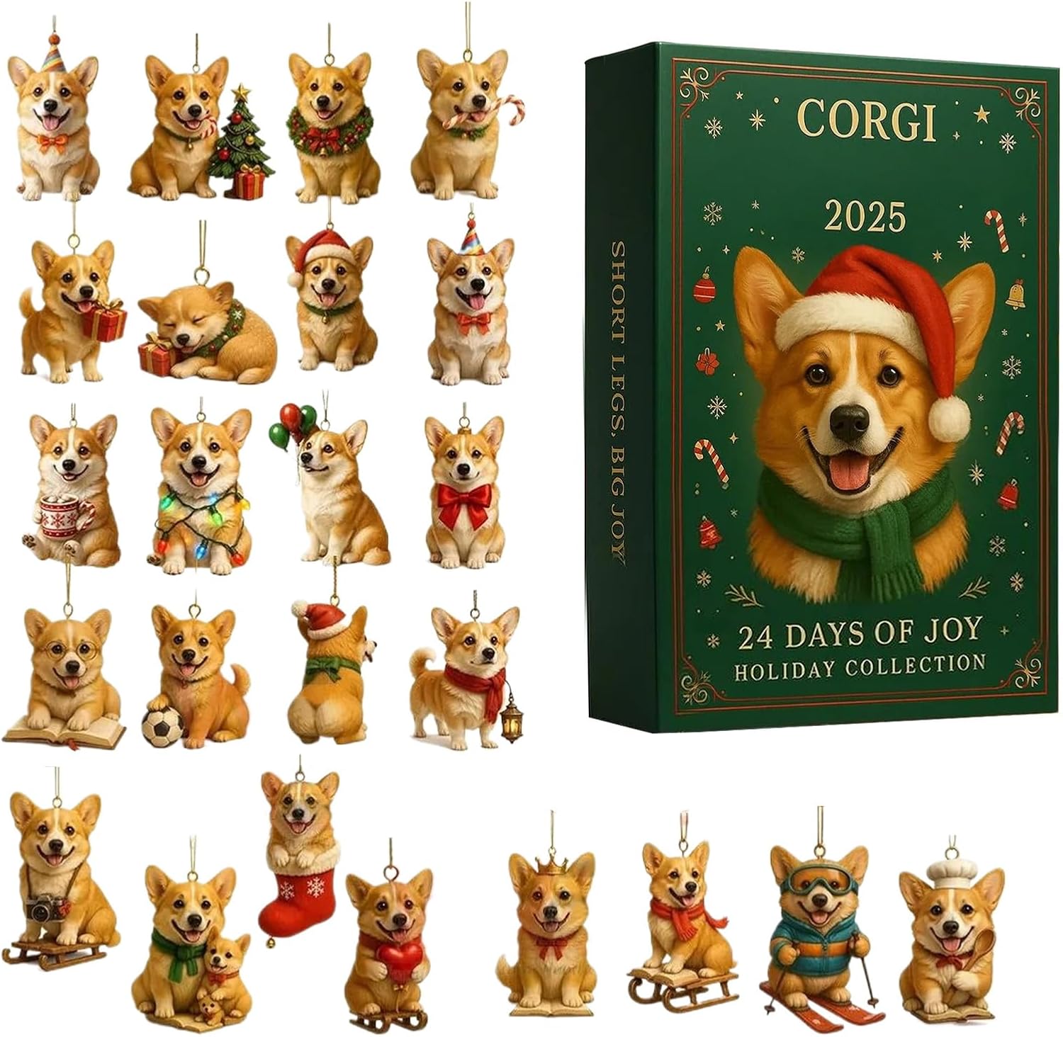 Design da collezione: 24 esclusivi personaggi Corgi vengono sbloccati ogni giorno, creando un'esperienza di vacanza. Dal conto alla rovescia fino alla vigilia di Natale, l'emozione della sorpresa aumenta, invitando sia al collezionismo che all'esplorazione quotidiana. Creazione di scene multiple: i personaggi includono conducenti di slitte e cappelli di Babbo Natale. Possono essere liberamente combinati in decorazioni pendenti per aggiungere un tocco carino e festoso a qualsiasi casa o auto. Presentazione visiva: realizzate in acrilico addensato, le superfici sono lisce e resistenti all'ingiallimento, garantendo colori vivaci e una finitura impeccabile. Comunicazione emotiva: le adorabili figurine del Corgi evocano ricordi caldi e sono perfette per gli amanti degli animali come regalo personale o come regalo sociale premuroso per rafforzare i legami. Estetica portatile: la confezione regalo piatta e leggera è facile da riporre o esporre, perfetta per librerie, davanzali e altri spazi, creando una decorazione festosa.