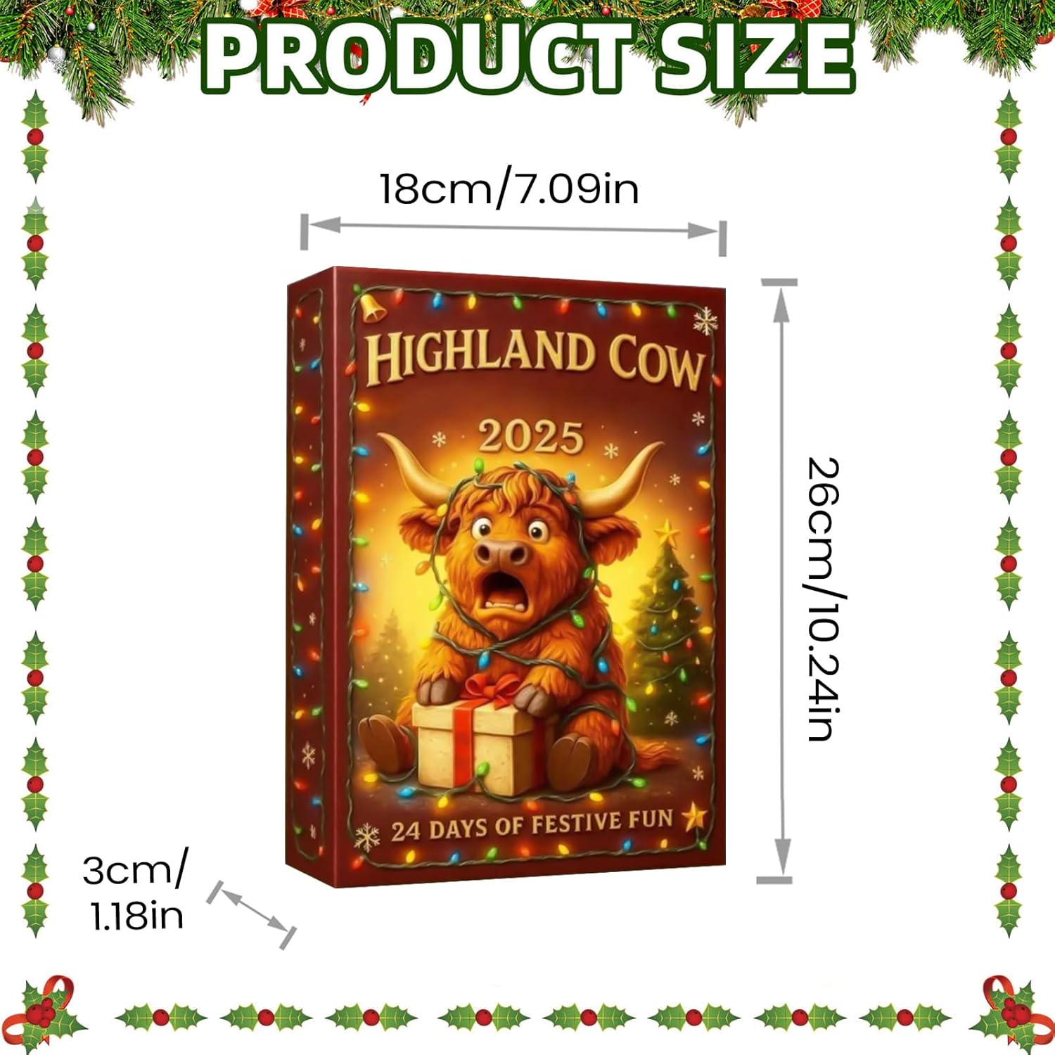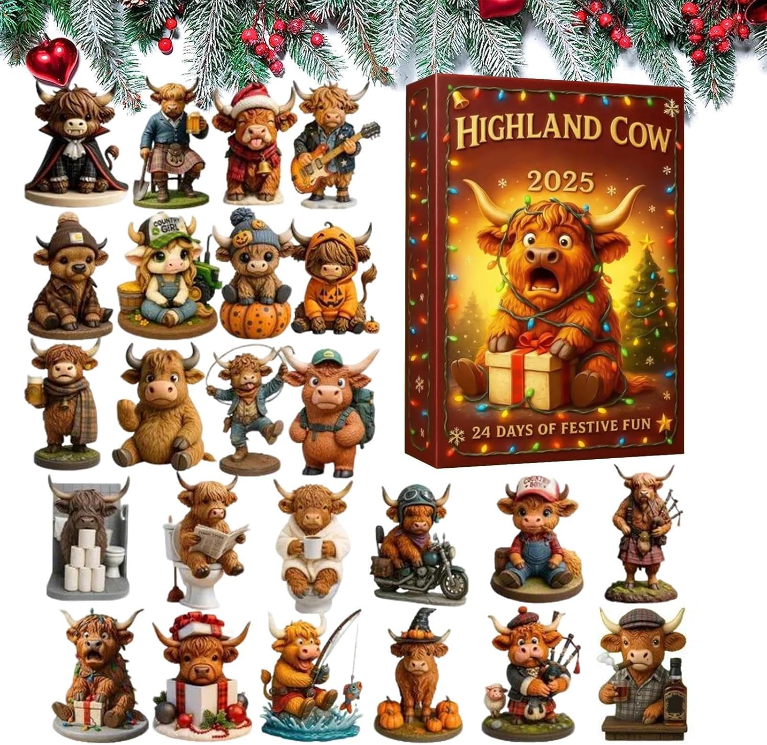 24 disegni a tema: questo calendario dell'Avvento di Natale presenta 24 disegni diversi con costumi giocosi che fungono da accessori decorativi da parete e soddisfano la gioia del collezionismo. Si adatta con flessibilità a diversi stili di arredamento e diffonde un'atmosfera calda e festosa nei vostri spazi abitativi durante le feste di Natale. Ideale per decorare salotti o altre aree, crea un'atmosfera accogliente e soddisfa la passione per il collezionismo. Facile da installare: il design minimalista 2D del calendario dell'Avvento offre un aspetto dinamico e mostra scene decorative multistrato che arricchiscono la decorazione natalizia e creano un'atmosfera festosa. Grazie al formato sospeso verticale, offre opzioni di posizionamento versatili e si adatta perfettamente agli angoli o alle aree di raccolta centrali, rendendolo ideale per le festività natalizie e consentendo un facile montaggio. Atmosfera festosa preservata: questo calendario dell'Avvento 2025 presenta una struttura in acrilico combinata con tonalità resistenti al colore che gli consentono di mantenere il suo fascino nel corso degli anni e di fungere da prezioso pezzo decorativo durante il periodo natalizio. Senza aggiungere volume o peso extra al tuo spazio espositivo, aggiungerà un'allegria natalizia duratura al tuo spazio e potrà essere facilmente posizionato in diverse aree. Applicabilità versatile: il calendario dell'Avvento di Natale enfatizza un adorabile tema di mucca dell'altopiano che combina la fusione di elementi festivi con allegre combinazioni di abbigliamento per aumentare lo stile artistico. Realizzato per adattarsi a diversi stili domestici, arricchirà le tue decorazioni natalizie e promuoverà un'atmosfera allegra durante le riunioni di famiglia e gli scambi di regali durante la stagione dell'Avvento. Divertimento natalizio interattivo: progettato con il motivo della mucca delle Highland e dettagli in costume festivo, questo calendario dell'Avvento avvicina le famiglie attraverso una tradizione interattiva quotidiana. Esalta lo spirito natalizio e crea ricordi indimenticabili mentre ti godi il conto alla rovescia fino al giorno di Natale e vivi insieme la gioia delle vacanze, rendendo l'Avvento un'esperienza vibrante e di legame per tutta la famiglia.