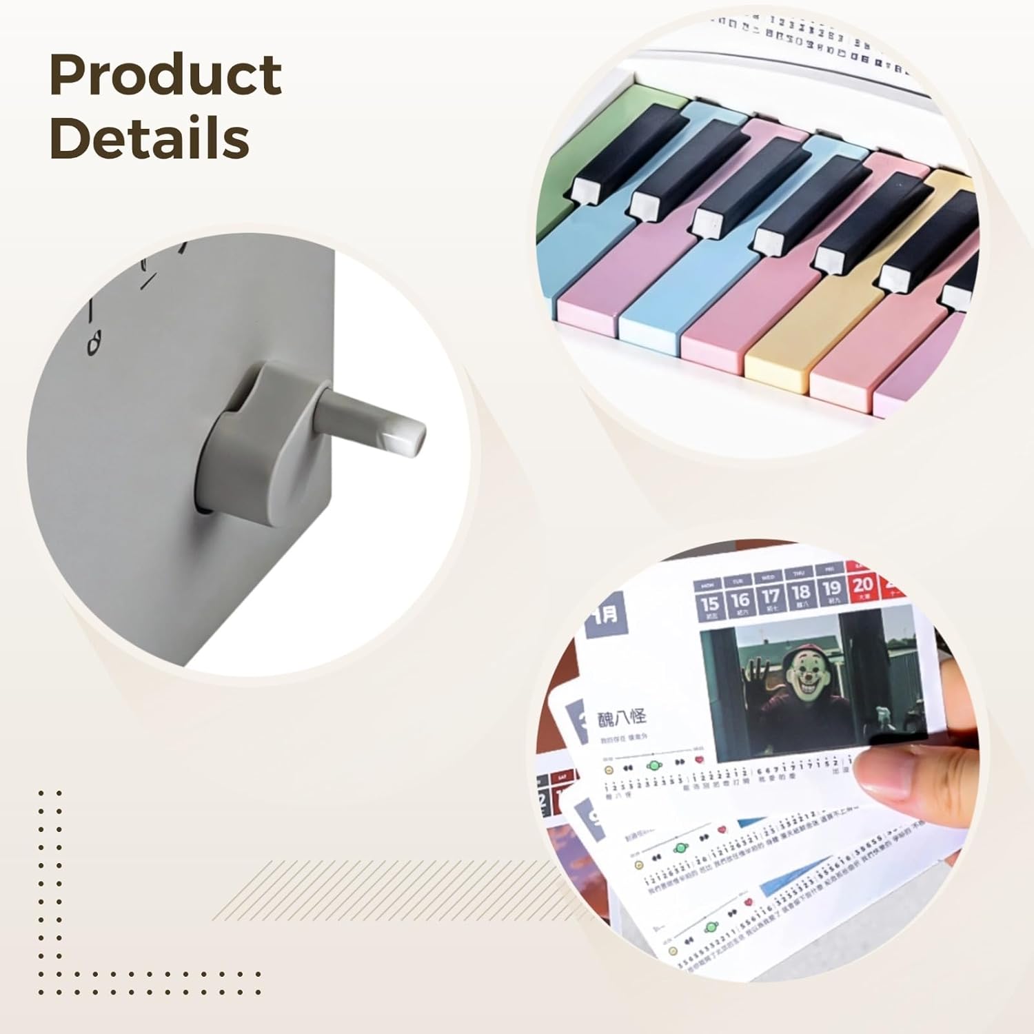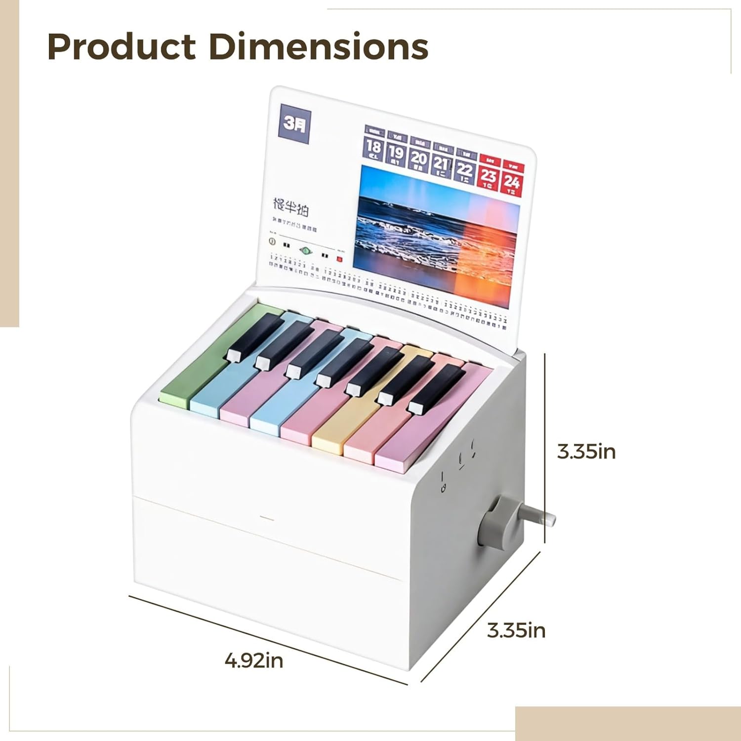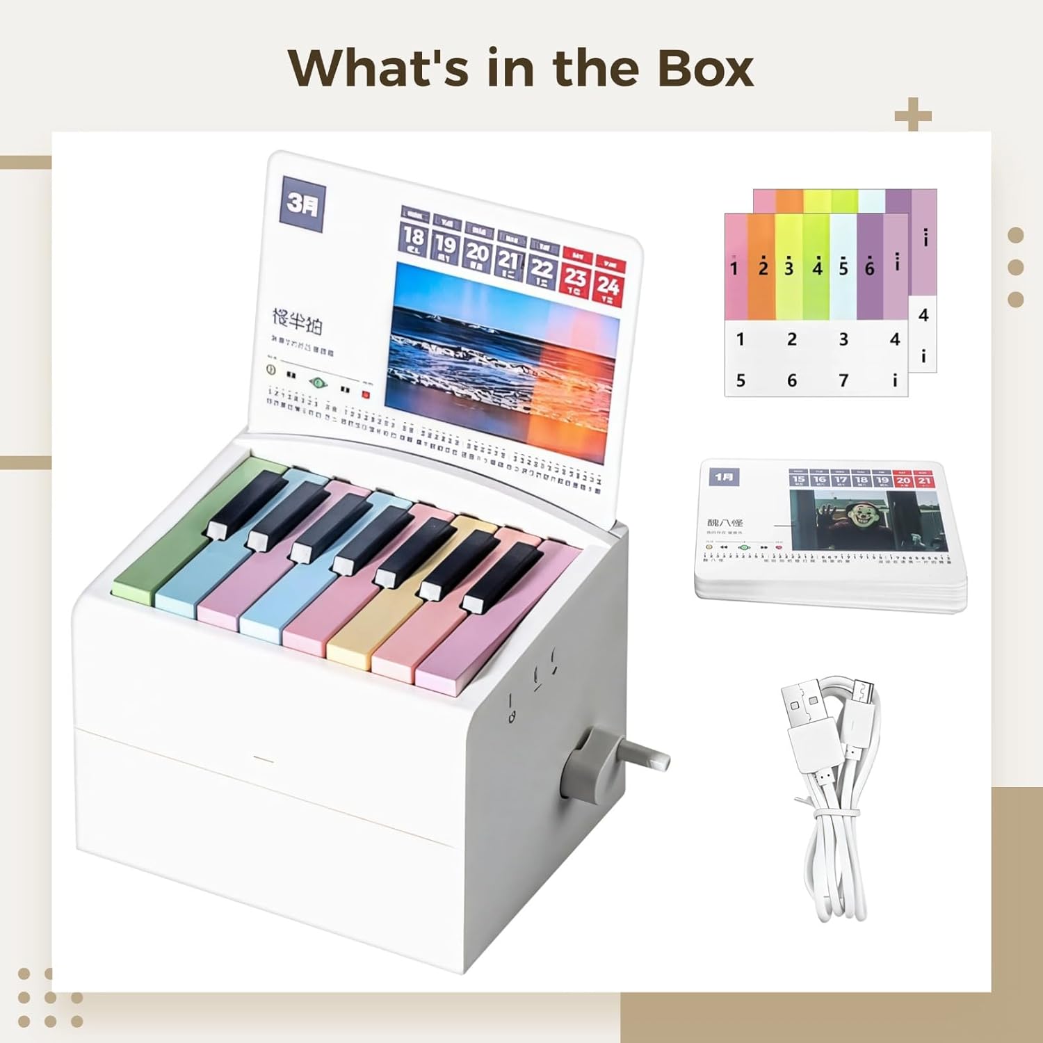 Divertente musica interattiva: goditi le note musicali quotidiane con tasti di pianoforte integrati e cinquantadue canzoni popolari; il design compatto (12,4 x 8,4 x 8,4 cm) aggiunge un tocco unico a qualsiasi scrivania Anno della musica: goditi cinquantadue canzoni famose durante tutto l'anno; notazione semplificata per facilitare l'apprendimento; per chi non conosce il pianoforte mentre segna i giorni Audio professionale: ascolta un suono di alta qualità con tasti reattivi; solida struttura in plastica per un uso duraturo; ideale per la pratica quotidiana Semplice e chiaro: progettato per un facile gioco con tasti visibili e spartiti leggibili; include basi di teoria musicale; accessibile per musicisti a tutti i livelli Regalo degno: viene fornito in una bella confezione con un manuale facile da seguire; vano batteria per un uso rapido; una divertente sorpresa musicale per ogni occasione