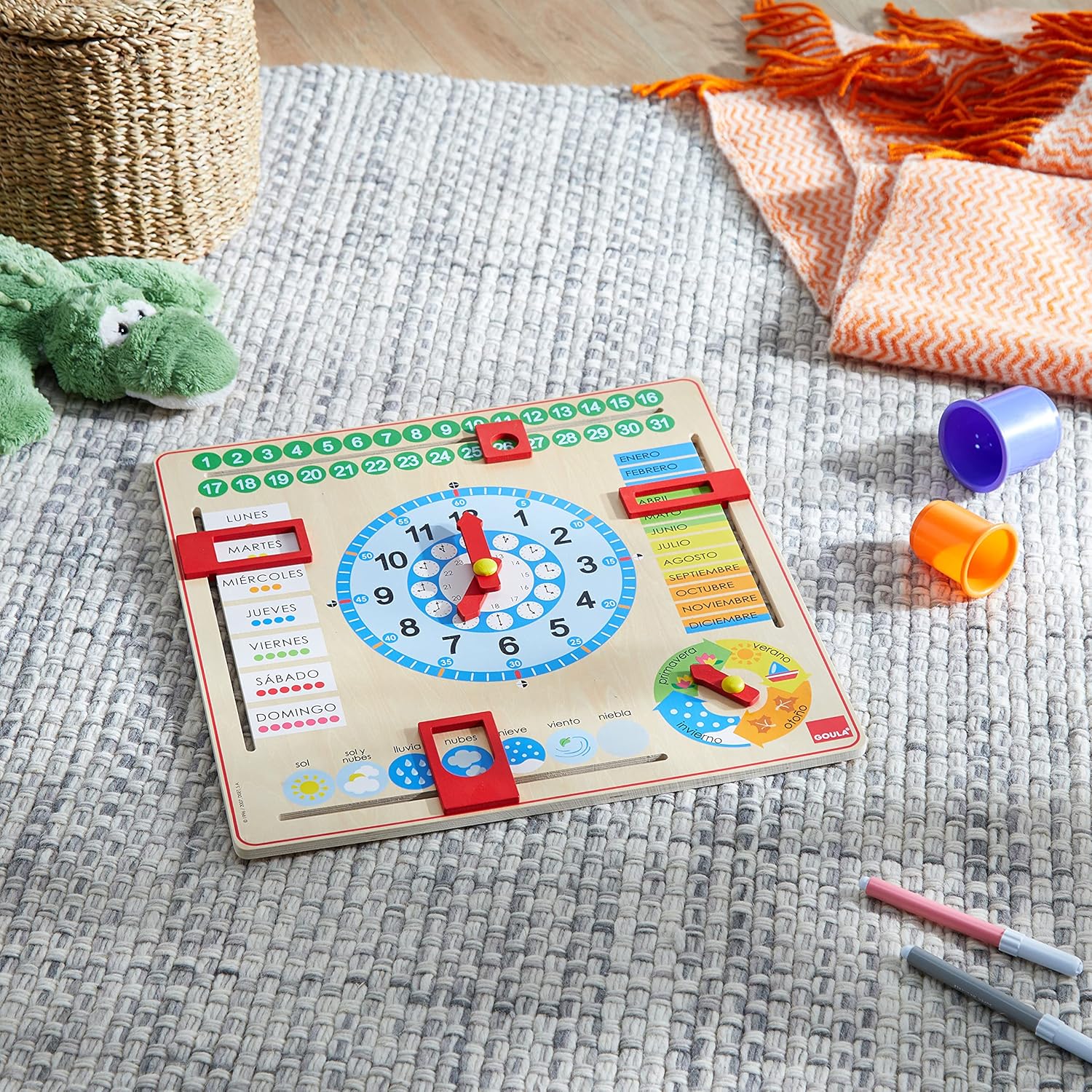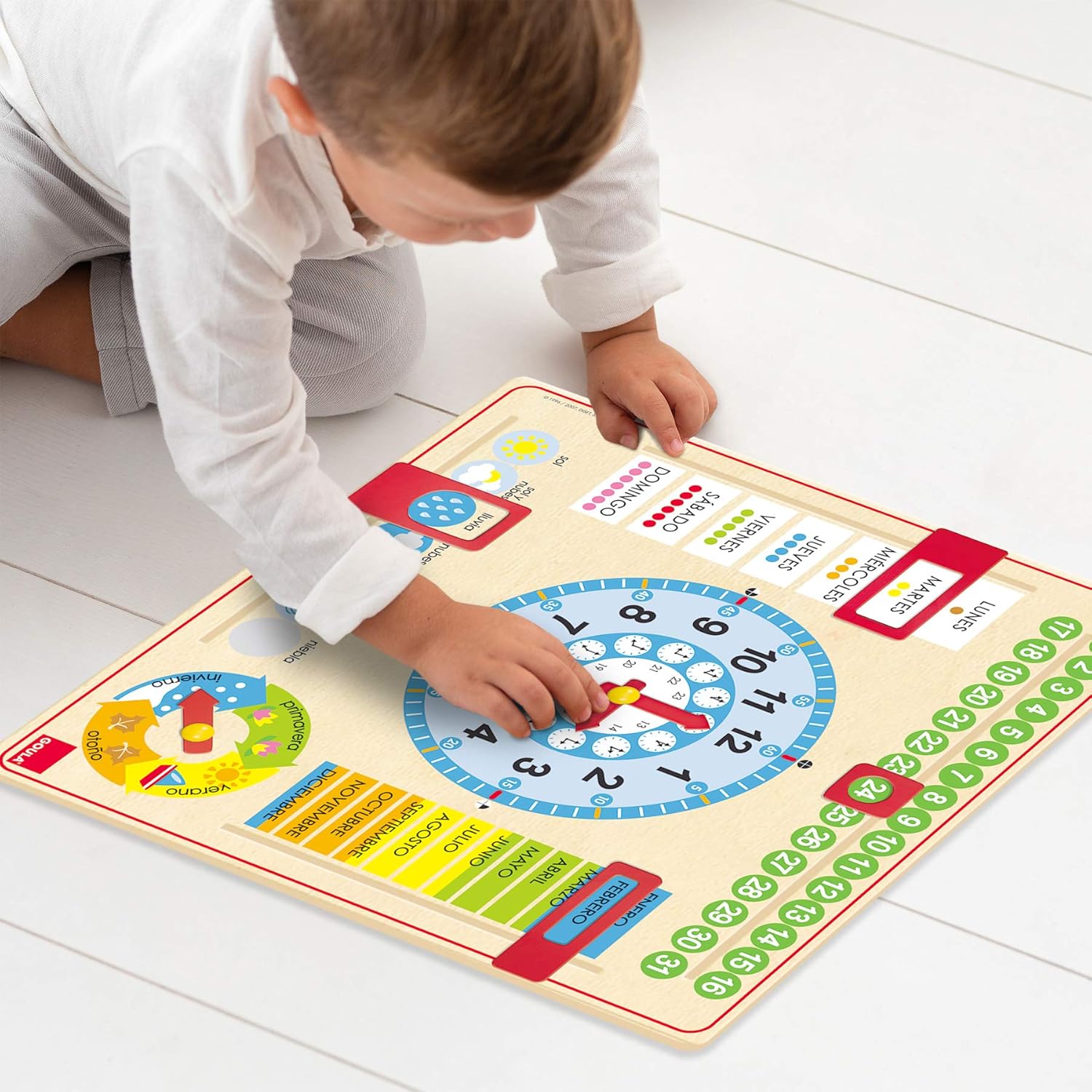 Il primo orologio calendario di grande formato per consentire ai più piccoli di apprendere diversi argomenti legati al tempo Giocattolo molto educativo che inizia ad apprendere mesi, stagioni, ora, giorni, ore e minuti Il gioco è composto da un sistema di gettoni mobili non rimovibili per prevenirne la perdita Abilità sviluppate: apprendimento di diversi argomenti legati al tempo