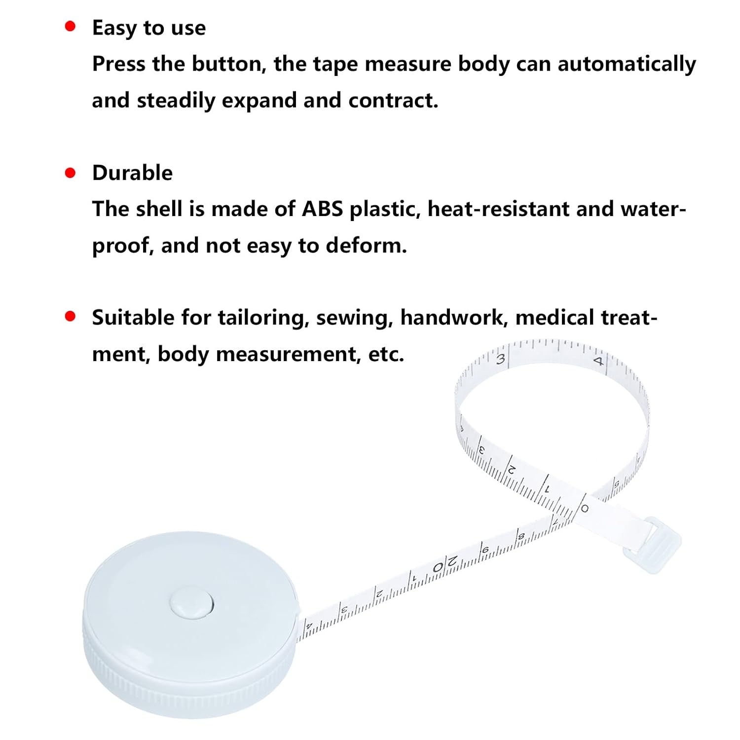 Design retrattile: sul metro a nastro retrattile è presente un piccolo pulsante e il metro a nastro può essere ritirato automaticamente e senza problemi con un solo tocco. Il metro a nastro morbido è piccolo, facile da trasportare e misurare e i dati di misurazione sono facili da leggere. Scala a doppia faccia: il metro a nastro morbido retrattile ha scale su entrambi i lati, una macchina è versatile, un lato è in centimetri, l'altro lato è in pollici, scale diverse possono soddisfare le diverse esigenze. Ampia gamma di applicazioni: il metro a nastro colorato e compatto è ampiamente utilizzato nelle case e nei negozi. Il mini metro a nastro artigianale è adatto per sartoria, cucito, artigianato, misurazione della vita, ecc. Ed è un buon aiuto per i sarti. Guscio in ABS: il guscio del metro a nastro morbido per uso domestico è realizzato in materiale plastico ABS, che è resistente alla trazione, resistente al calore e non facile da deformare. La lunghezza del metro a nastro flessibile in ABS è di 1,5 m, che soddisfa pienamente le tue esigenze di misurazione degli oggetti. Benvenuti nel mio negozio. Per favore non esitate a contattarmi se avete domande. Ti auguro una vita felice!