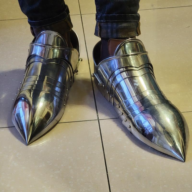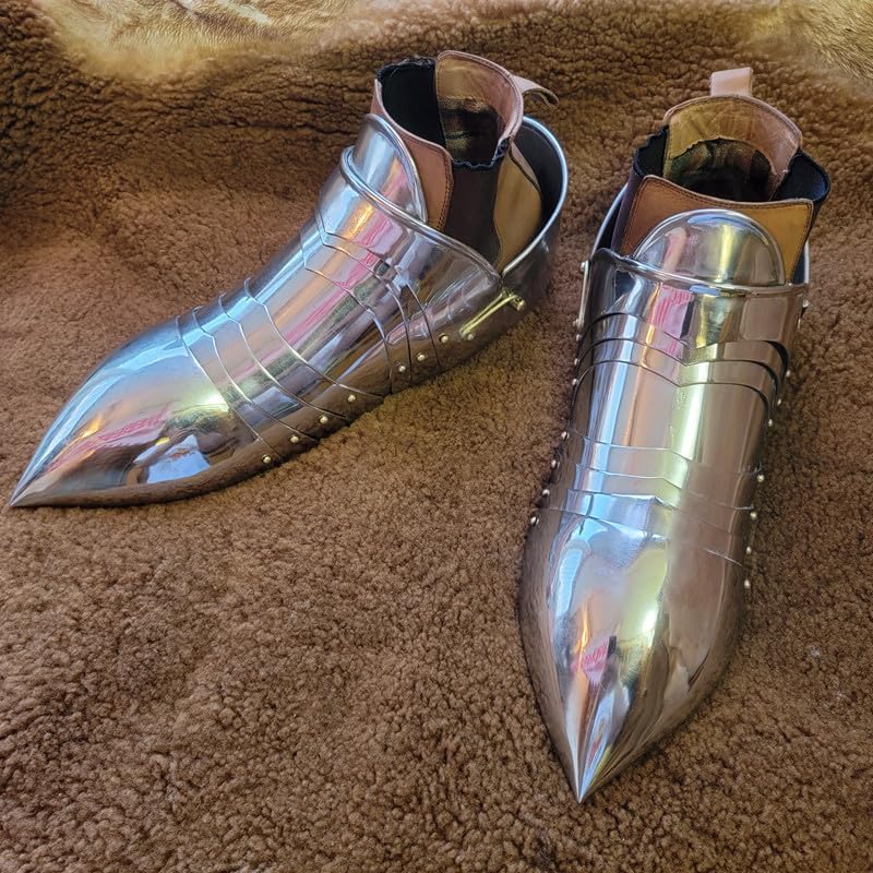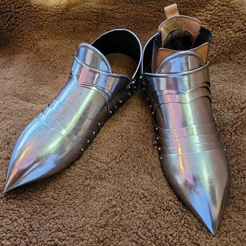 Entra nella storia con i nostri sabatoni da cavaliere medievale gotico europeo - Calzature per armature a piastre completamente indossabili Immergiti nella grandiosità del tardo Medioevo con le nostre solette gotiche storicamente accurate e completamente indossabili. Questi magnifici pezzi di armatura a piastre erano il piede standard dei cavalieri europei nel XV secolo, rinomati per la loro copertura affilata e completa.