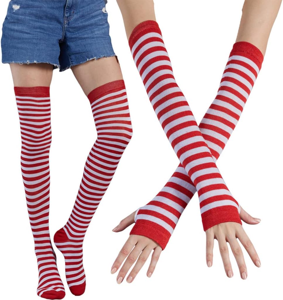 fibra acrilica, morbida e confortevole, progettata con multicolore per attirare l'attenzione degli altri. Calze: possono essere allungate sopra le ginocchia. Si adattano meravigliosamente senza spremere, hanno un elastico nella parte superiore per evitare che cadano. Guanti: per una maggiore elasticità e raggiungere fino al gomito, senza dita e foro per il pollice, molto comodi e pratici. Unico colorato con colori sono facili per i tuoi diversi abiti, gonna e vestito e così via. per feste a tema, Halloween, costumi, feste di Natale, Cosplay; il set di accessori arcobaleno può essere messo in risalto durante le feste.