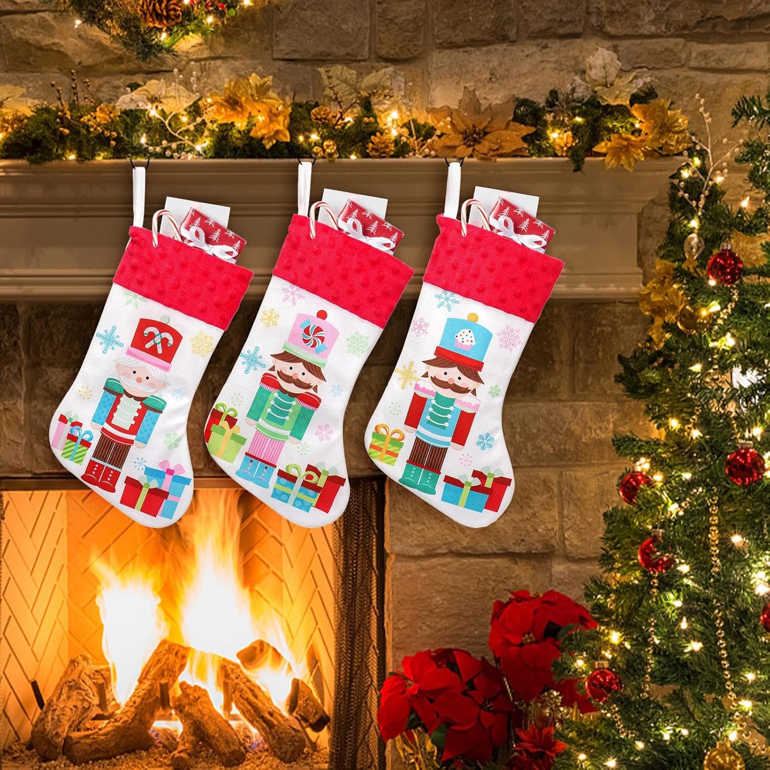 Decorative e funzionali: le calze natalizie hanno un duplice scopo combinando un'affascinante estetica natalizia con un pratico contenitore per le prelibatezze. Completano opzioni espositive versatili come caminetti e alberi, offrendo vantaggi sia decorativi che funzionali. Perfetto per riporre piccoli regali e decorare festosamente la tua casa con un mix di stile e utilità. Longevità e durata: queste calze natalizie per la famiglia sono realizzate in robusto tessuto di velluto che fornisce un'eccezionale resistenza del tessuto per un uso ripetuto durante le festività natalizie e molti anni di celebrazioni festive. Il materiale resiste all'usura e mantiene la sua qualità, quindi le calze possono essere utilizzate in modo affidabile nelle tue tradizioni natalizie senza perdere la durata e portare gioia alle vacanze. Taglie di calze versatili: le calze natalizie per la famiglia offrono una dimensione ottimale per diversi usi. Garantiscono una conservazione efficiente di dolcetti e giocattoli e completano le vostre decorazioni natalizie in modo attraente. Con le loro dimensioni coordinate, sono versatili e arricchiscono ogni celebrazione poiché ospitano dolcetti e giocattoli in modo salvaspazio e allo stesso tempo funzionano come elementi decorativi festosi. Simpatico design dello schiaccianoci: questi calzini natalizi con l'adorabile motivo dello schiaccianoci aggiungeranno immediatamente allegria festosa alla tua casa e miglioreranno lo spirito natalizio con il loro allegro fascino visivo. Come deliziosa decorazione stagionale, arricchiscono l'atmosfera natalizia in ogni stanza e rendono questi calzini natalizi un must per le vacanze. Il design a schiaccianoci delle calze natalizie crea un ambiente accogliente e invitante, ideale per un design tradizionale adatto alle famiglie: questo set di tre grandi calze natalizie incoraggia la condivisione con la famiglia e gli amici ed è ideale per regali di gruppo. Esalta lo spirito festivo e crea commoventi tradizioni natalizie attraverso l'esperienza condivisa di riempire e condividere. Le calze di Natale sono perfette per feste familiari accoglienti e aiutano a creare la magia del periodo natalizio con momenti indimenticabili di gioia e comunità