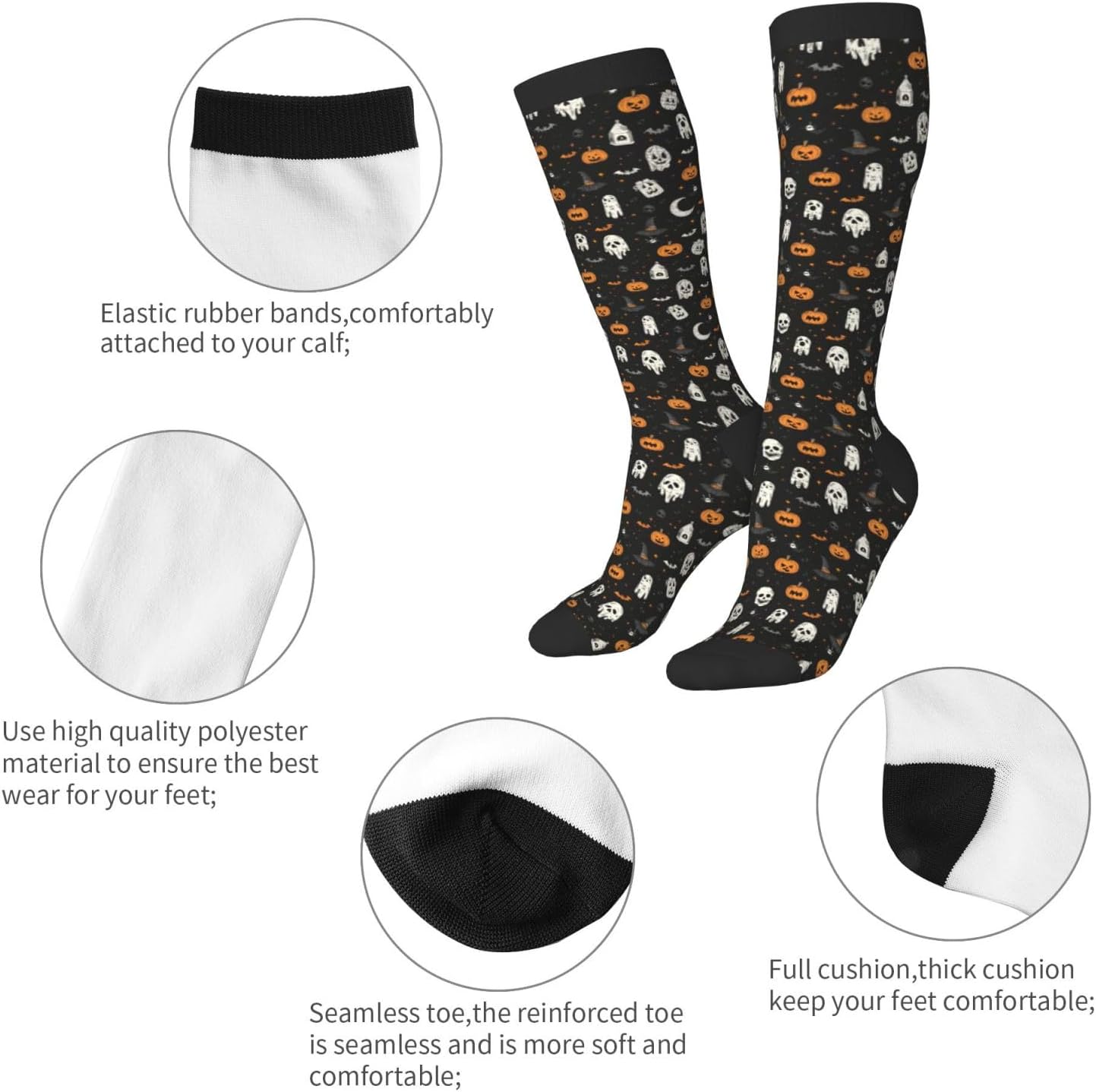 Realizzati in una miscela di 95% poliestere e 5% elastan, questi collant di Halloween Elements per adulti offrono una sensazione confortevole e piacevole al tatto con un'eccellente traspirabilità e proprietà che assorbono l'umidità. Hanno una lunghezza del piede da 8,7 a 11,2 pollici, fornendo una vestibilità ideale con ampia elasticità, assicurando che non ci sia pressione sui tuoi piedi. Adatti sia per l'uso quotidiano che per le attività atletiche, queste calze al ginocchio da donna aggiungono calore e stile a qualsiasi outfit. Il design a blocchi di colore alla moda li rende ideali per le donne e calze sportive di cui le donne possono fare affidamento per la corsa e altri sport. Facile da pulire, basta lavare a mano o in lavatrice delicatamente e appendere per asciugare